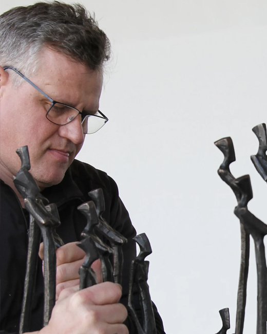 Kallweit is inspired by seemingly disparate cultures; the strength of ancient Egyptian sculptures, the dynamic forms of the modern Cubist movement, and an observation of our contemporary existence. Combined with a considerate approach, Kallweit renders archaic materials, such as blackened oak and bronze, with a palpable sensitivity. These forms are varied tirelessly in his creations. His elongated sculptures depict aspirational human figures in a proud stances that are aesthetically pleasing.