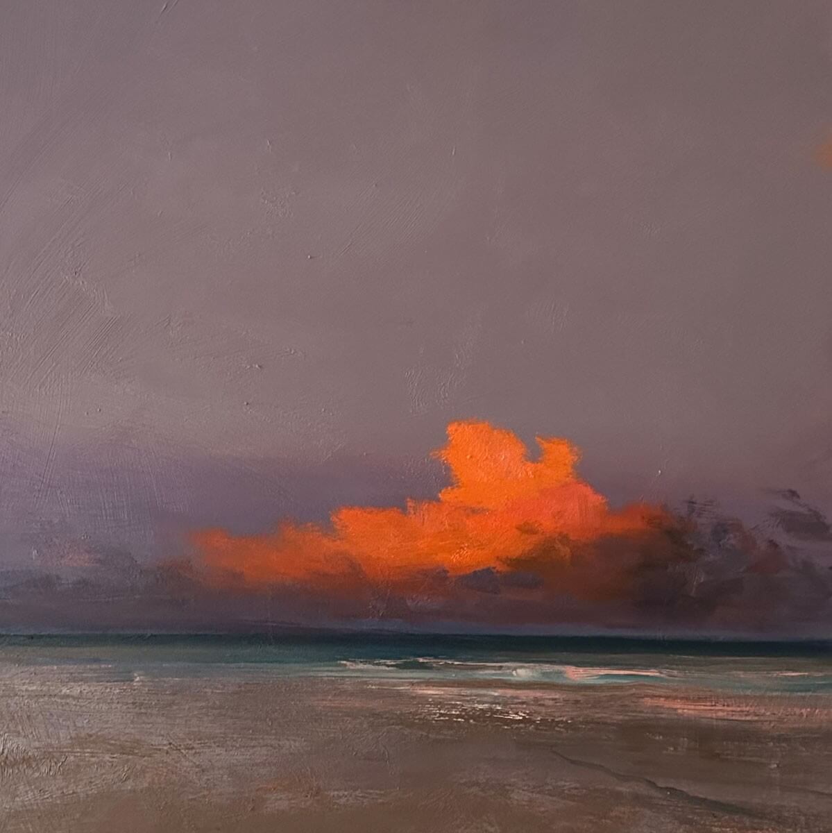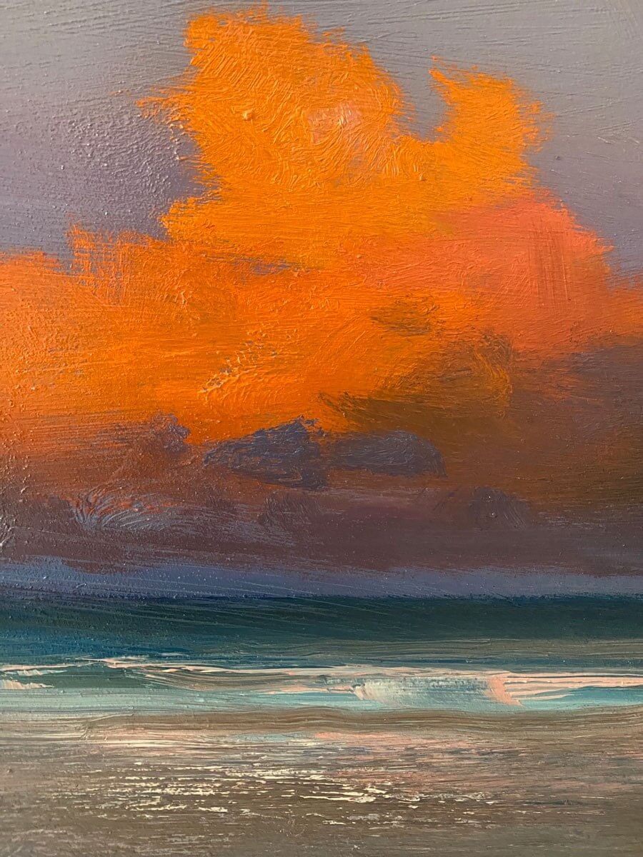 5pm presents an ethereal seascape where the serenity of nature is vividly captured. A dramatic sky unfolds, painted in deep shades of twilight purple and grey. The focal point is a striking, fiery orange cloud, illuminated by the setting sun, which contrasts sharply with the dusky atmosphere.