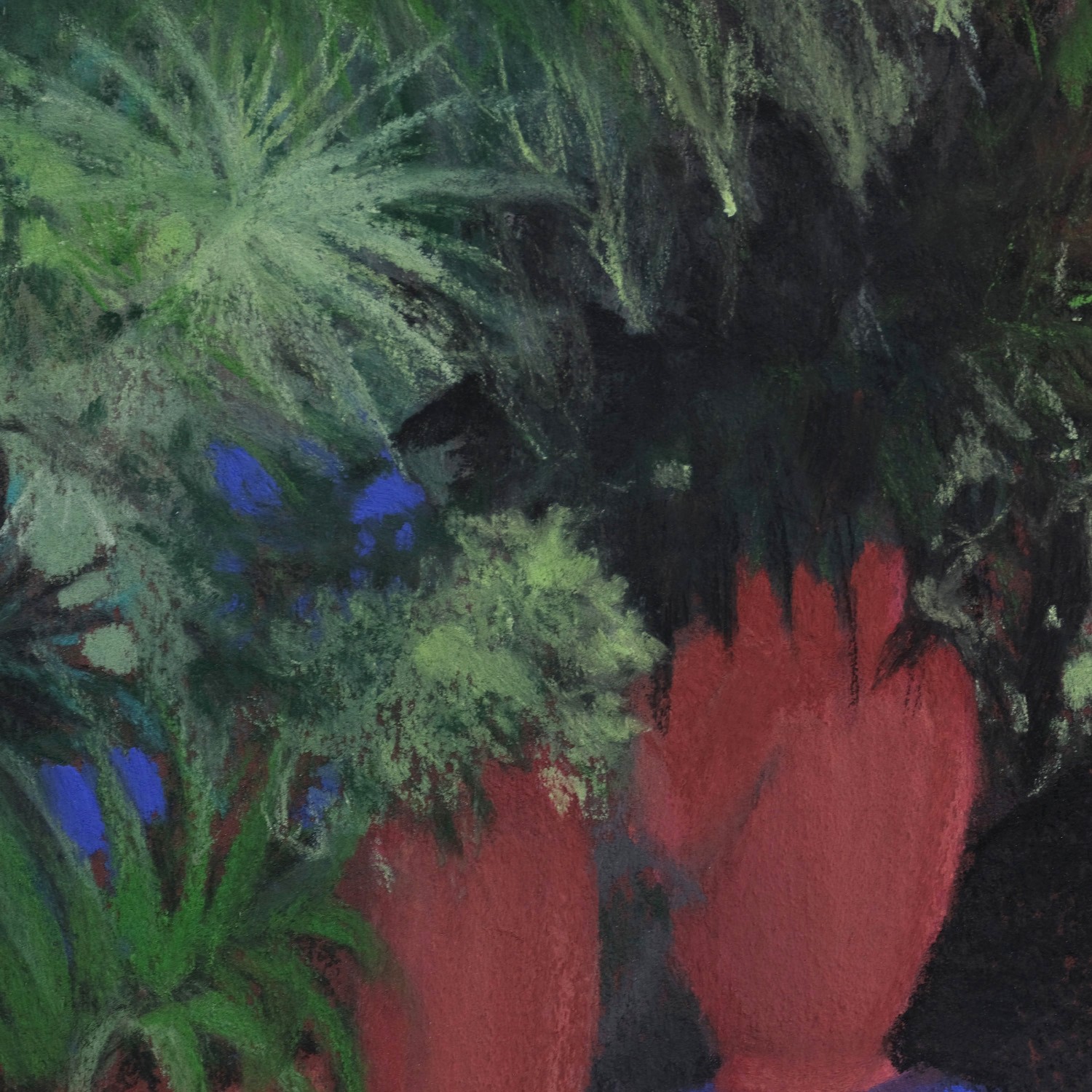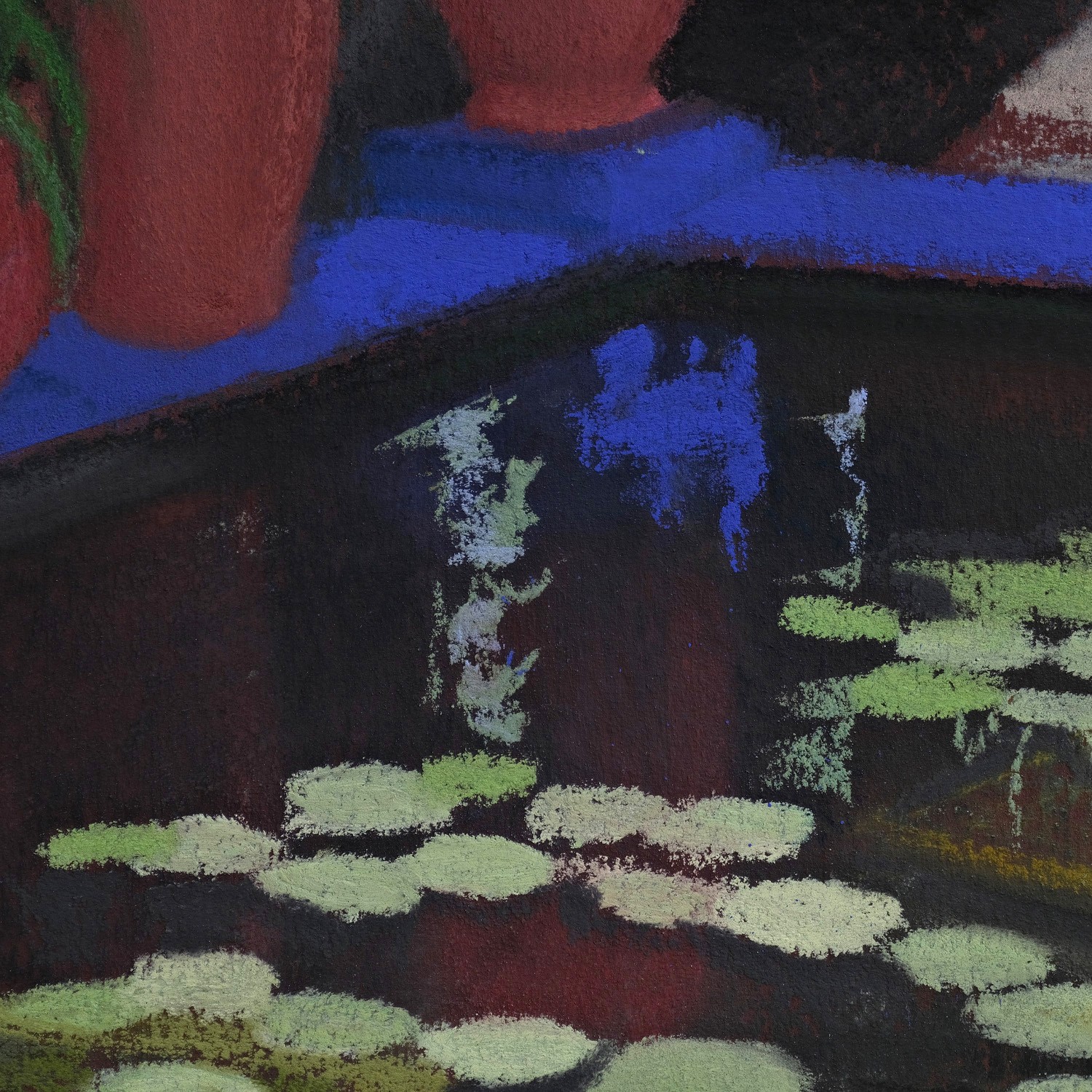 This striking work depicts an exotic garden bathed in bright, vibrant light. Water lilies float delicately on the water’s surface, evoking a sense of serenity and harmony. The red clay pots contrast sublimely with the rich blue color of the surrounding walls, enhancing the picturesque feel of the scene. The lush and varied plants flourish in this setting, creating an enigmatic haven. The bold use of color and geometric shapes gives this composition a captivating dynamism, while remaining rooted in a calming elegance. The play of light and shadow brings an inimitable depth, inviting the viewer to explore every detail with wonder. This painting is a vibrant tribute to natural beauty, capturing a splendor that only a discerning artistic eye can reveal.