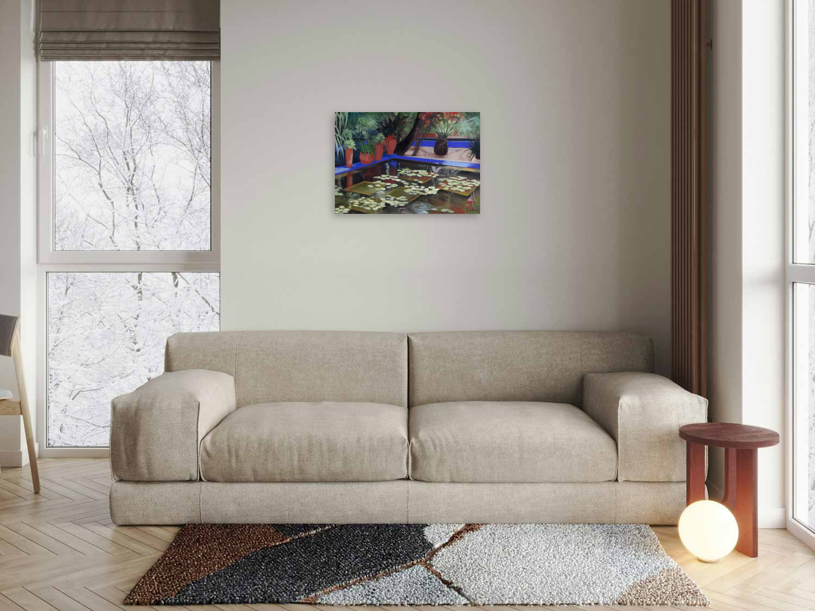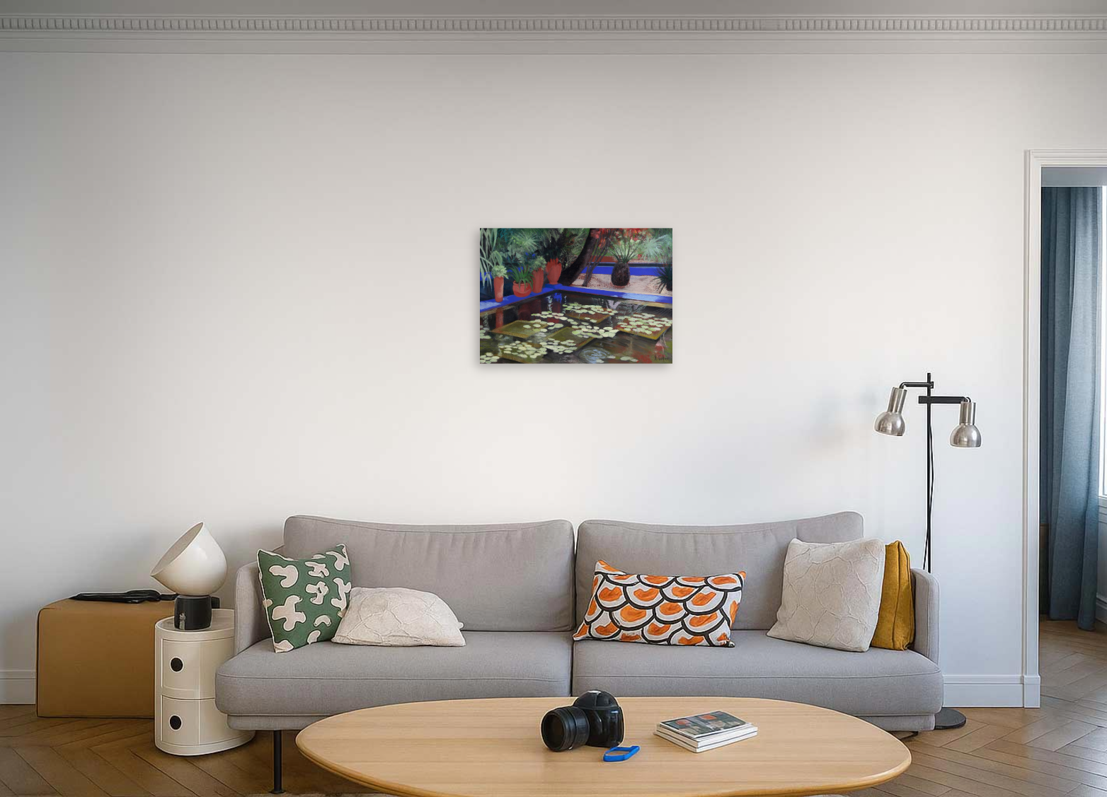 The artwork (Bassin Majorelle III by Agnès Tiollier) is available for pickup at BelArt Gallery in Brussels, Belgium, or it can be delivered to the address of your choice within 2 to 3 weeks after your order is confirmed. The artwork is insured during transportation, so there’s no risk. Origin: Belgium.