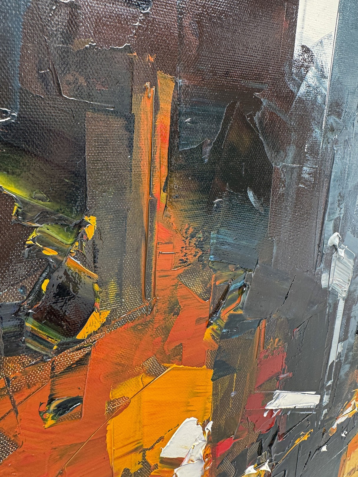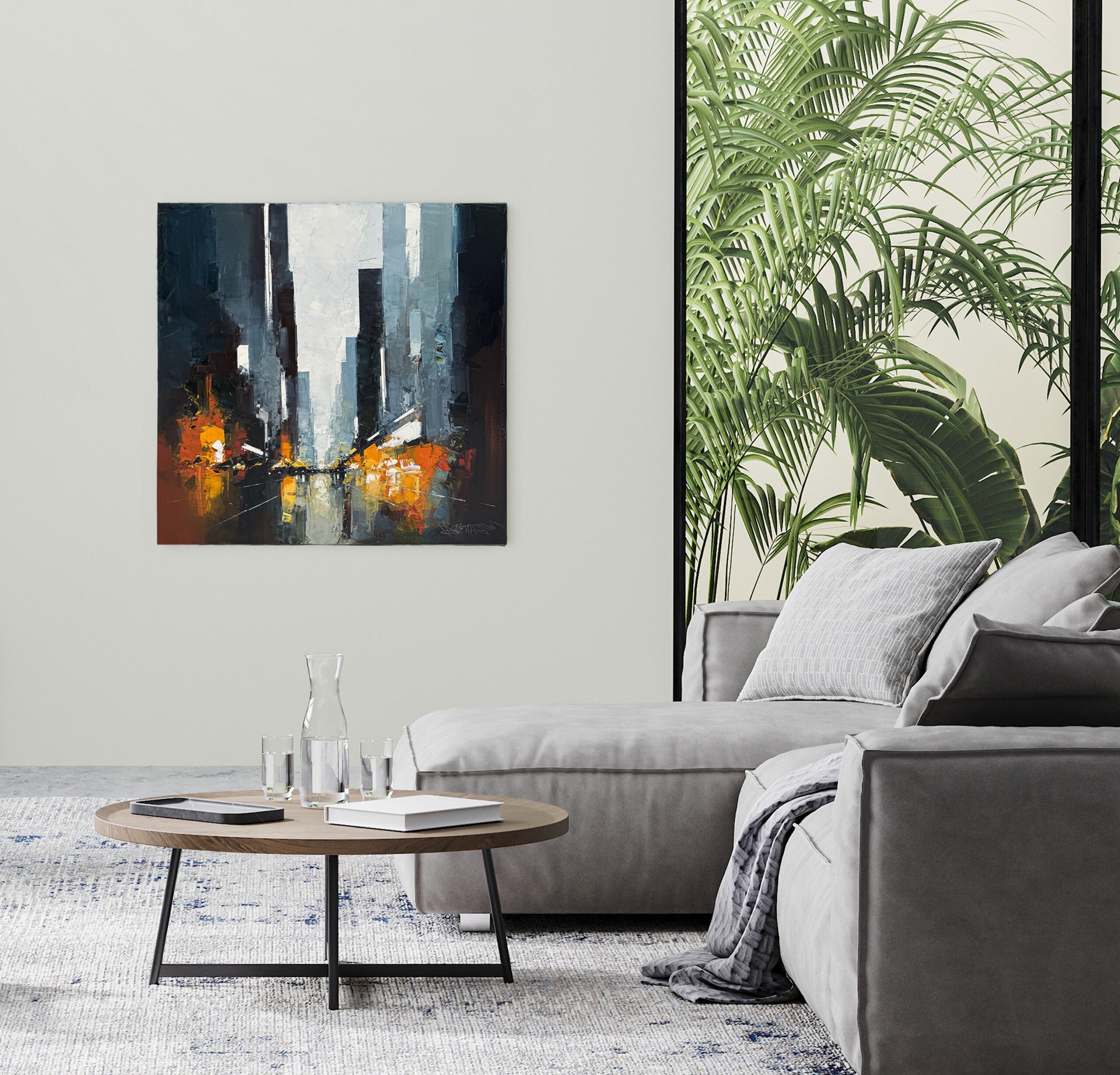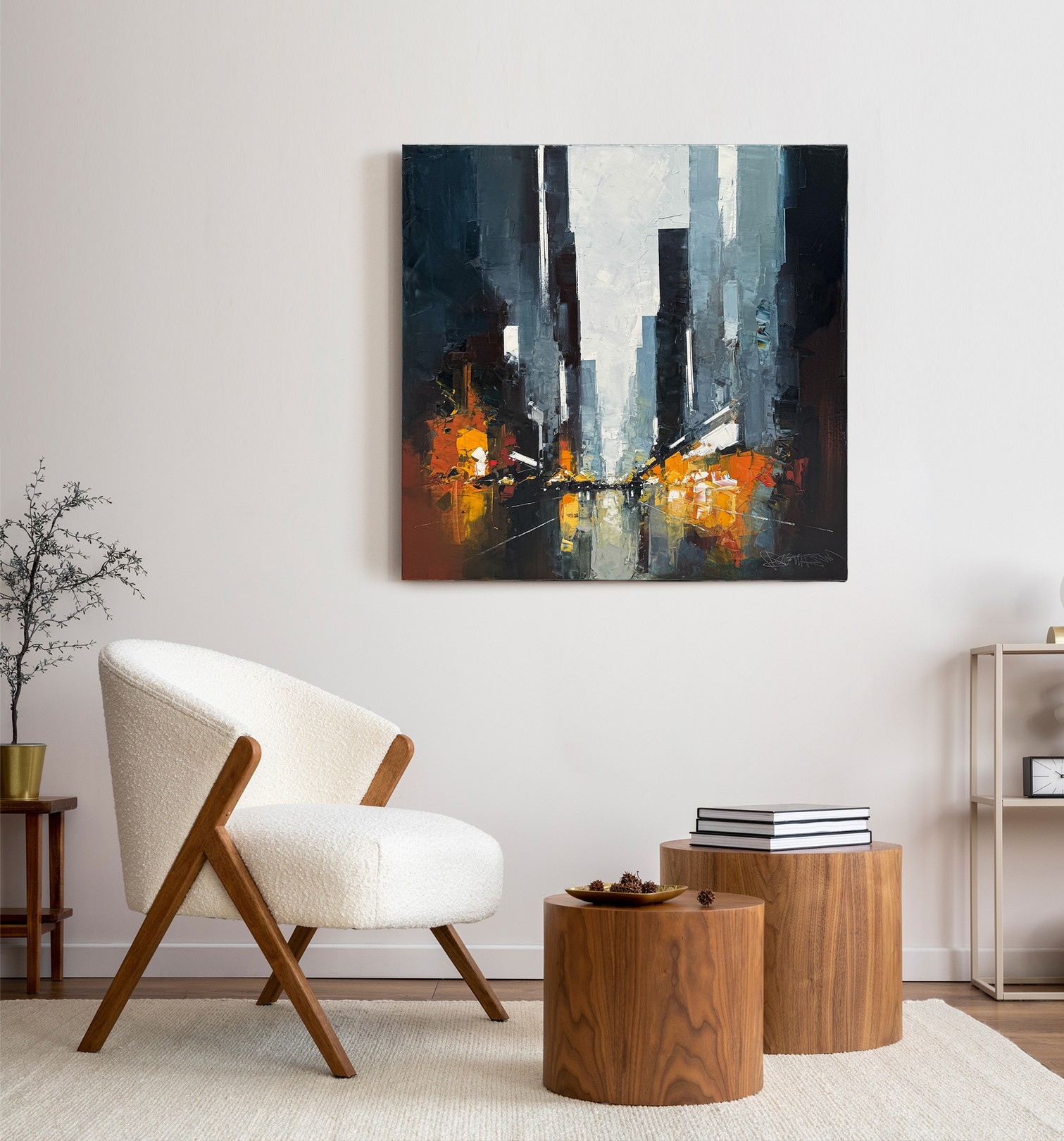 This artwork captures the dynamic energy of a bustling cityscape at night. Bold brushstrokes form towering skyscrapers, creating a striking vertical composition that draws the viewer into the scene. The artist employs a limited yet powerful color palette, using deep blues and grays to evoke the urban environment. Key elements of fiery orange and red punctuate the bottom of the canvas, suggesting the vibrant lights and reflections of city life. These warm tones contrast sharply with the cooler hues, emphasizing movement and vitality. The abstract style skillfully conveys the essence of a city alive with motion, while maintaining a sense of mystery and depth. Unique perspectives and the blurring of details hint at a rainy atmosphere, adding a layer of intrigue. This piece effectively balances abstraction with recognizable forms, making it a compelling and immersive portrayal of urban life.