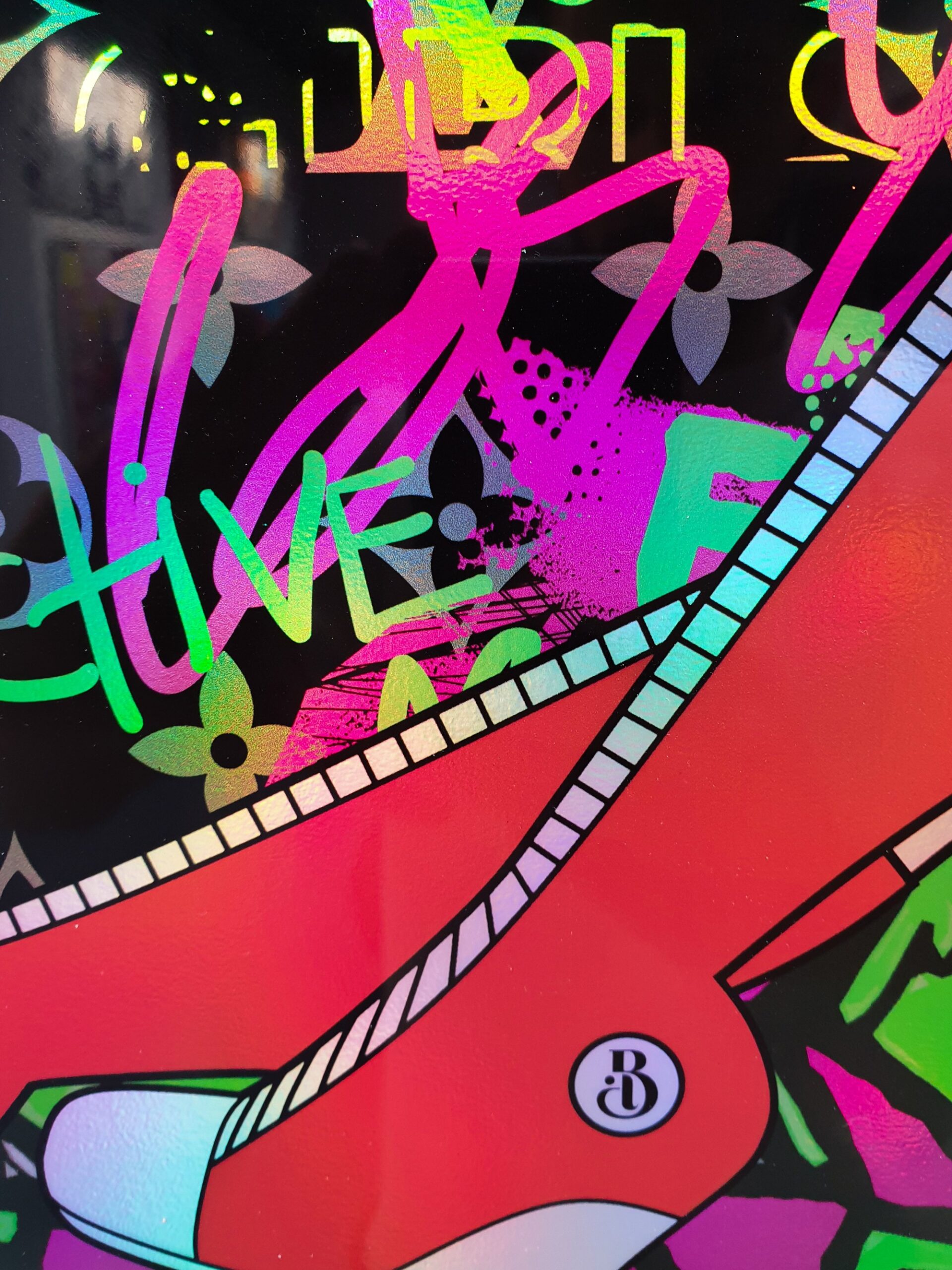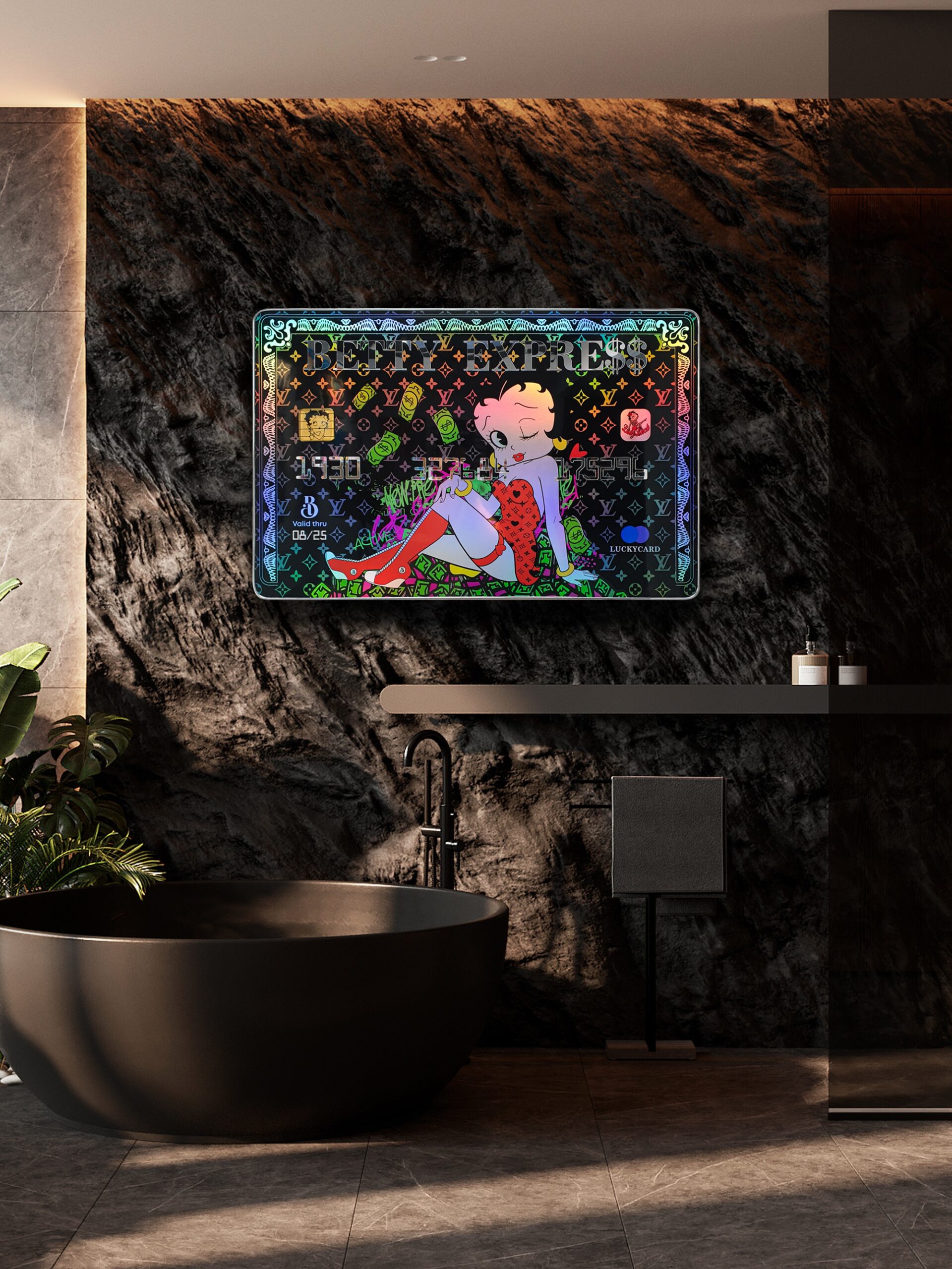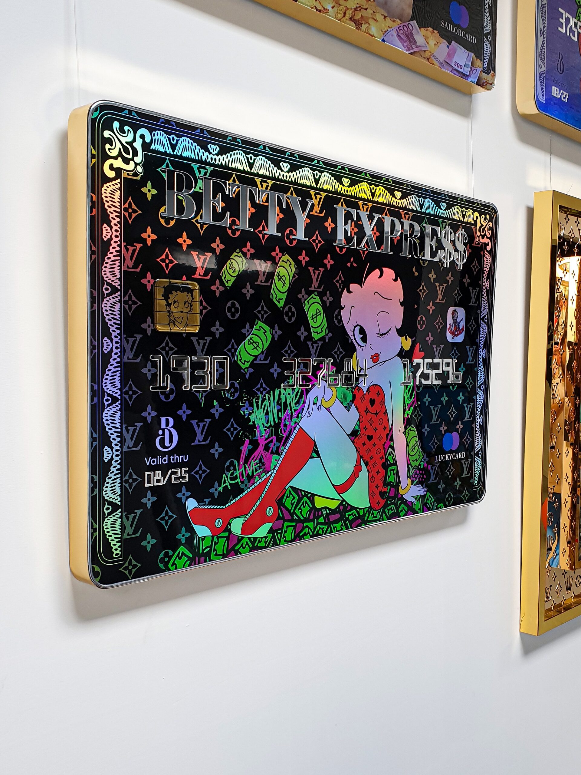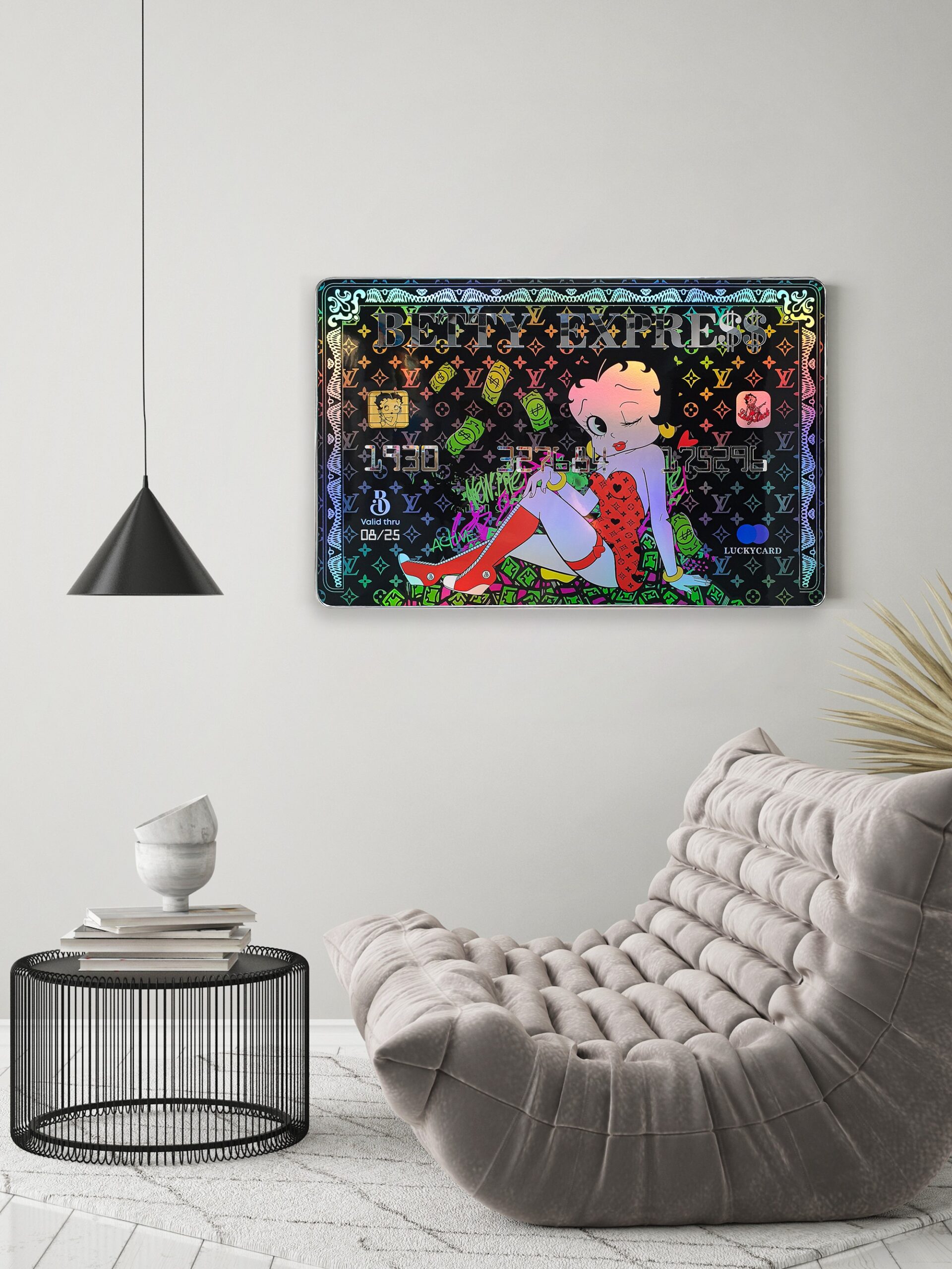 This vibrant artwork features a whimsical rendition of a credit card, transforming an everyday object into a playful piece of pop art. The focal point is a stylized character with a distinctive retro aesthetic, exuding charm and sass. Her outfit—a striking red and black polka-dotted dress paired with knee-high red boots—draws the eye, highlighting her confident pose. The holographic background teems with luxury branding symbols, incorporating elements of consumer culture and fashion into the piece. Dollar signs and playful pastel graffiti add layers of complexity and urban flair, enriching the narrative of commercialism and glamour. Titled “BETTY EXPRE$,” this work uses satire and nostalgia to create a compelling dialogue on identity and societal values, making it both an eye-catching and thought-provoking piece.