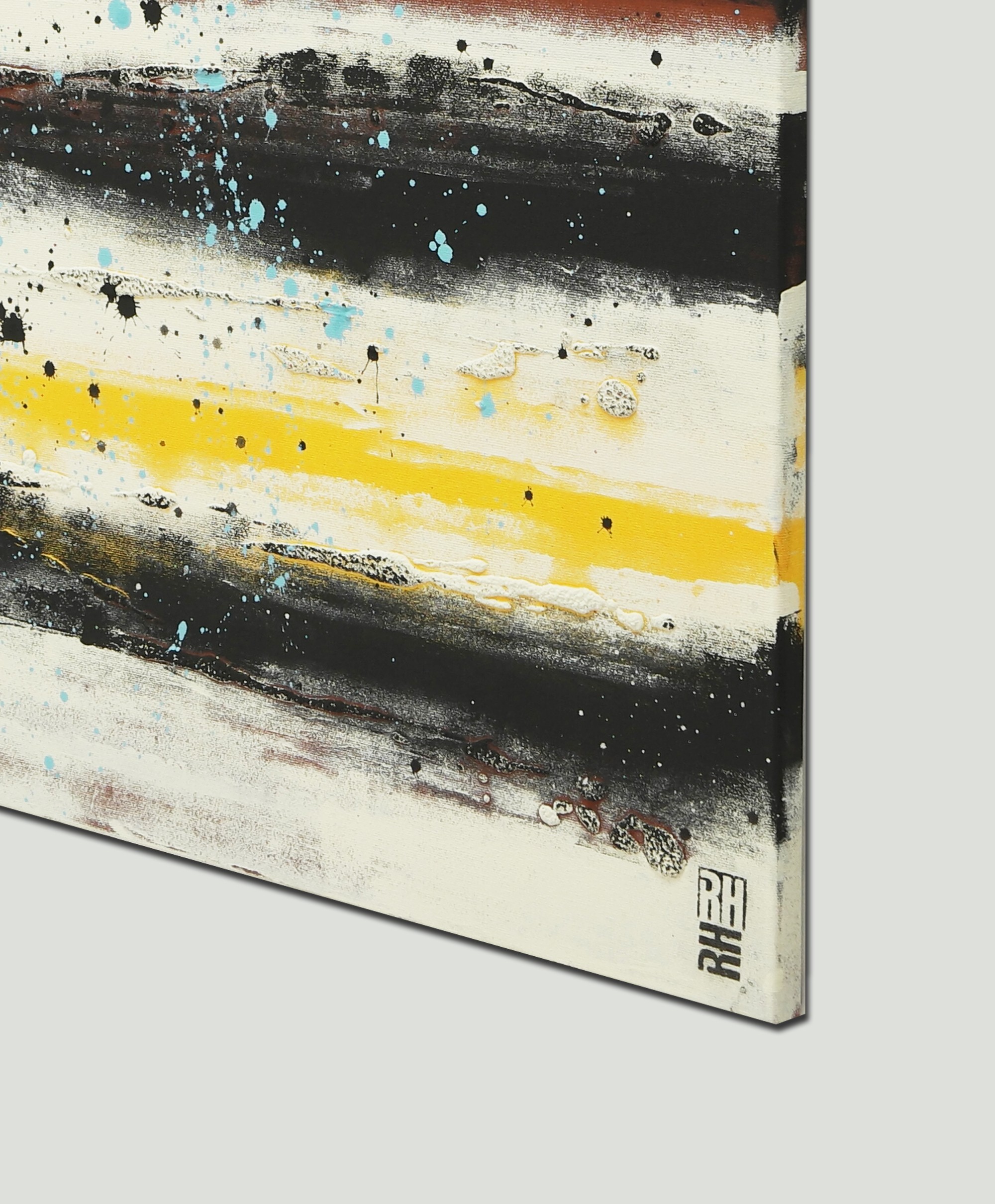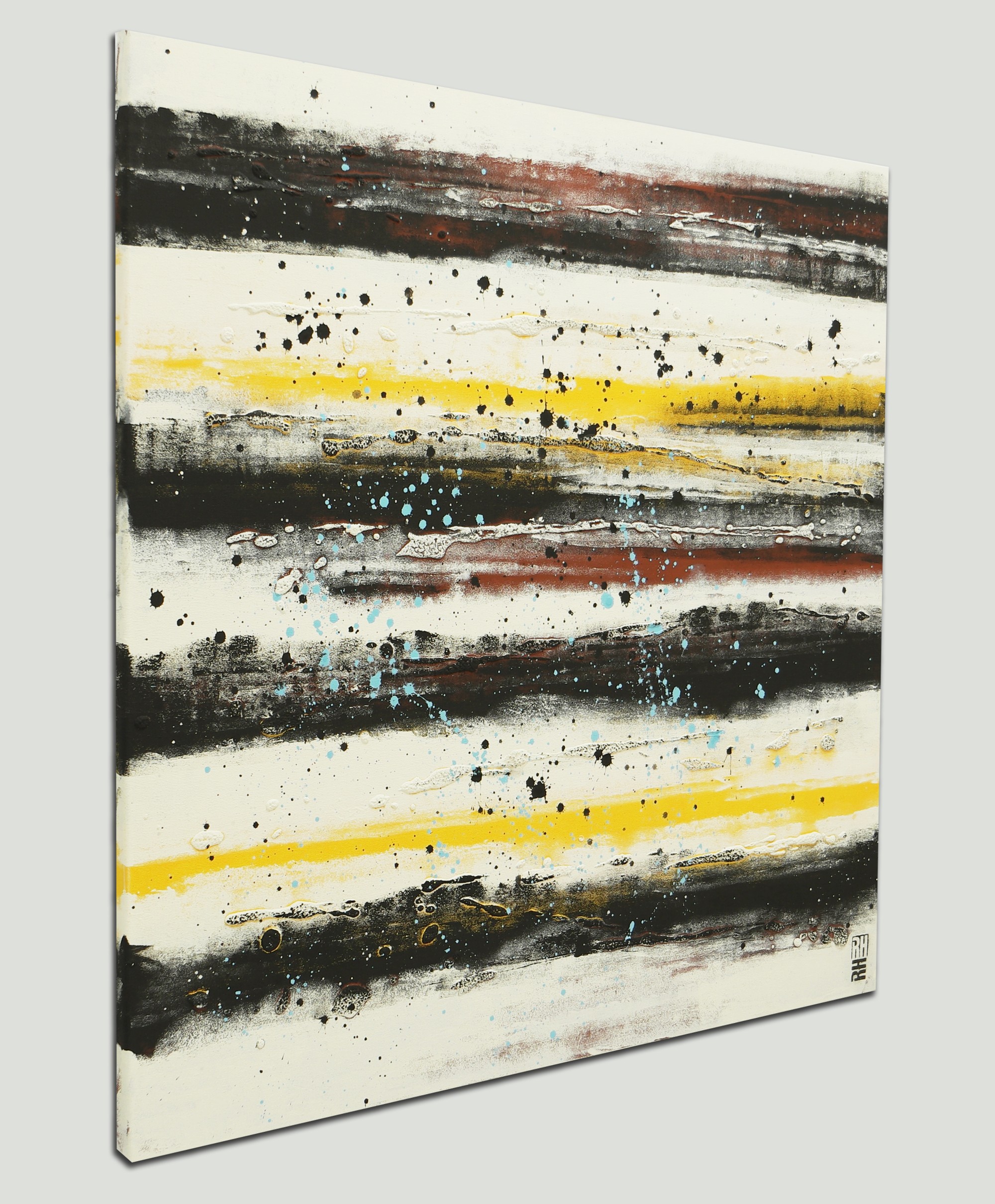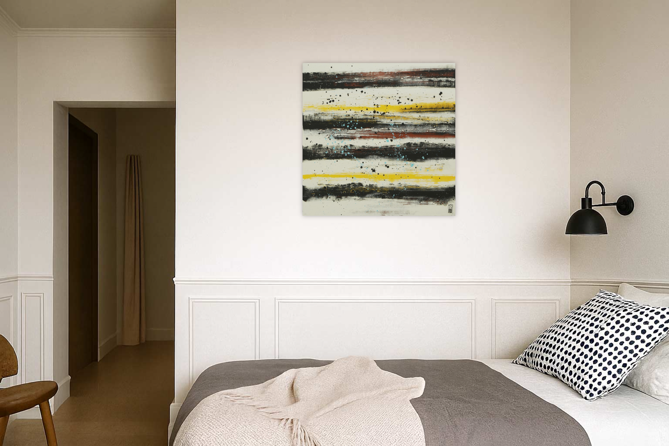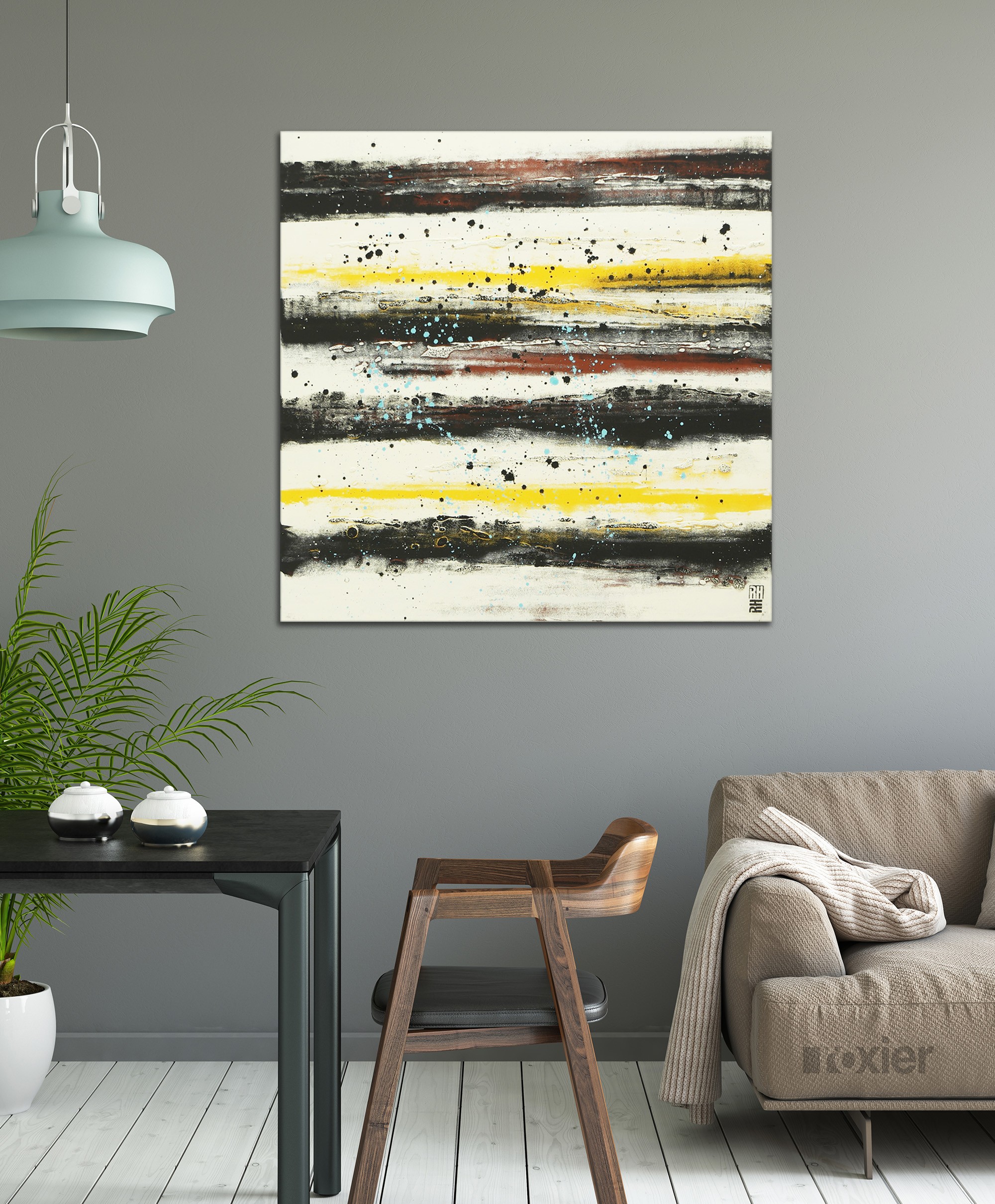 A touch of color to warm up your home. For this painting I have combined a stylish off-white (or pale beige) with dark grey and warm undertones. The light blue splatters bring a playful twist.