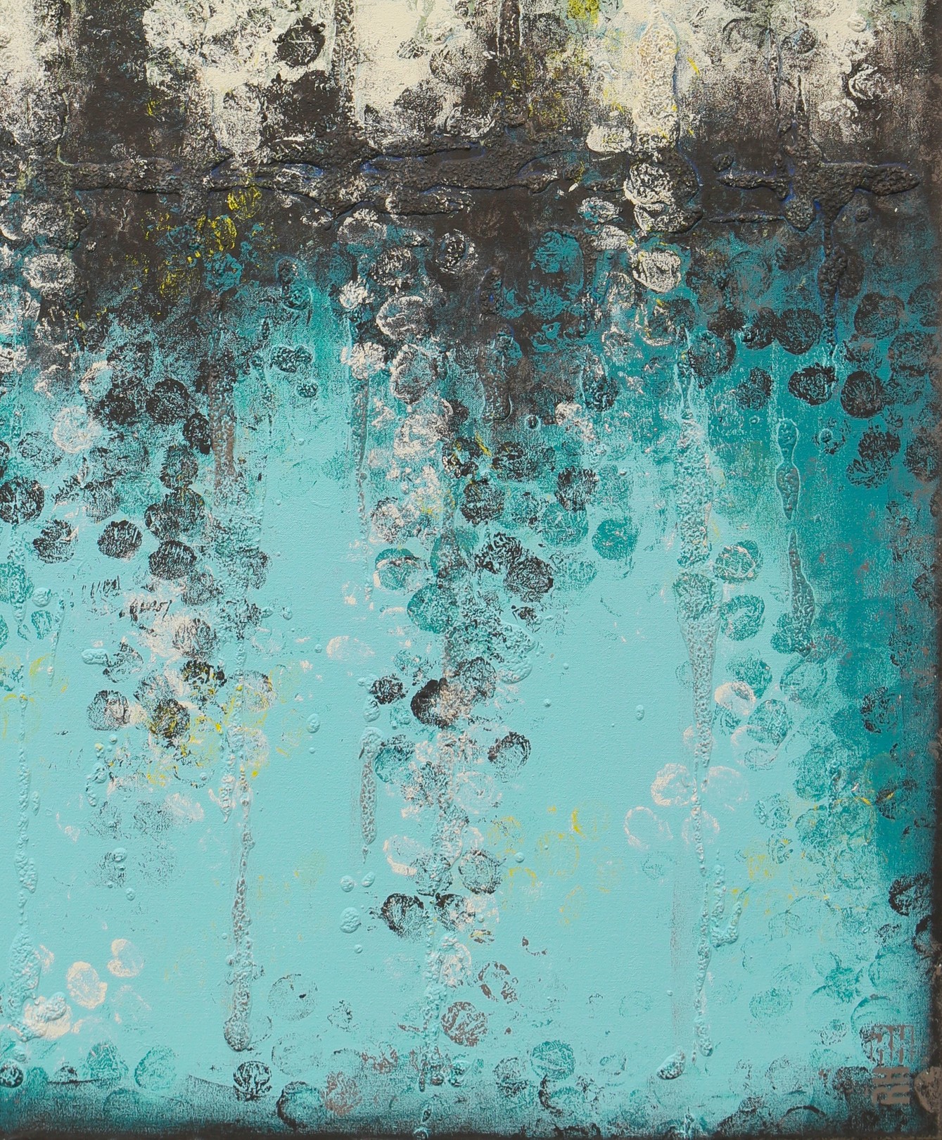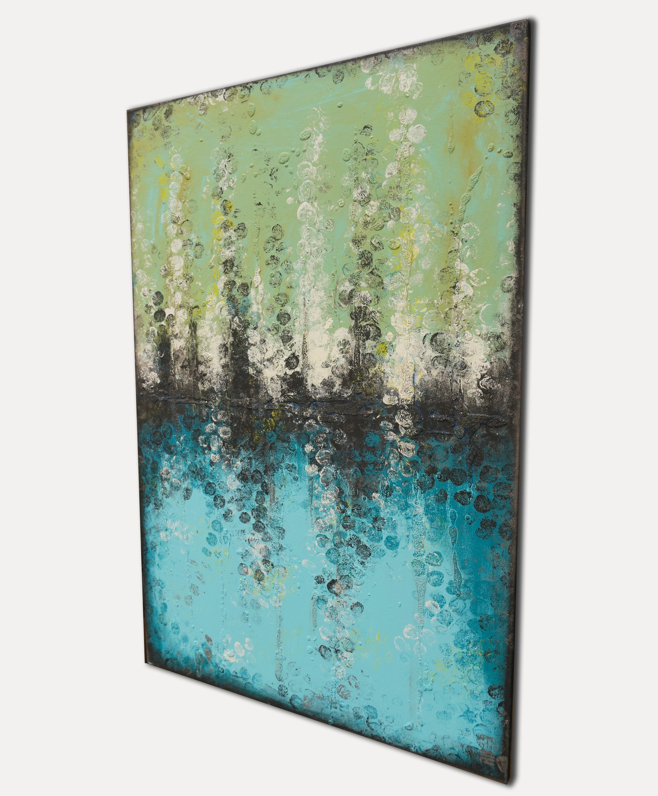 This abstract artwork features a captivating interplay of colors and textures, creating an intriguing visual experience. Dominated by a soothing palette of mint green and turquoise, the canvas radiates tranquility and depth. The artist employs a technique of layered brushstrokes and textured dots to craft a dynamic, reflective composition reminiscent of a serene water’s surface. The central horizontal band, a darker, shadowy strip, suggests a horizon or dividing line between sky and water, enhancing the sense of reflection. The random yet intentional distribution of circular forms adds a playful liveliness, evoking imagery of bubbles or ripples. This piece’s unique balance of order and chaos invites viewers to explore its depths, offering a fresh perspective with each glance. The vibrant contrast between the light and dark elements underscores a theme of duality and harmony, making it a striking and memorable work.