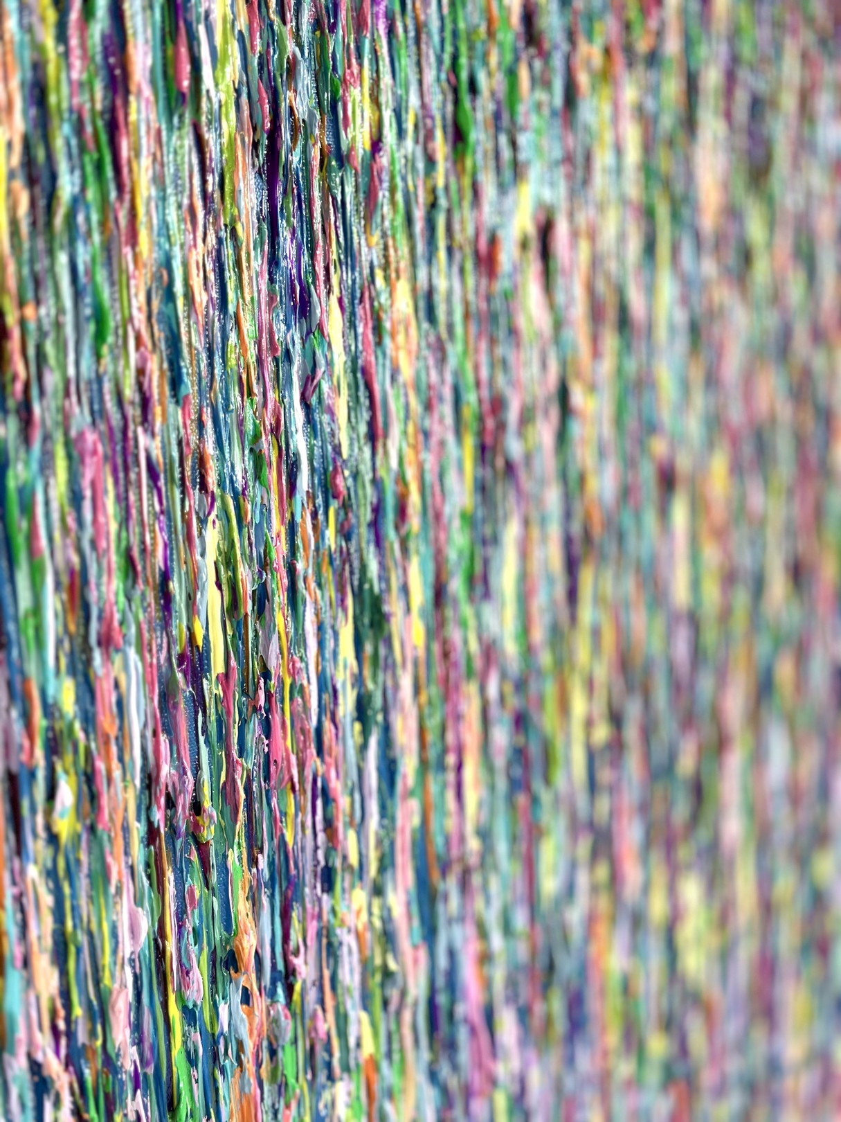 Cette œuvre d'art est un spectacle envoûtant de lignes verticales, mêlant de manière experte une multitude de couleurs issues de l'ensemble du spectre. L'œuvre commence par une concentration intense de couleurs vibrantes au sommet, pour passer progressivement à des teintes plus claires au fur et à mesure qu'elle descend. Chaque ligne semble méticuleusement travaillée, créant une cascade de couleurs qui rappelle une forte averse ou une chute d'eau en cascade. L'utilisation des couleurs est magistrale, intégrant harmonieusement les bleus, les verts, les rouges, les jaunes et les violets pour former une symphonie visuelle dynamique. La partie inférieure de la toile se fond doucement dans le blanc, suggérant habilement un sentiment de sérénité et d'achèvement. La juxtaposition d'une coloration dense et d'un léger fondu illustre la maîtrise du mouvement et de la profondeur par l'artiste. Cette œuvre d'art est à la fois abstraite et évocatrice, invitant le spectateur à interpréter le paysage émotionnel dépeint dans cette odyssée verticale vibrante.