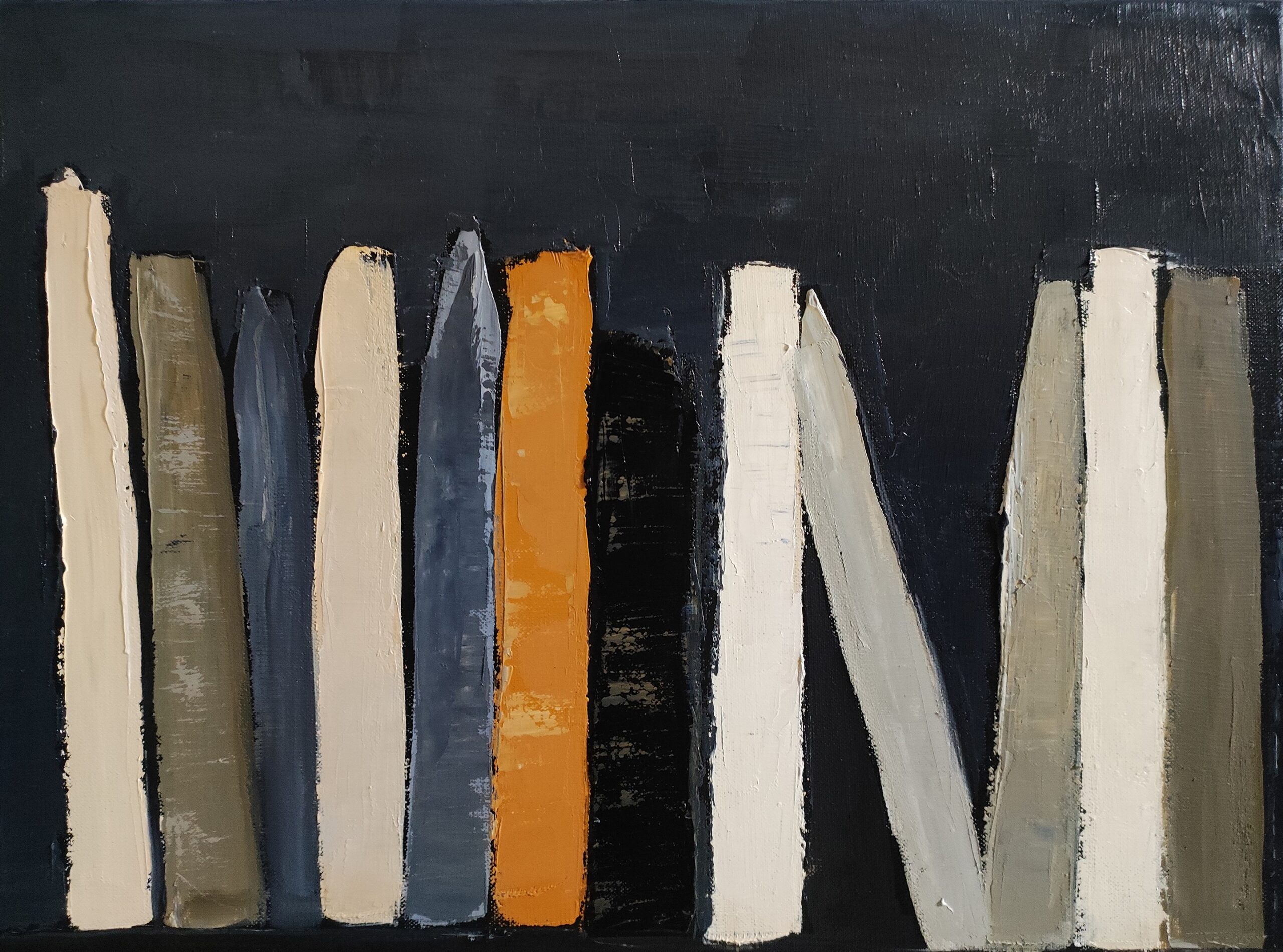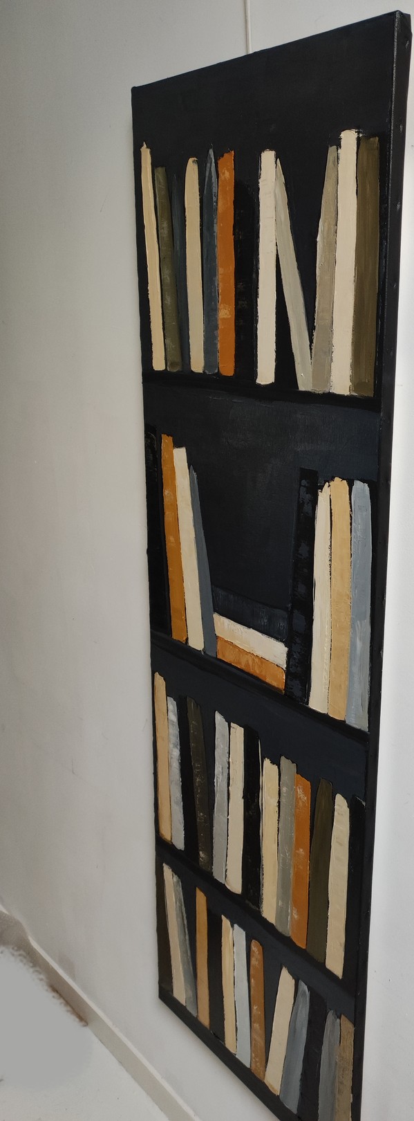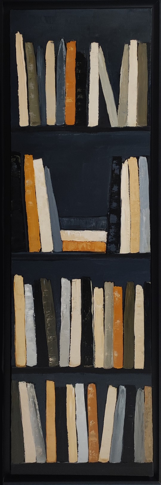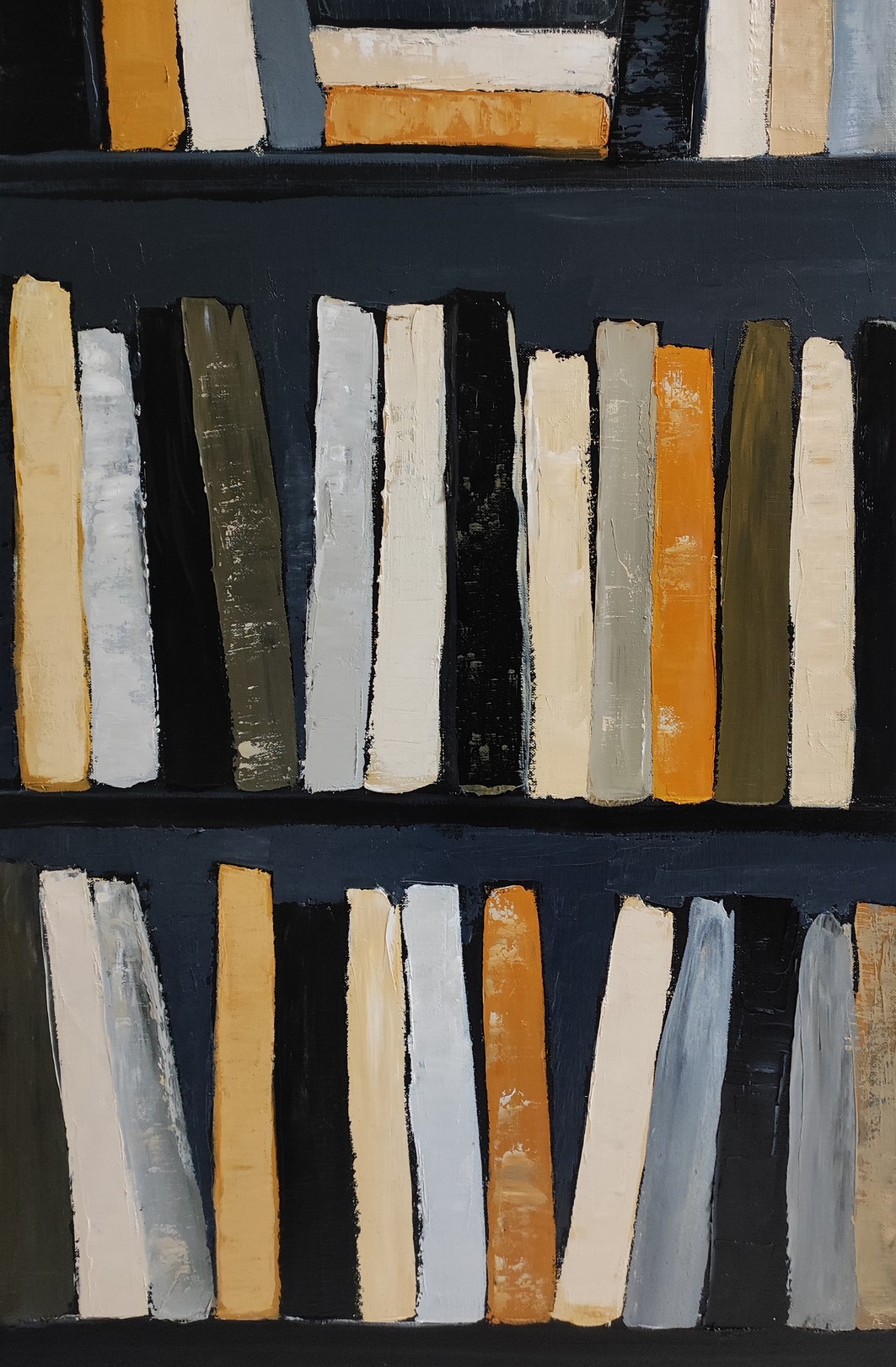 Le contraste des couleurs, avec des accents d'orange et de jaune, peut être interprété comme une lumière vive dans l'obscurité. Les livres, qui se succèdent sans décalage apparent, génèrent un sentiment de fluidité dans l'agencement de l'espace pictural, qui symbolise le mouvement continu des idées et des pensées, leur interdépendance. La surface texturée de la toile, travaillée par des coups de pinceau affirmés, renforce la dimension organique de l'œuvre, comme si chaque livre, chaque étagère, était une étape dans le cheminement intellectuel de l'homme.