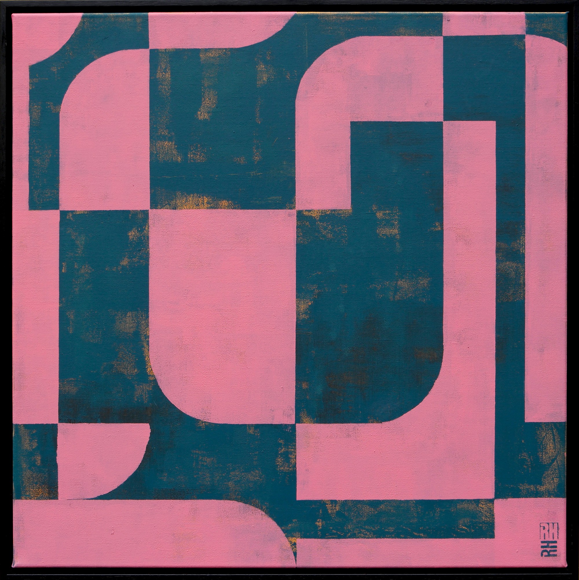 This artwork is a striking geometric abstraction, characterized by a bold interplay of pink and teal hues. The composition is meticulously structured with a series of interlocking shapes and curves, creating a dynamic tension between form and color. The artist employs a retro-inspired palette that adds a sense of nostalgia, while the precise lines convey modernity. The texture is subtly distressed, introducing a layer of complexity and depth to the flat surface. Each shape’s sharp edges contrast with the smooth curves, enhancing the visual rhythm. A small, unobtrusive signature in the bottom right corner adds a personal touch without distracting from the overall design. This artwork is a testament to the artist’s ability to balance simplicity with sophistication, creating a visually engaging piece that demands contemplation.