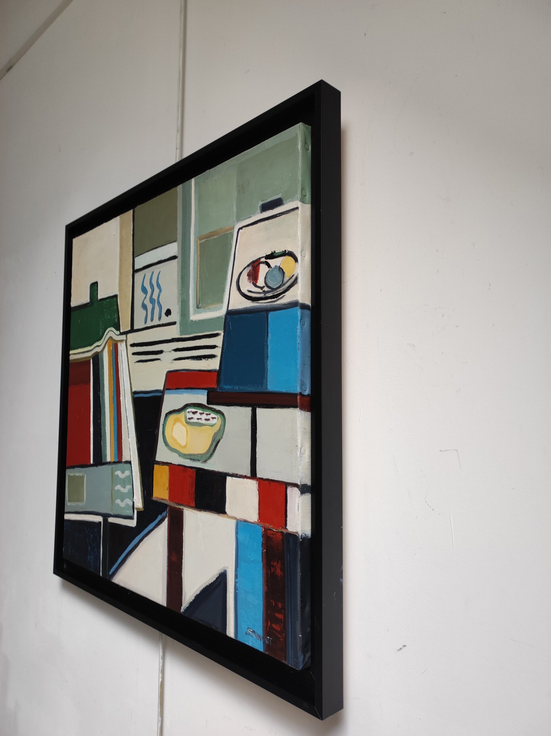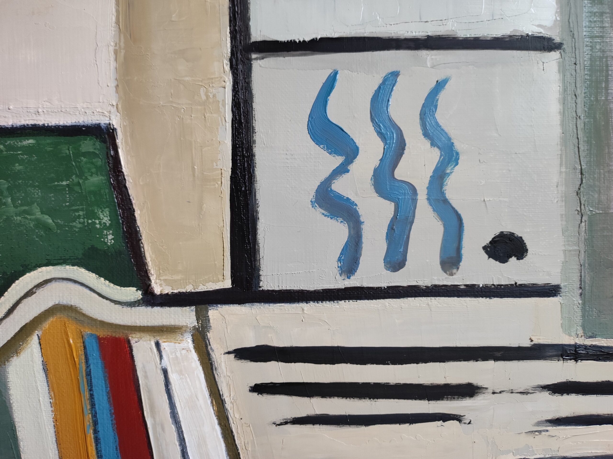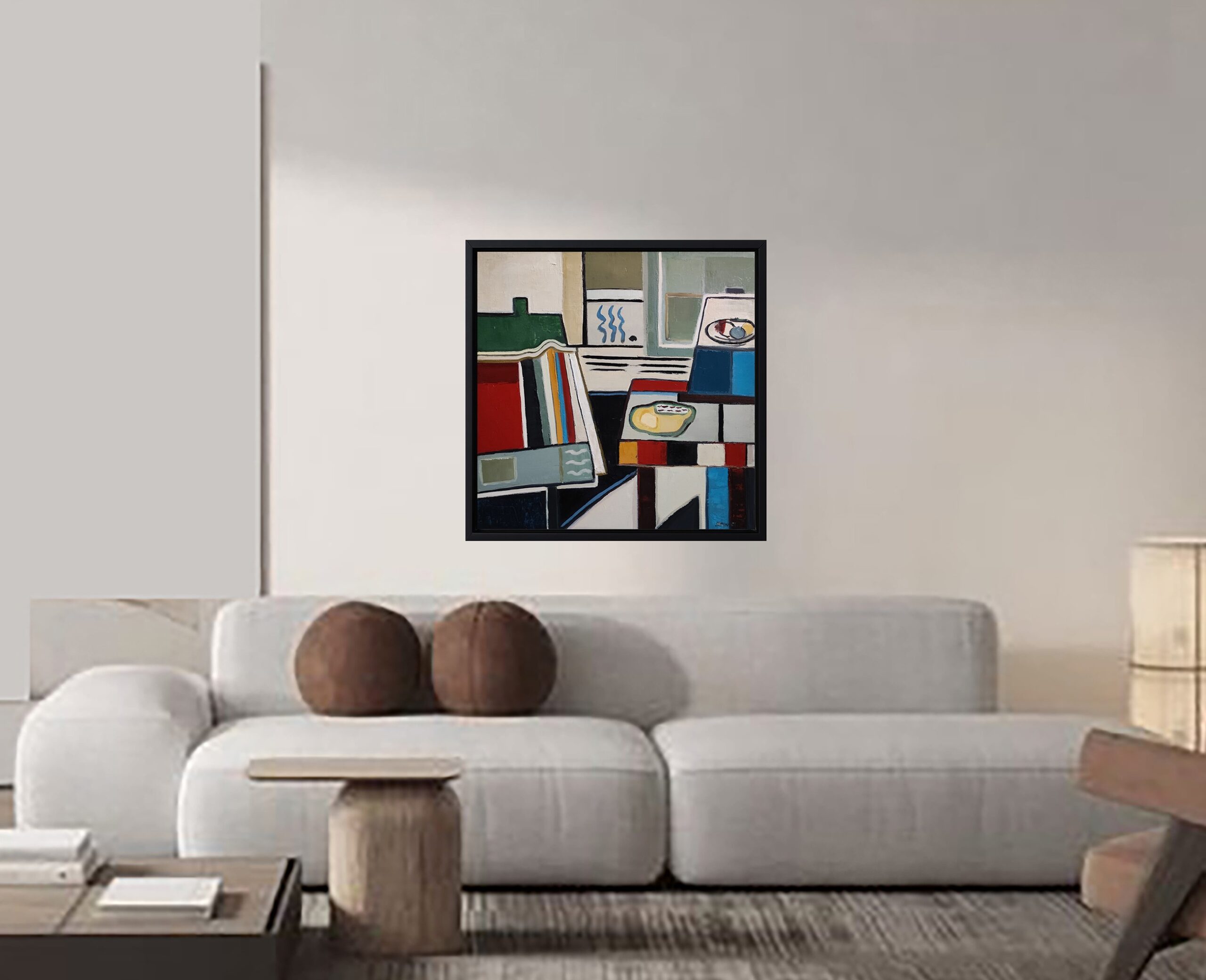 At the center of the work, abstract shapes evoke elements of a domestic interior, such as books, a table and everyday objects. These objects are presented in a stylized manner, suggesting their presence rather than representing them literally. This abstraction allows a focus on the interactions between shapes and colors, providing a new perspective on familiar spaces and objects.