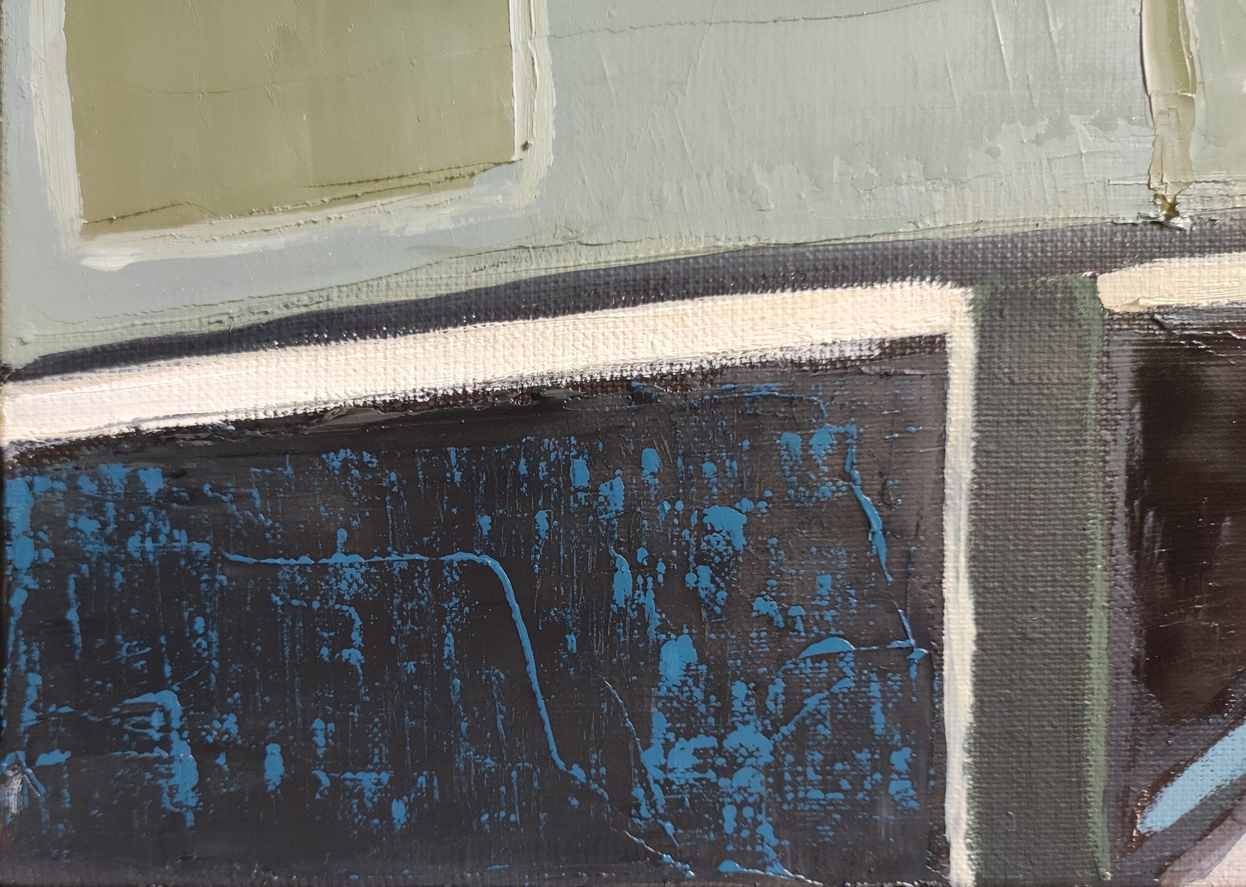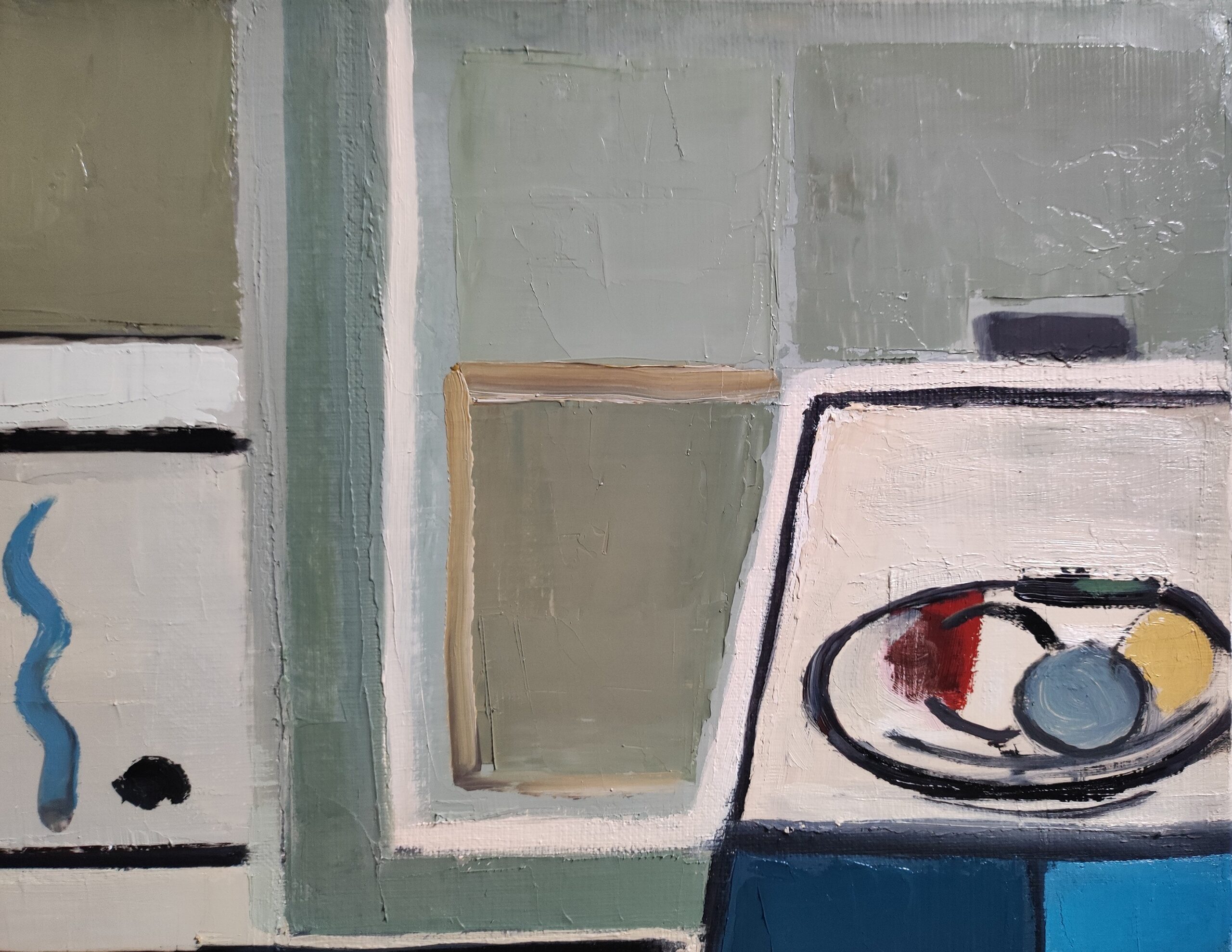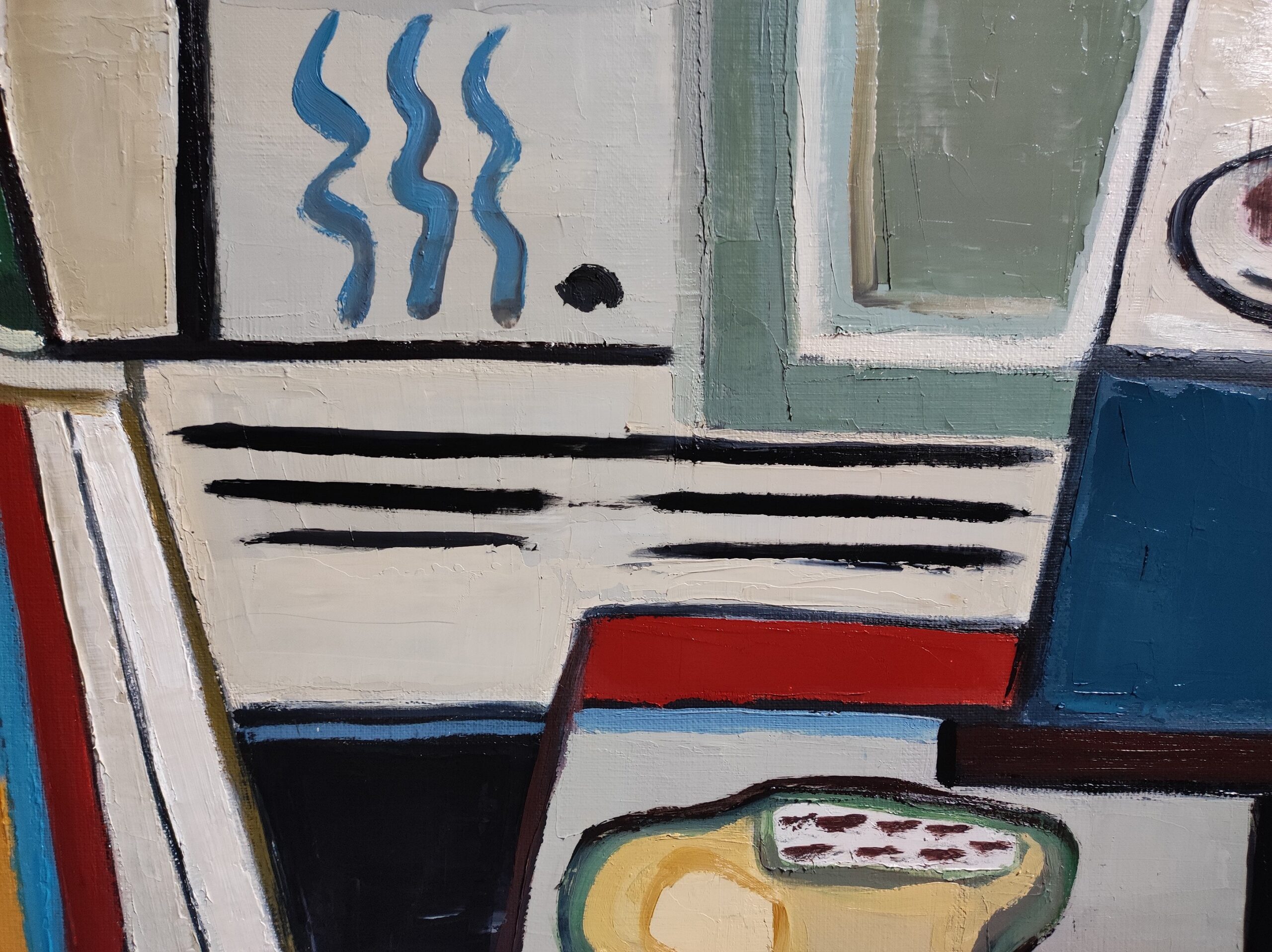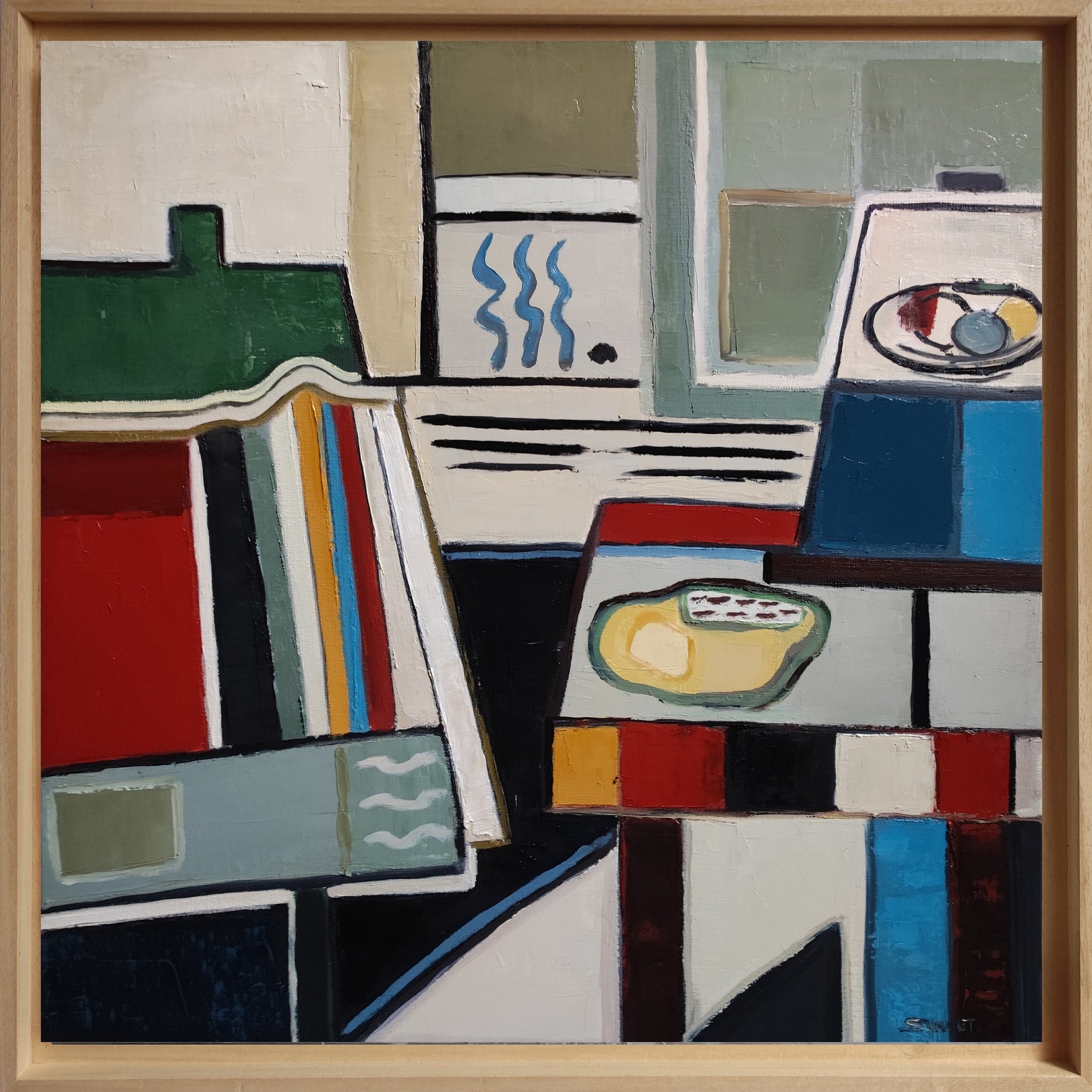 At the center of the work, abstract shapes evoke elements of a domestic interior, such as books, a table and everyday objects. These objects are presented in a stylized manner, suggesting their presence rather than representing them literally. This abstraction allows a focus on the interactions between shapes and colors, providing a new perspective on familiar spaces and objects.
