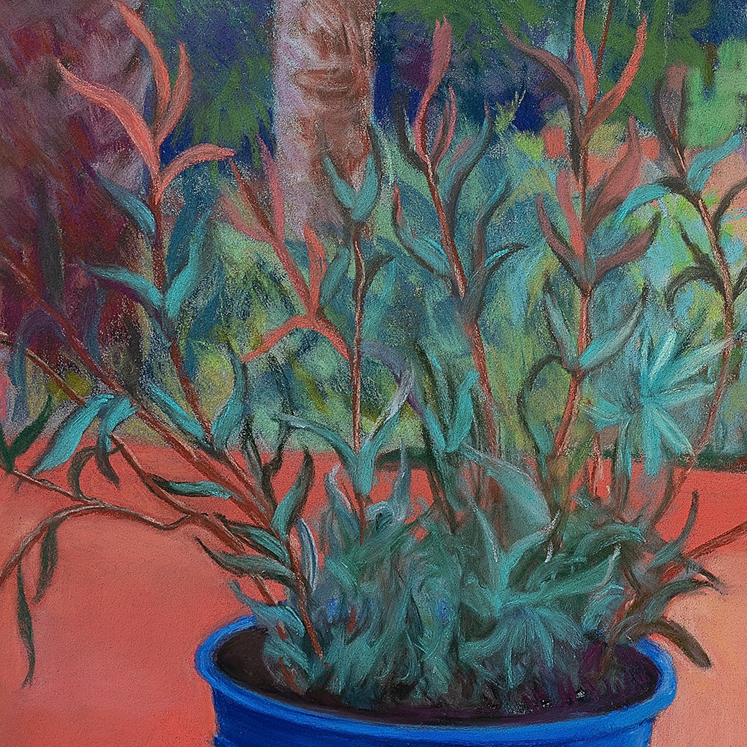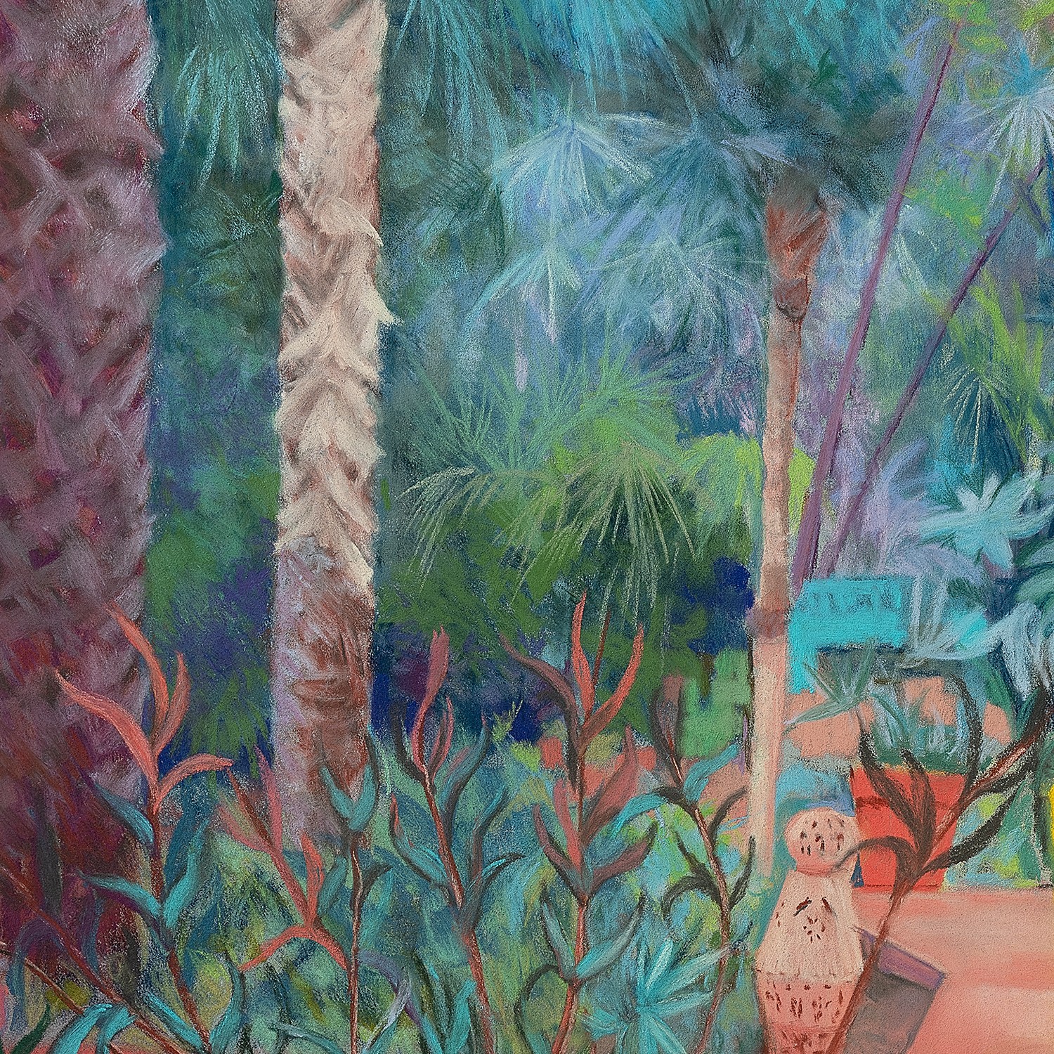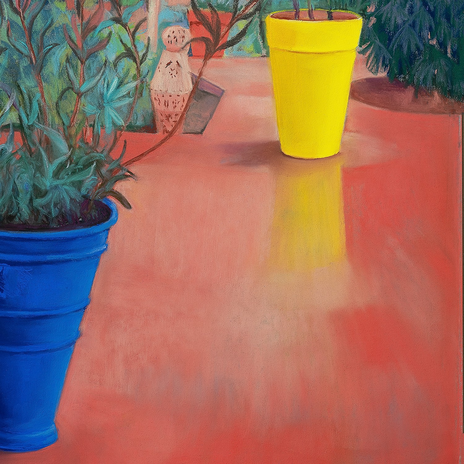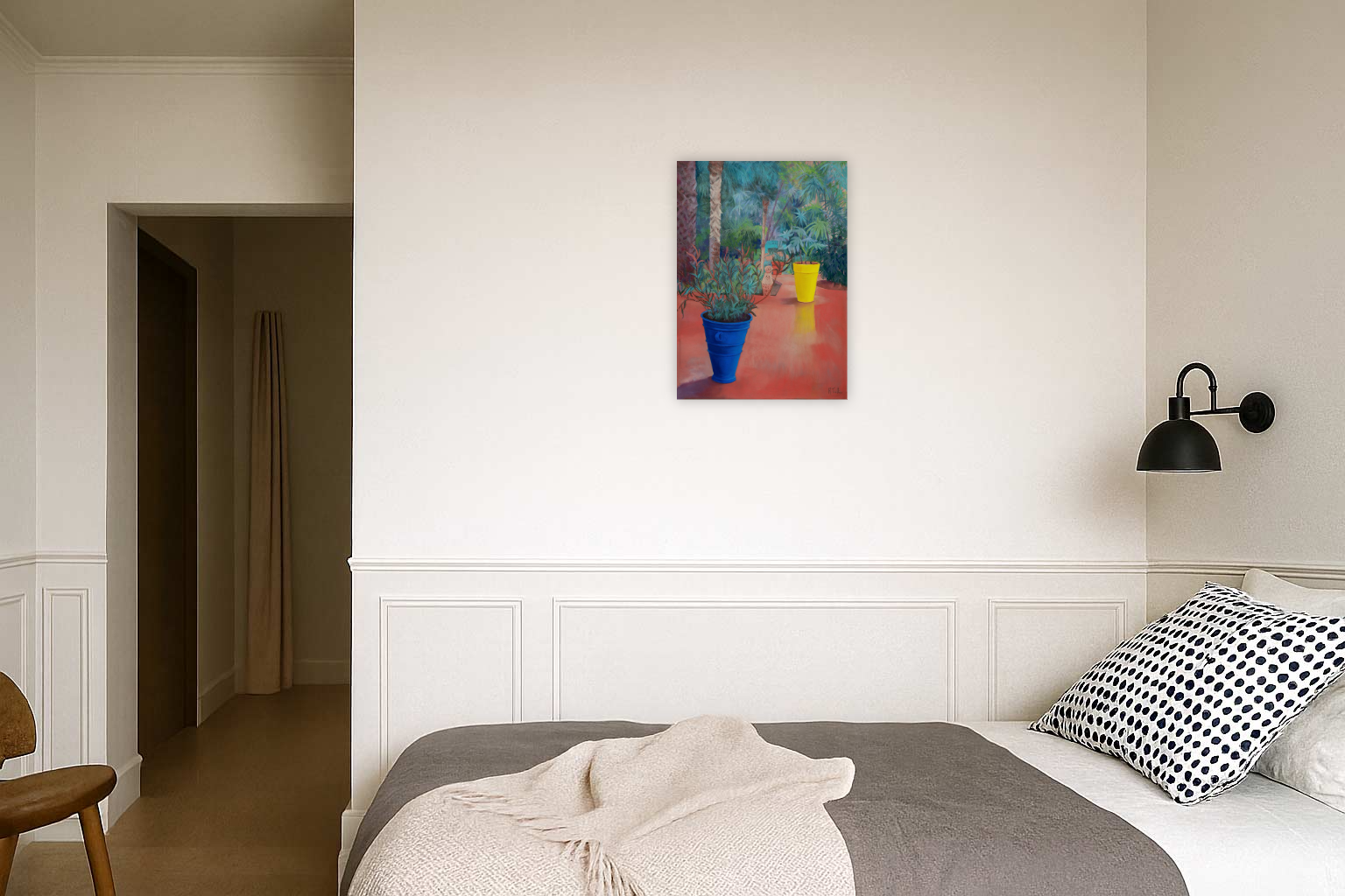 This painting immerses us in an exotic garden, with majestic palm trees rising in the background. In the foreground, two pots—one deep blue and the other vibrant yellow—immediately capture the viewer’s attention. Their vivid color contrasts beautifully with the earthy tones of the red path on which they rest. Lush vegetation surrounds the pots, adding depth and texture to the work. Light subtly filtered through the leaves creates a play of delicate shadows, reinforcing the scene’s peaceful and warm atmosphere. The bold use of color and attention to detail demonstrate remarkable technical mastery and aesthetic sensitivity. This work transports the viewer to a vibrant elsewhere, celebrating the beauty of nature and the harmonious relationship between natural and urban elements.