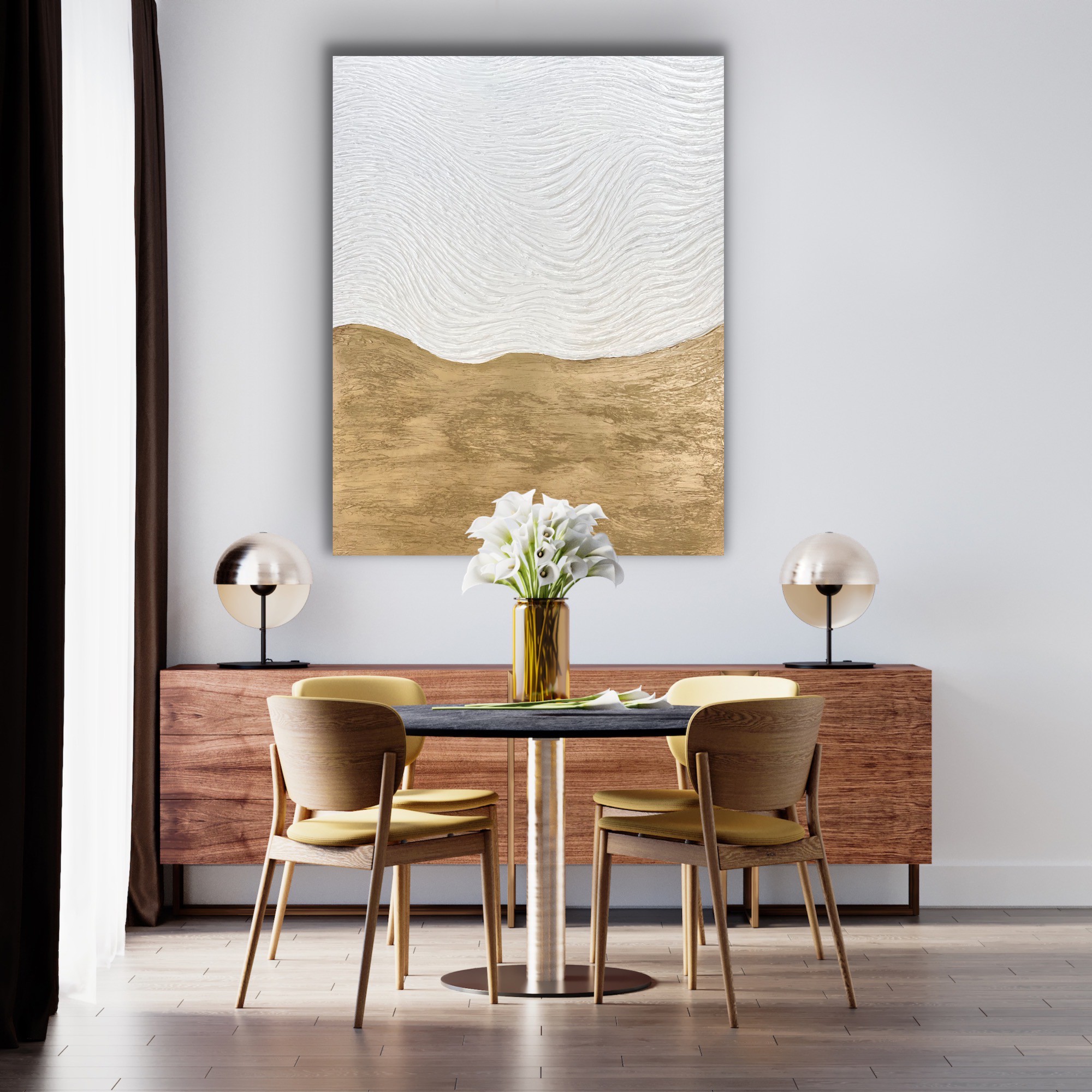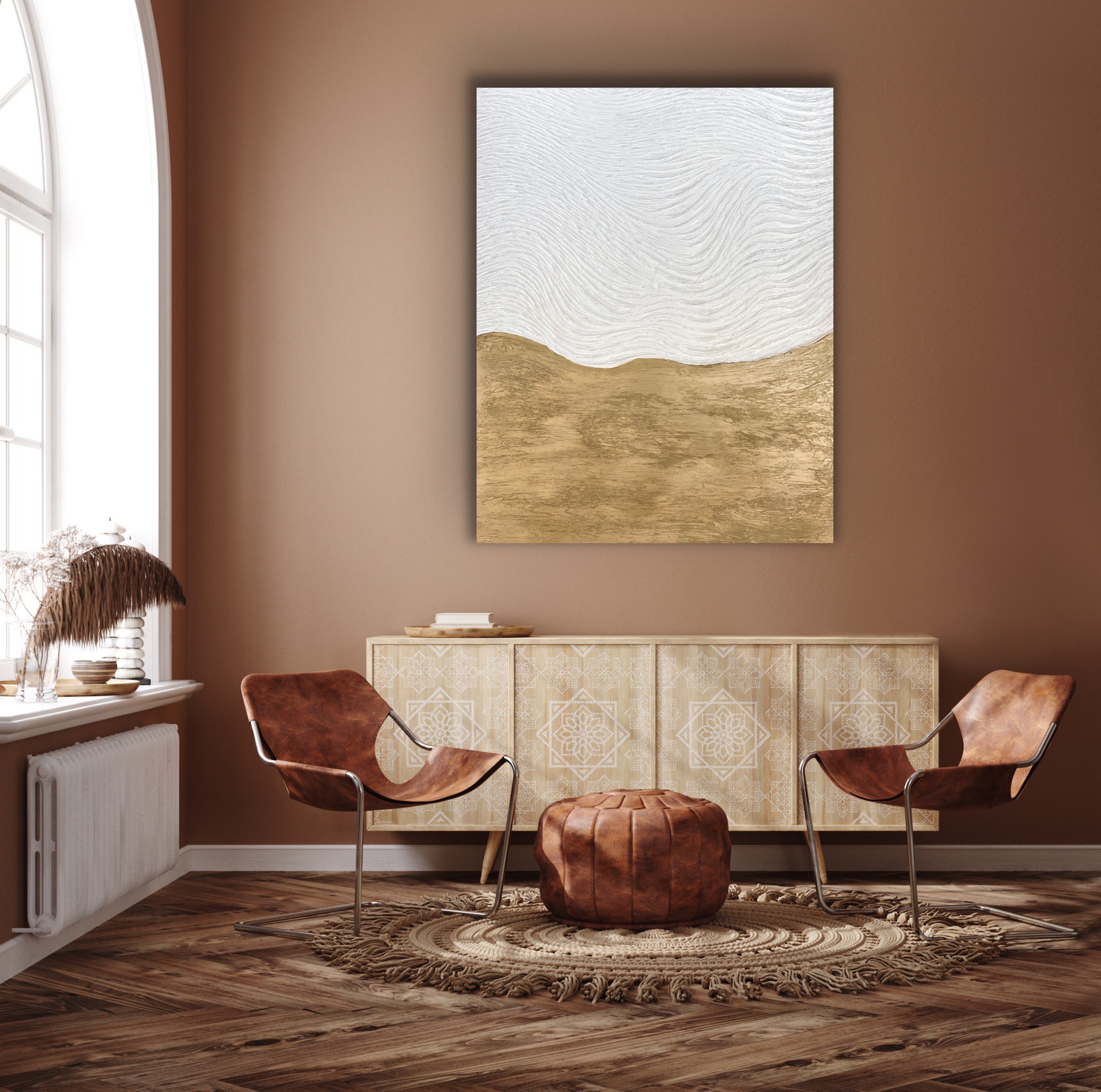 Understanding the interaction of these sensations allows me to convey not only visual but tactual sensations and rhythms similar to ones created by nature. The hypnotic pattern in the luminous abstraction seems to radiate, pulse and emerge. The result is open compositions, full of charm and energy which is the essence of my being and therefore my art.
