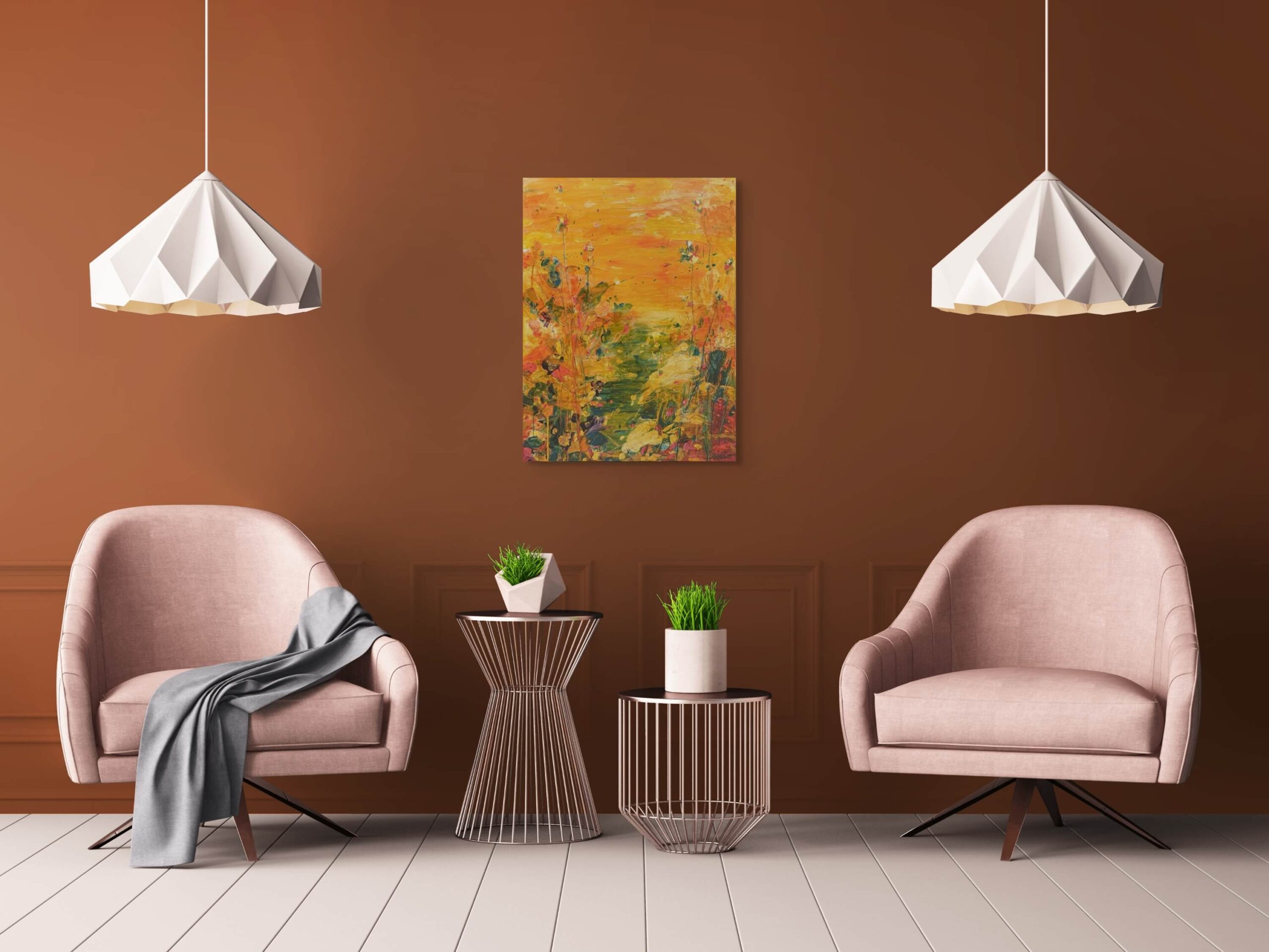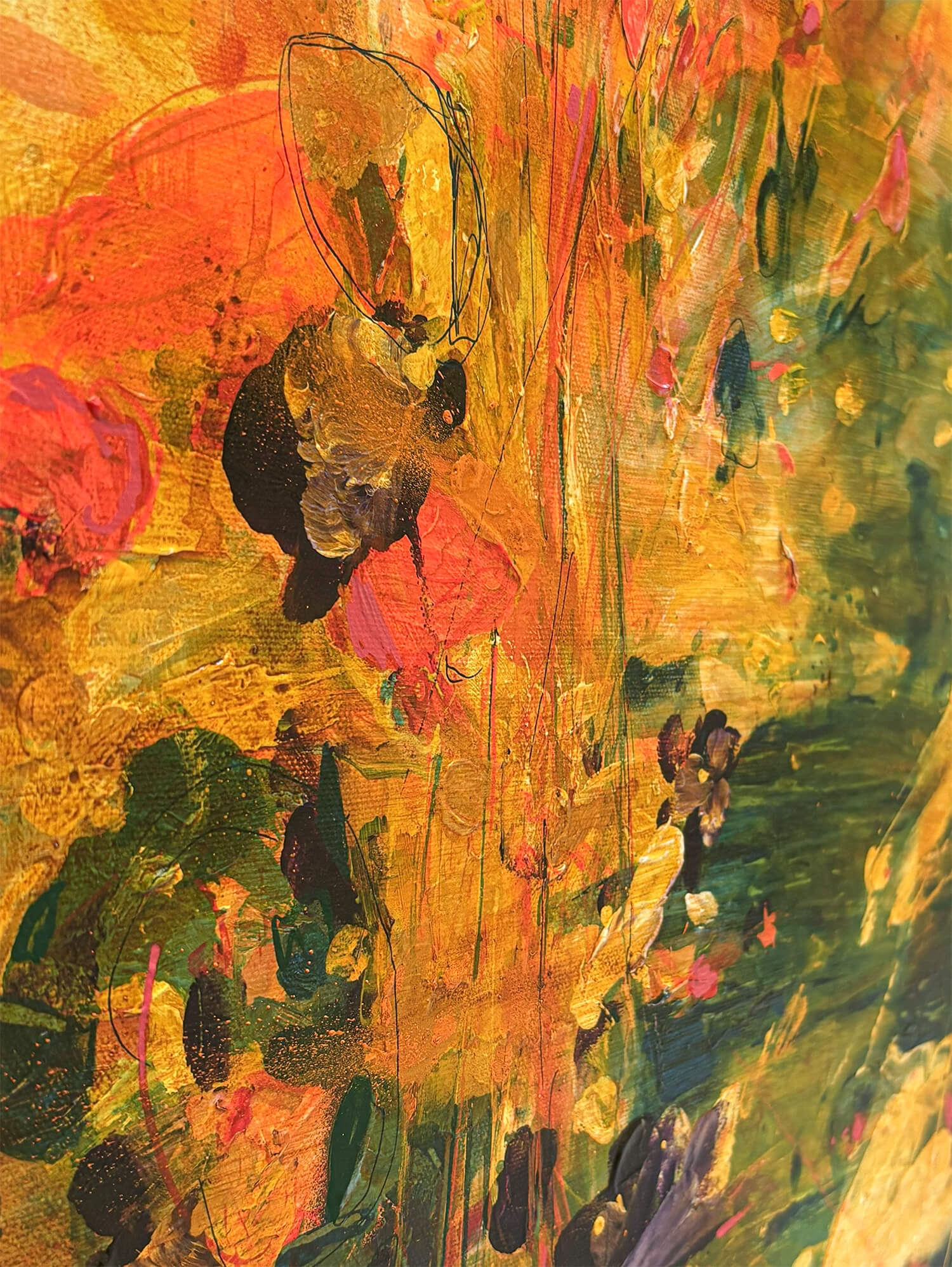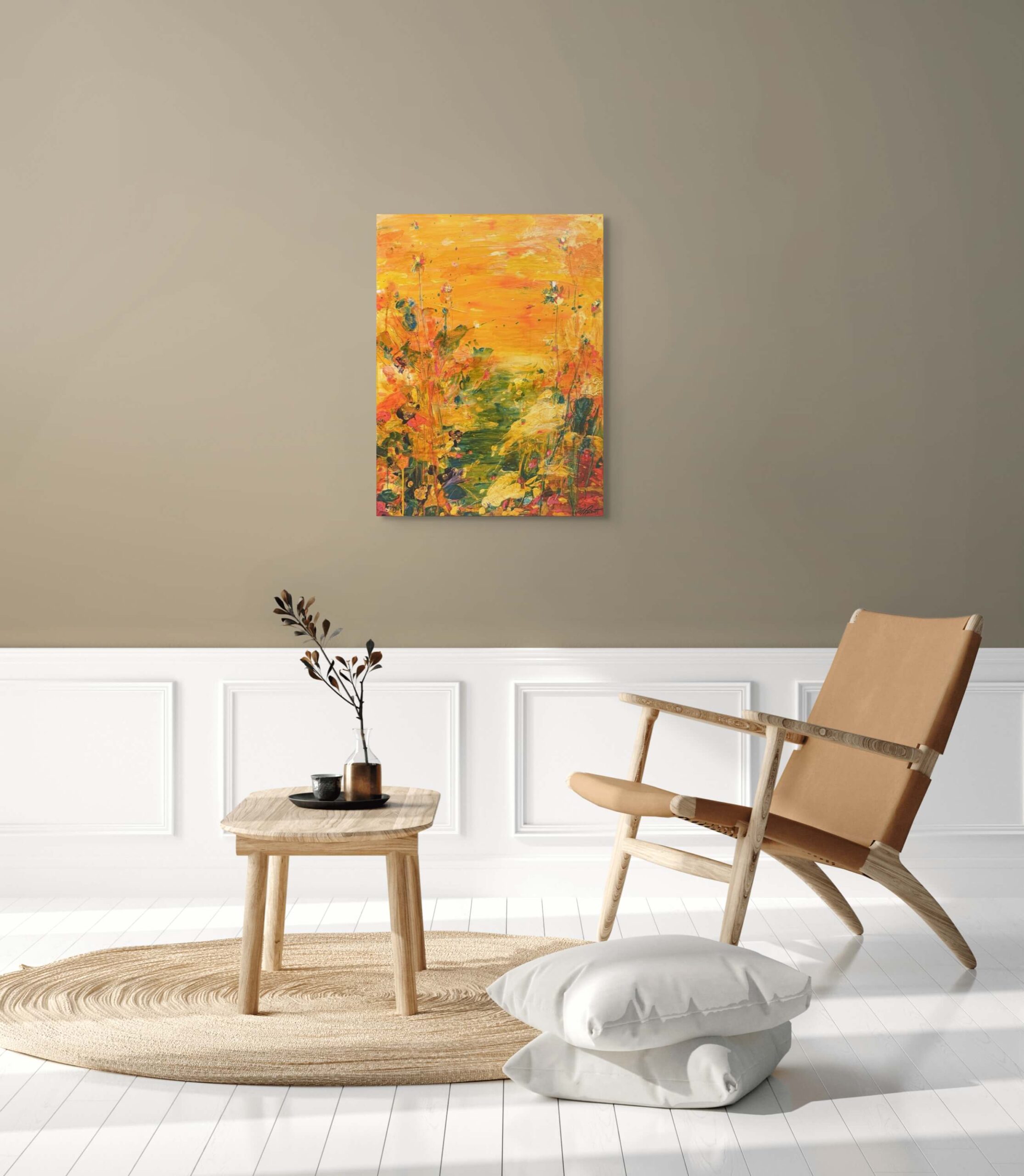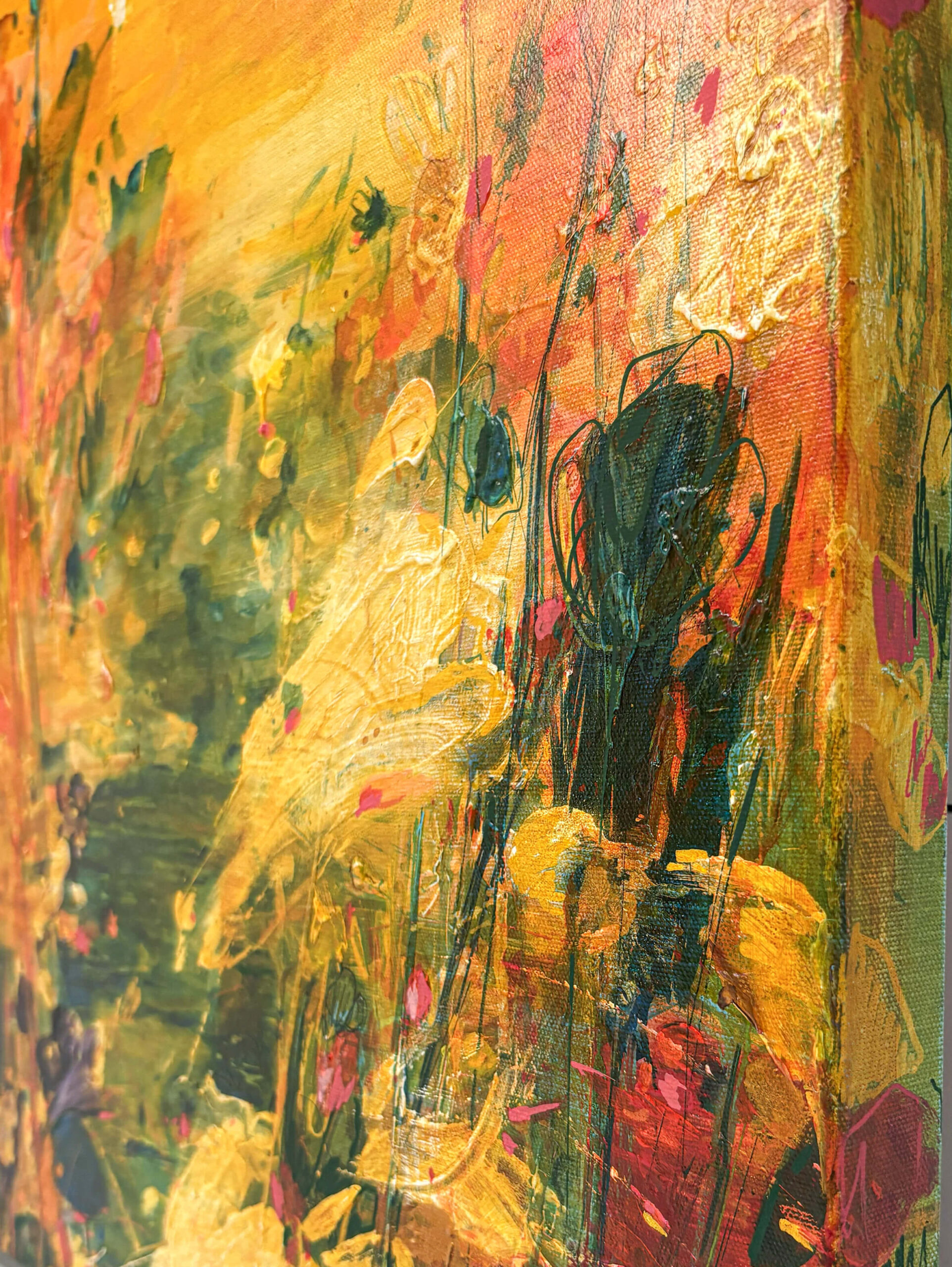 This vibrant artwork bursts with energy and life, presenting an abstract interpretation of a colorful garden scene under a radiant sunset sky. Bold, expressive brushstrokes dominate the canvas, creating a rich tapestry of colors. Warm shades of orange and yellow seamlessly blend with cooler hues of blue and green, providing a dynamic contrast. Vertical streaks suggest tall, delicate flowers swaying gently in the ambient glow, adding depth and movement. The artist’s use of thick, layered paint conveys texture and complexity, inviting viewers to explore the interplay of light and shadow. The sky appears to ripple with ethereal tones, evoking a sense of fluidity and transformation. Splashes of vivid colors scattered throughout bring spontaneity and excitement to the composition, making it an engaging visual experience. This artwork uniquely captures the fleeting beauty of nature’s transitions, engaging viewers in a vibrant exploration of color and form.
