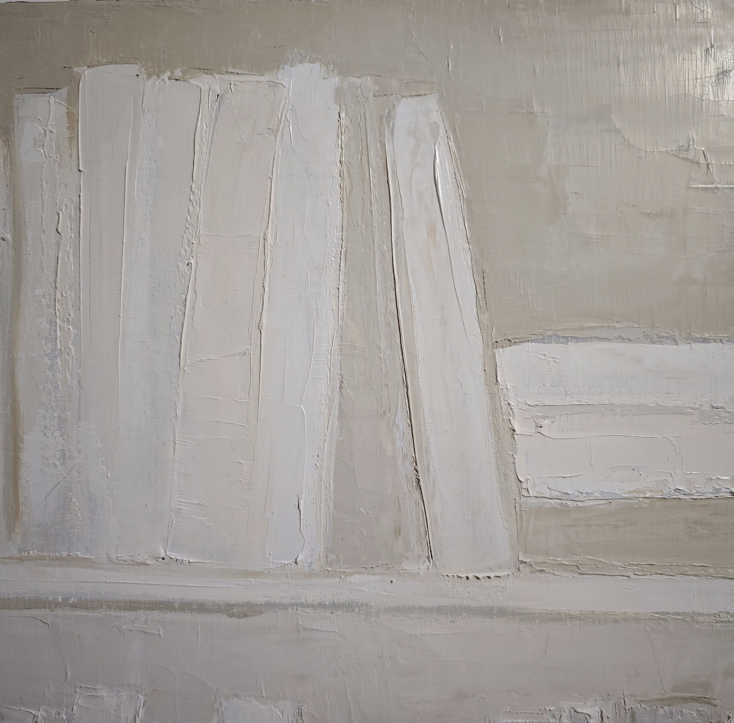 La palette chromatique, composée de tons naturels rehaussés de touches plus vives, évoque une harmonie méditative. Les teintes terreuses, beige et blanc cassé, se mêlent aux éclats plus intenses de rouge et de bleu, suggérant le contraste entre le silence et la parole, entre l'oubli et la mémoire.