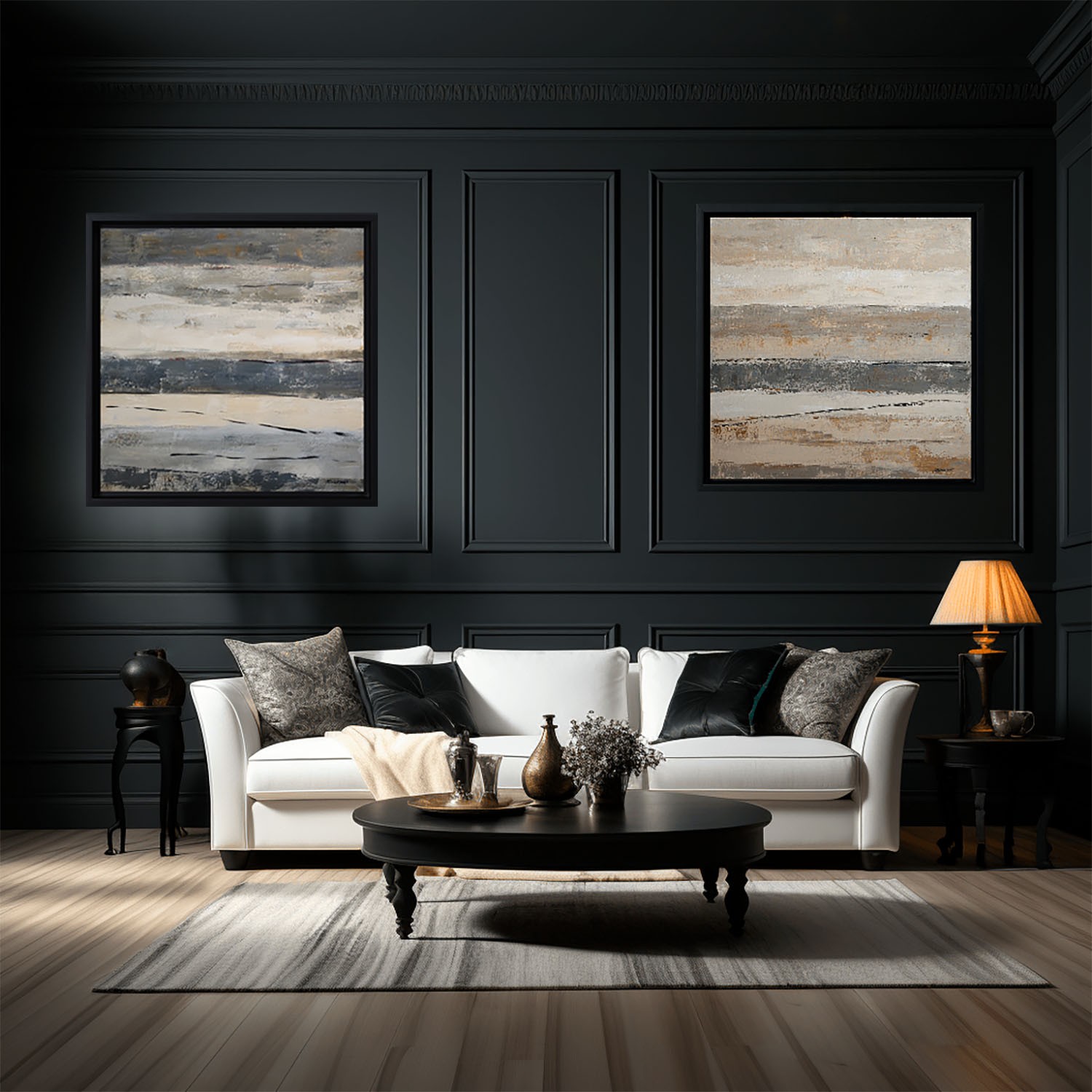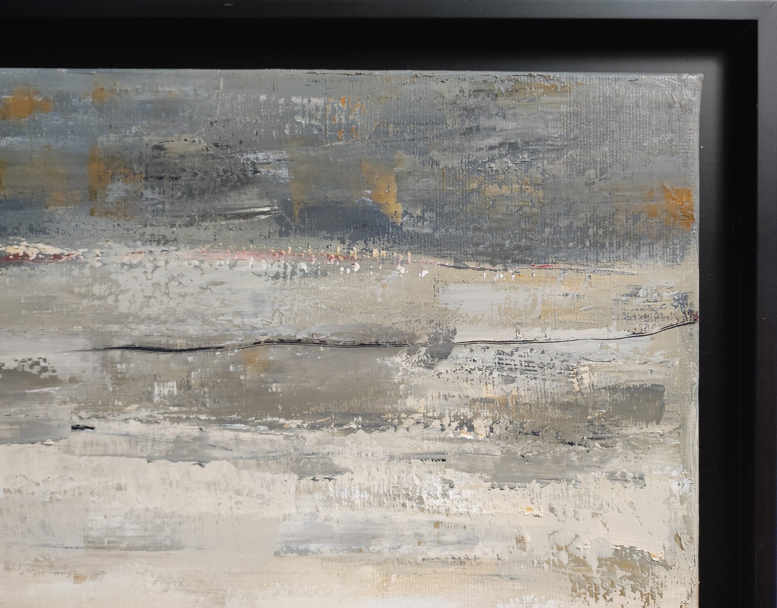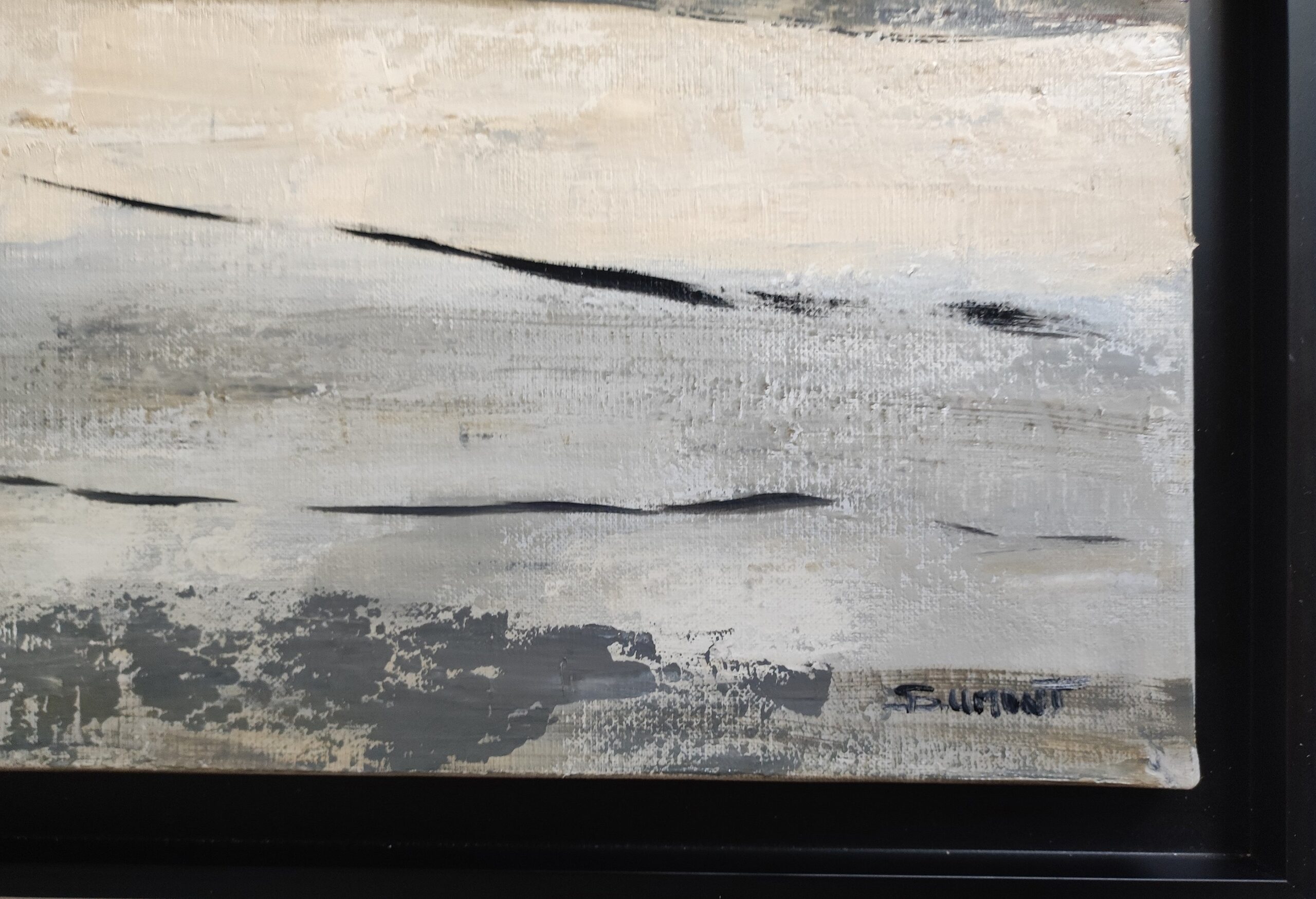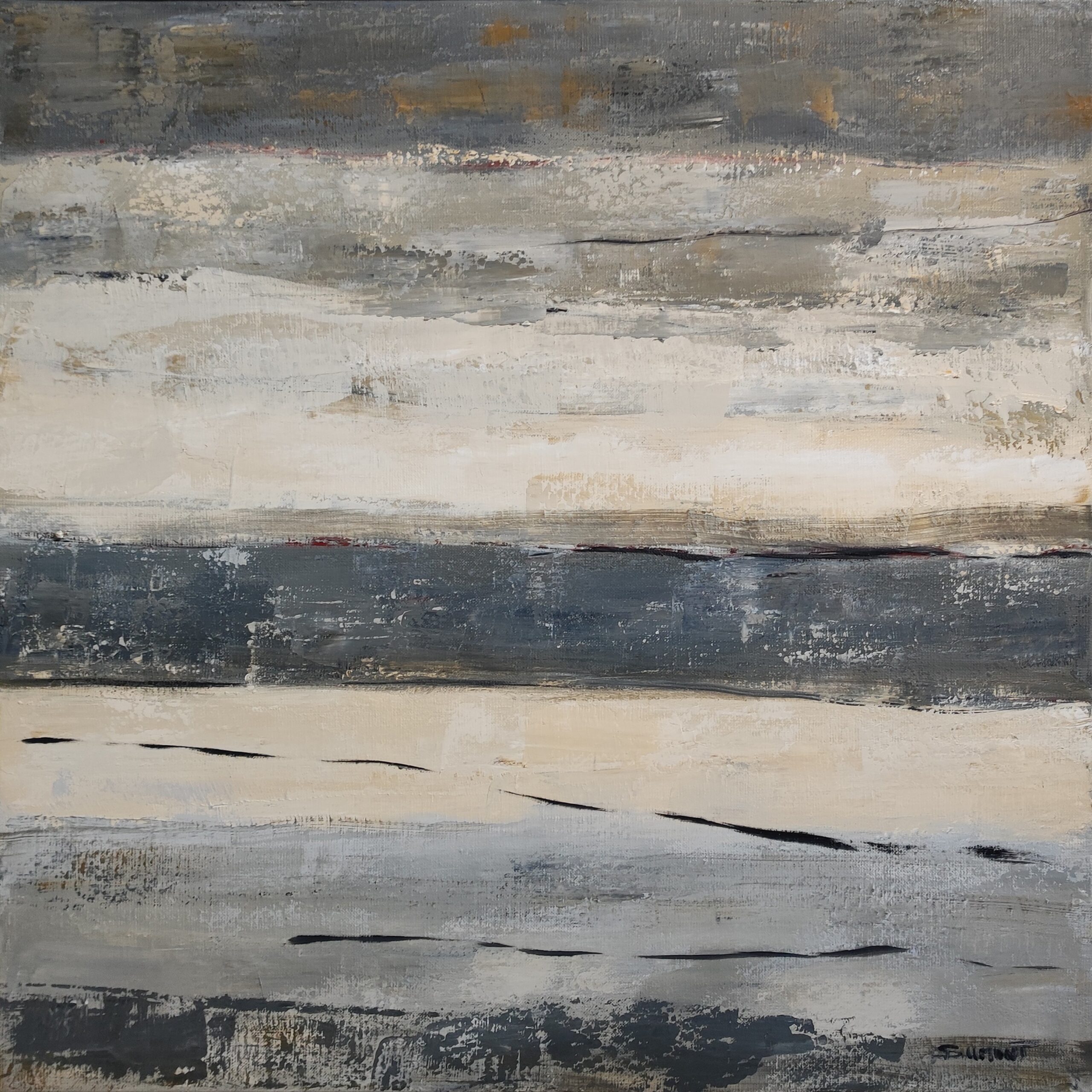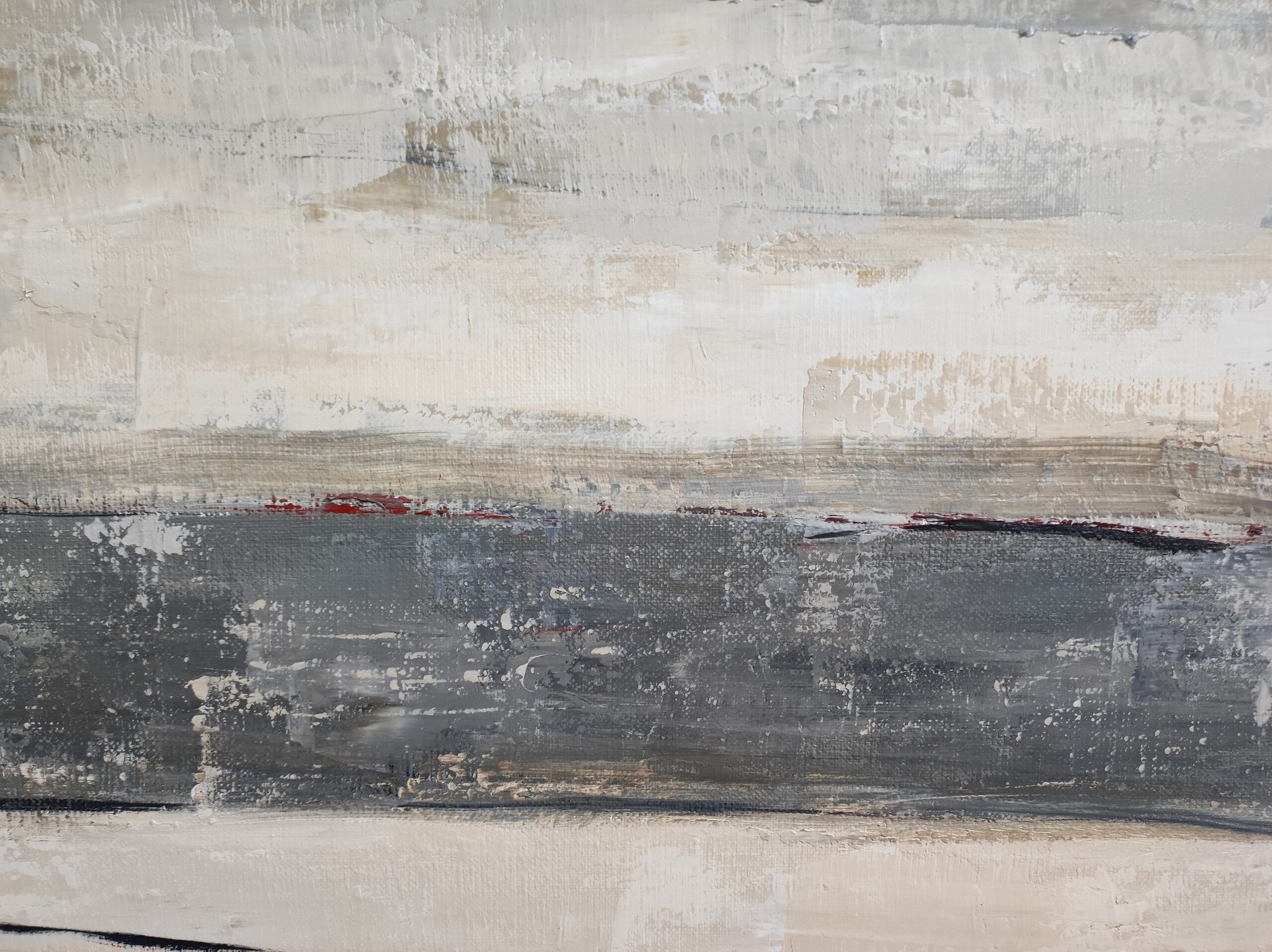 “Evanescent Light” is a subtle work that captures the essence of fleeting light in an abstract seascape. The use of soft, neutral tones, such as grays, off-whites, and washed-out blues, evokes a calming yet melancholic atmosphere. The slight contrast between the different horizontal layers gives a sense of depth and infinity. The texture of the paint, visible in the vigorous brushstrokes, gives the work an almost tactile feel, while reinforcing the idea of fleeting light that constantly changes with the elements. There is a certain serenity to this scene, almost like an invitation to meditative contemplation. The simplicity of the composition highlights the artist’s mastery in capturing light and atmosphere.