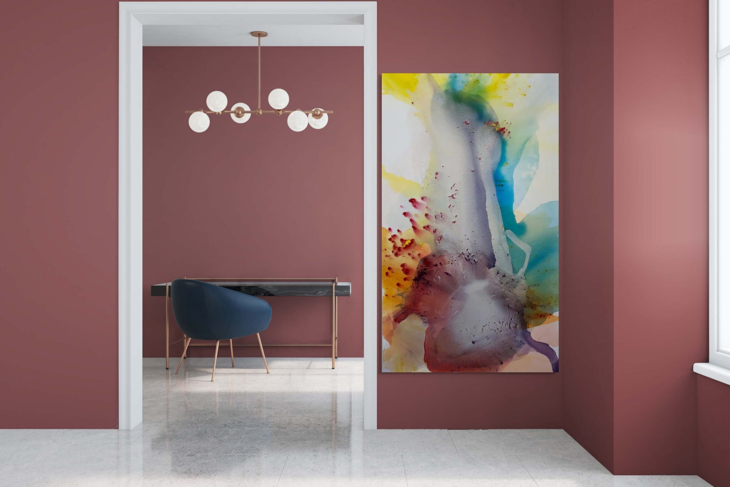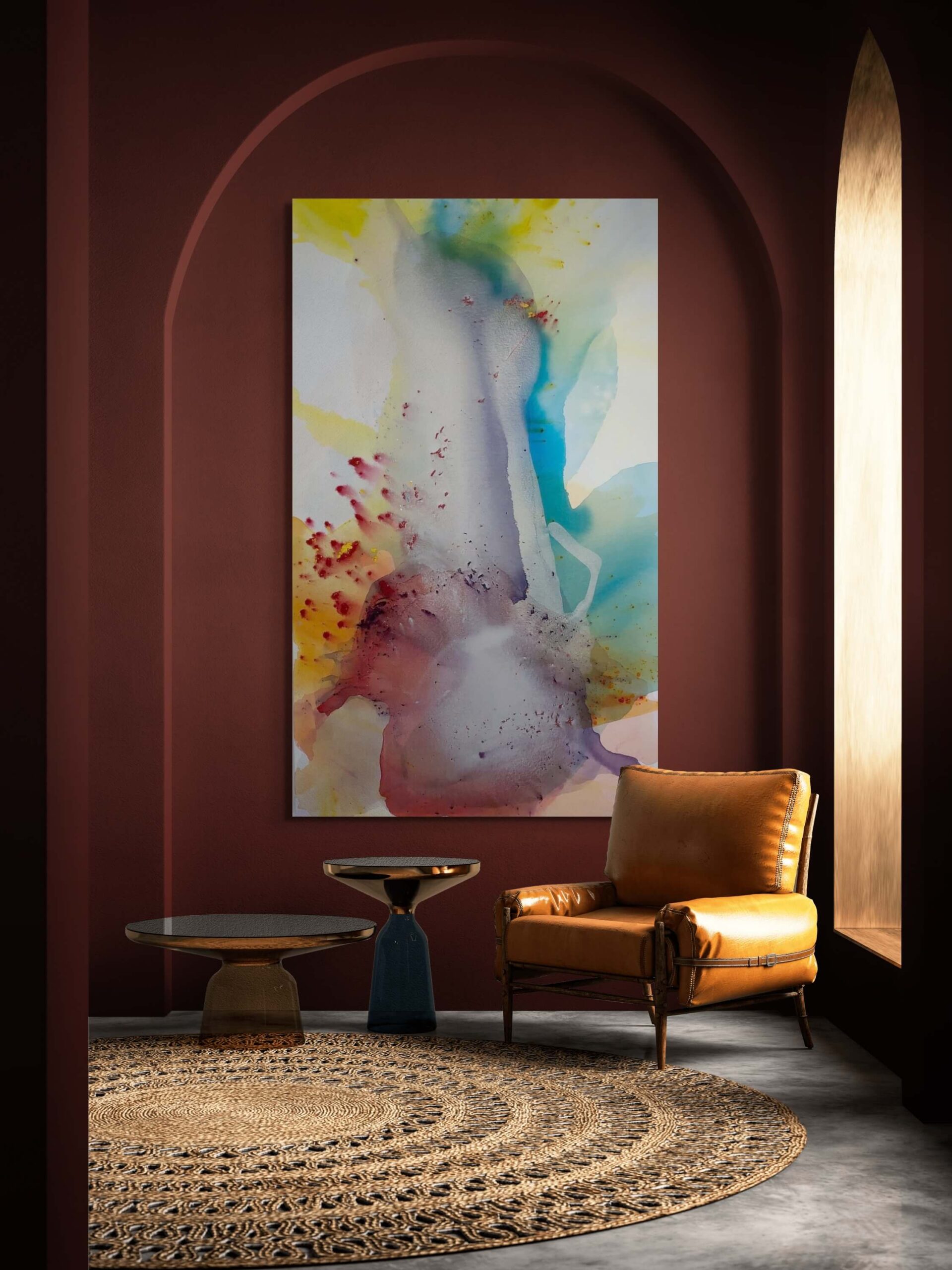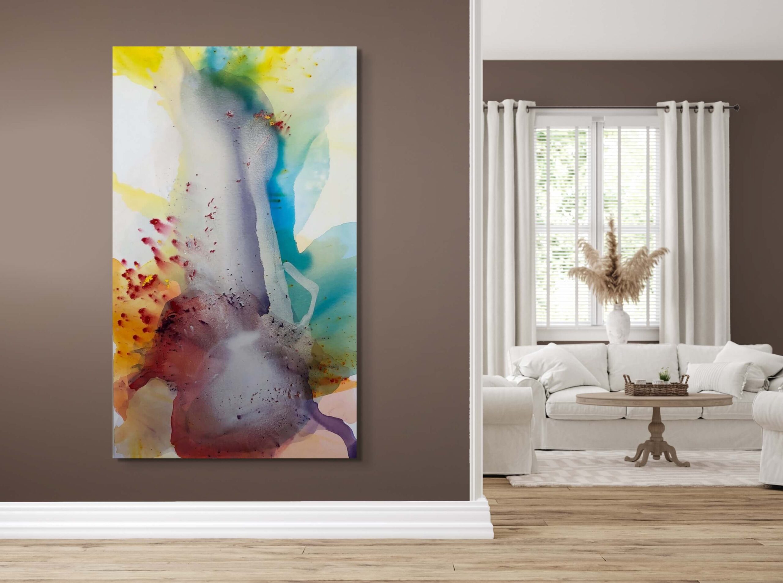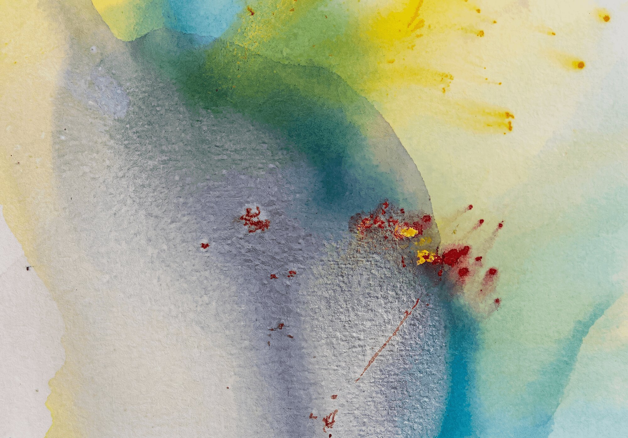 This artwork is an exquisite exploration of fluid dynamics and vibrant color interaction, creating a visual feast for the eyes. Dominated by a central, elongated shape in muted gray tones, it draws the viewer’s attention with its mysterious, almost ethereal presence. Surrounding this core is an explosion of colors—vivid yellow, deep red, and cool blues—that bleed into one another, forming a harmonious yet chaotic aura. The use of watercolor techniques is evident in the way pigments overlap and intermingle, creating delicate gradients and unexpected patterns. The unique application of speckled red accents adds texture and depth, making the piece feel alive and in constant motion. This captivating abstract composition invites viewers to interpret and re-interpret its forms, encouraging a continuous dialogue between the artwork and observer.