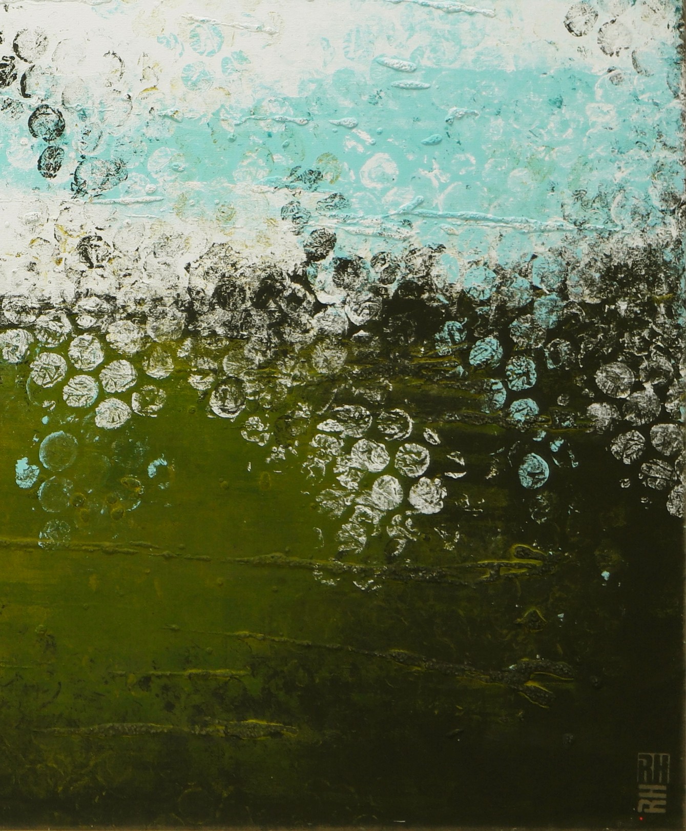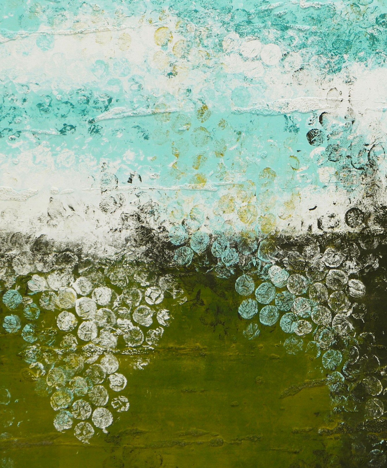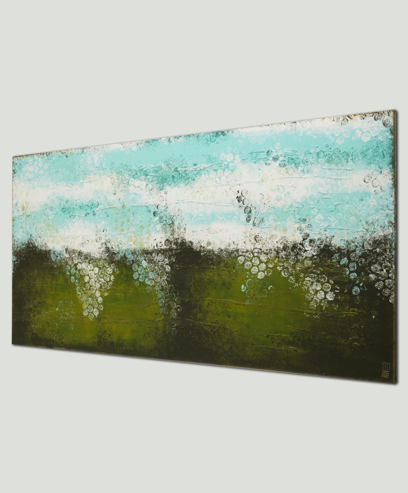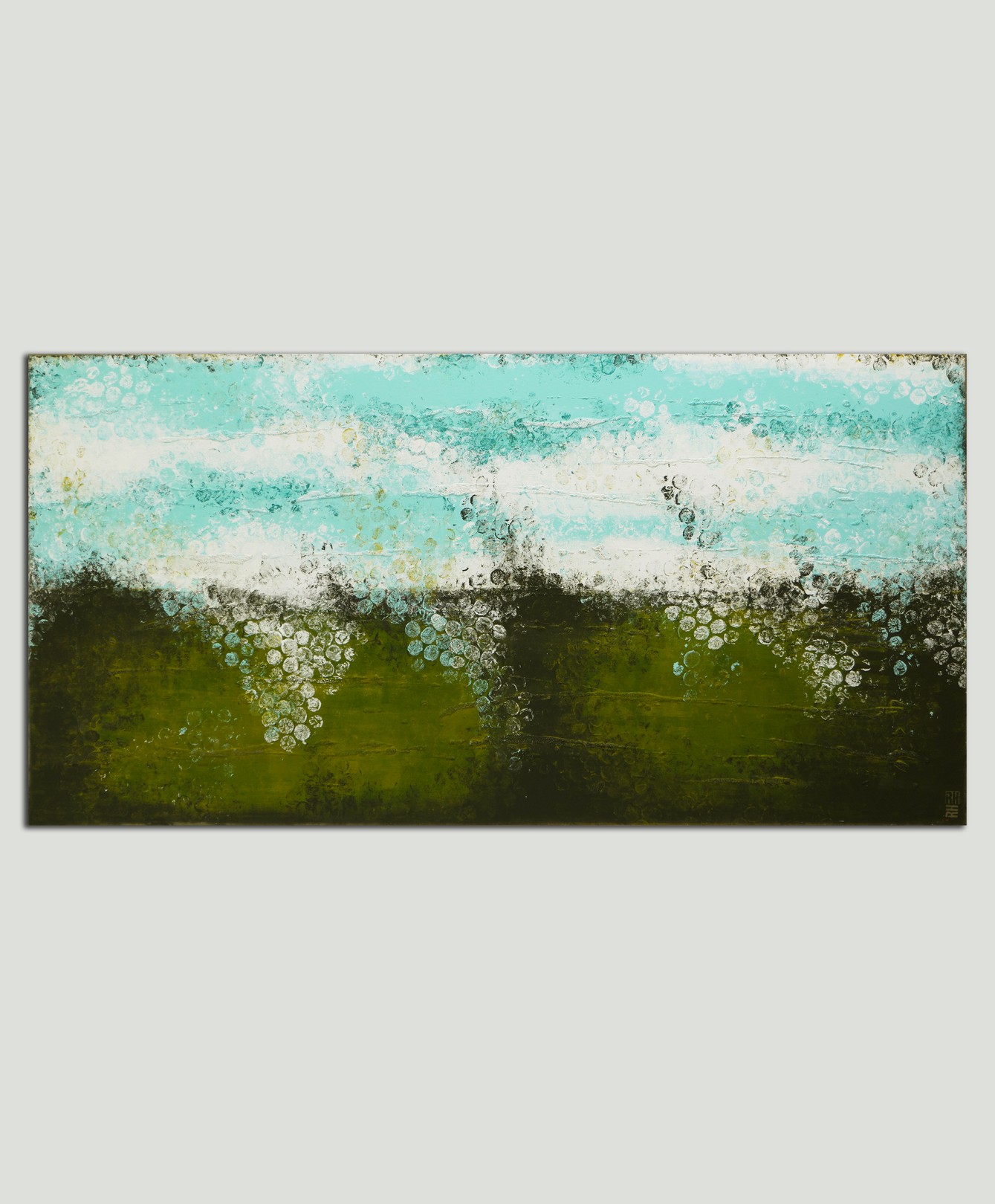 This artwork presents a stunning abstract landscape, characterized by its bold use of contrasting colors and textures. The composition is horizontally oriented, with the top half dominated by a serene blend of aqua and white hues, reminiscent of a tranquil sky or flowing water. Below, a rich, earthy green layer anchors the scene, suggesting verdant foliage or fertile ground. The painting’s unique aspect lies in its intricate layering and blending techniques, creating a dynamic interplay of light and shadow. Specks of white and blue, like delicate droplets or blossoms, cascade towards the bottom, adding depth and movement. The artist skillfully employs a mix of smooth and rough textures, inviting viewers to explore the tactile qualities of the piece. This vivid work captures the essence of nature’s beauty, balancing tranquility and vitality in a visually striking manner.