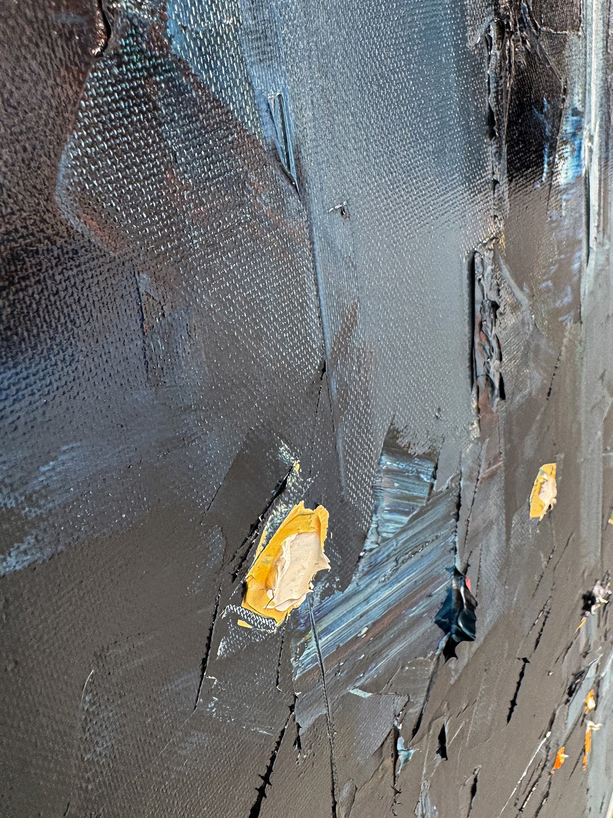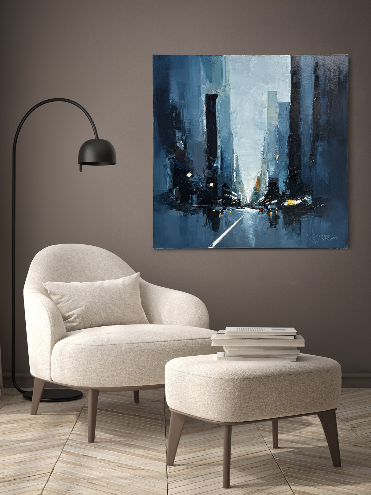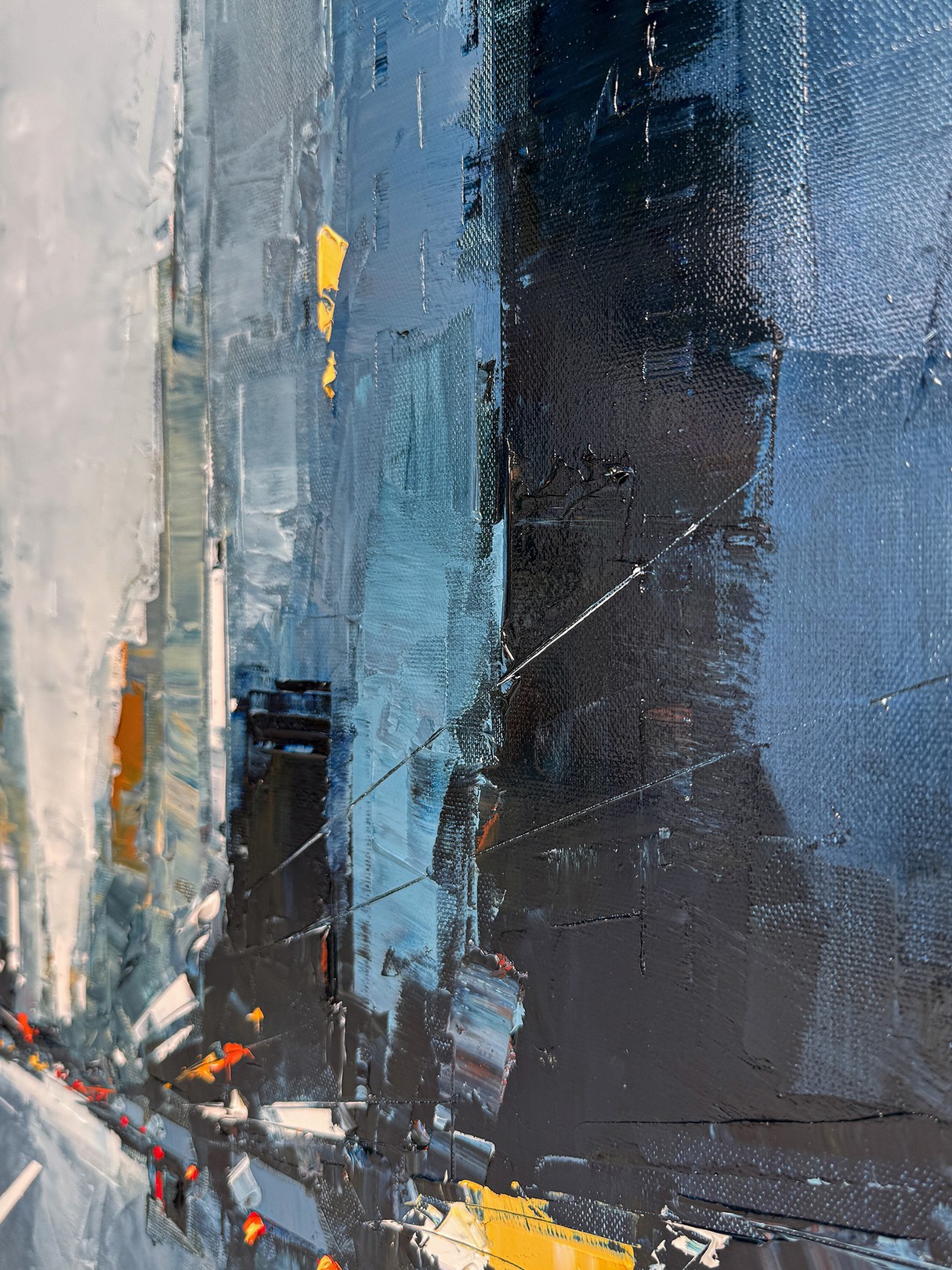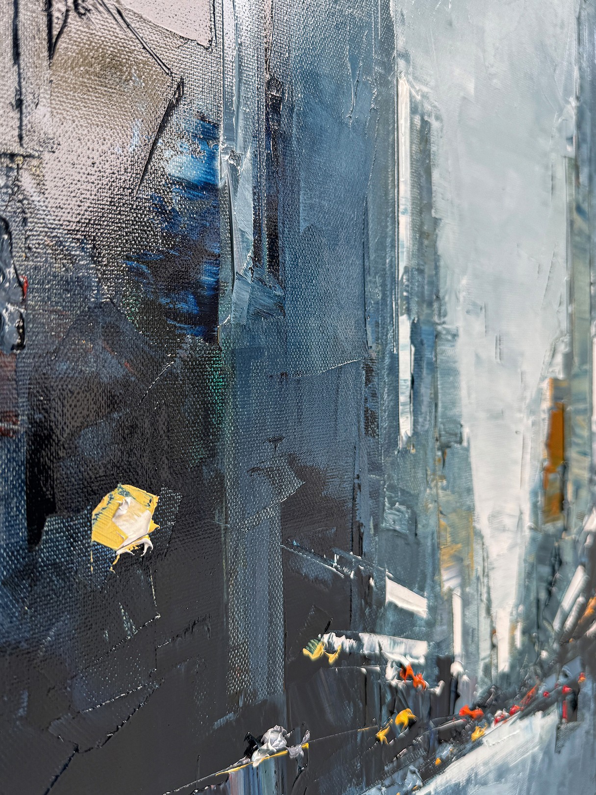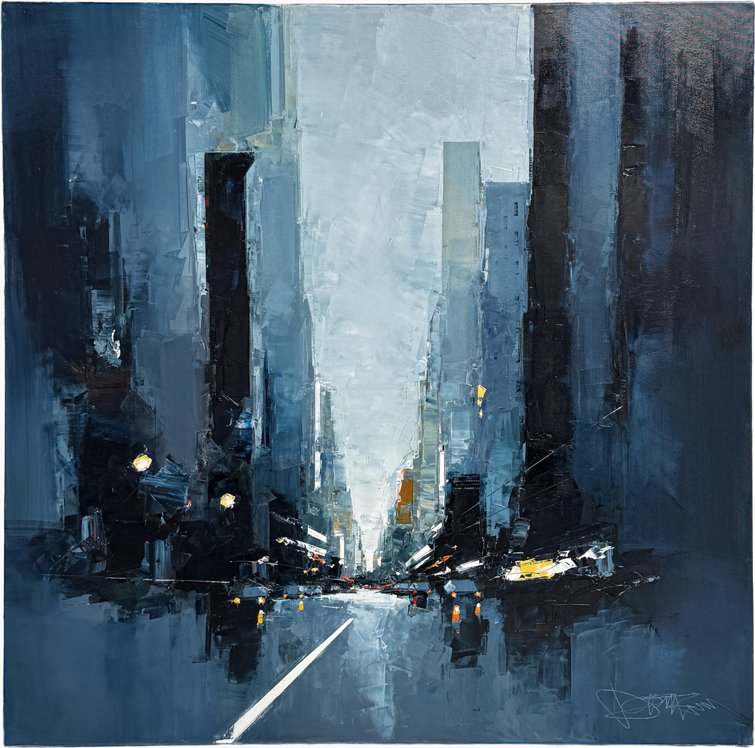 The artist employs a moody palette of deep blues and grays, punctuated by bold strokes of white and subtle hints of yellow, capturing the essence of a city shrouded in twilight. The street, centered in the composition, leads the eye towards a vanishing point, creating a sense of depth and movement. The textured brushwork adds a dynamic quality, conveying the energy and rhythm of urban life. Contrasting light elements mimic glowing streetlights and car headlights, infusing the scene with a lively yet mysterious atmosphere. The use of abstraction challenges the viewer to envision the cityscape, stimulating imagination and offering an interpretative experience. This artwork stands out for its evocative portrayal of urban environments, blending realism with abstraction in a compelling visual narrative.