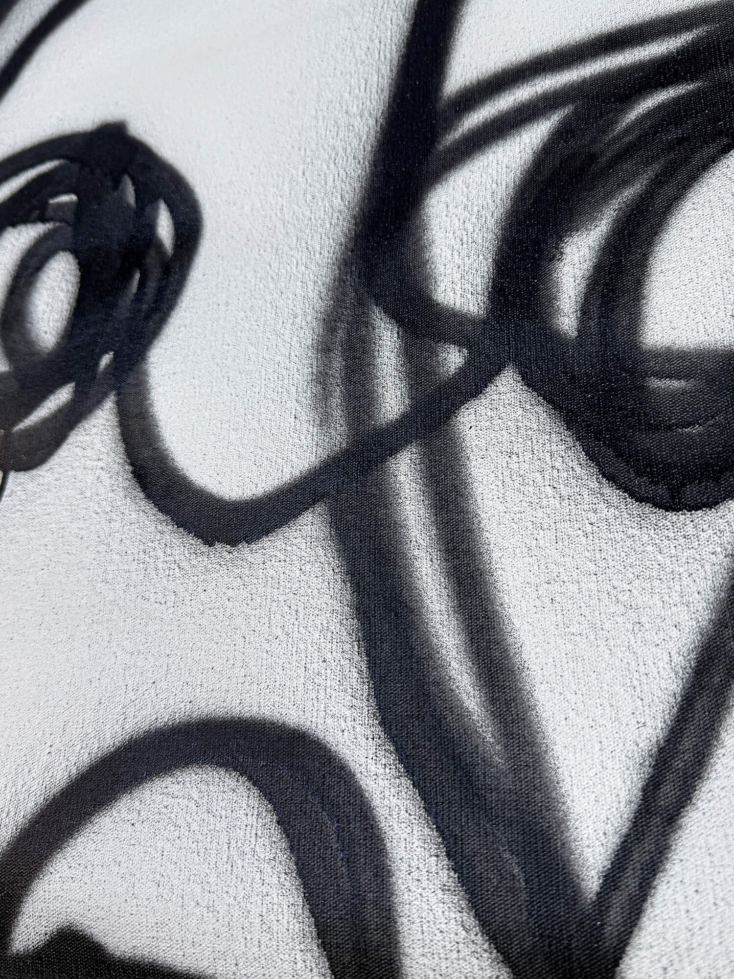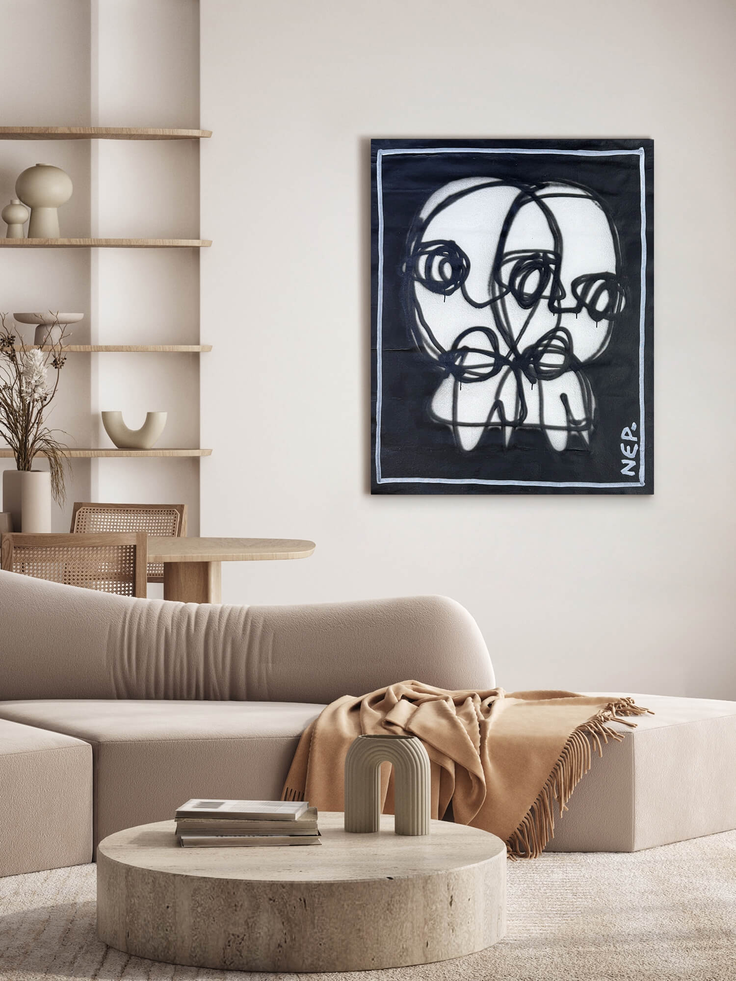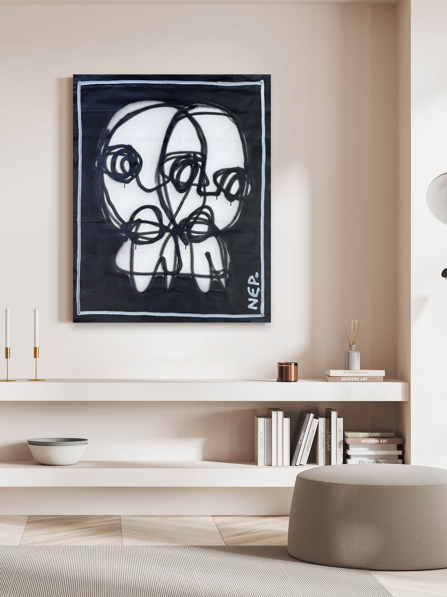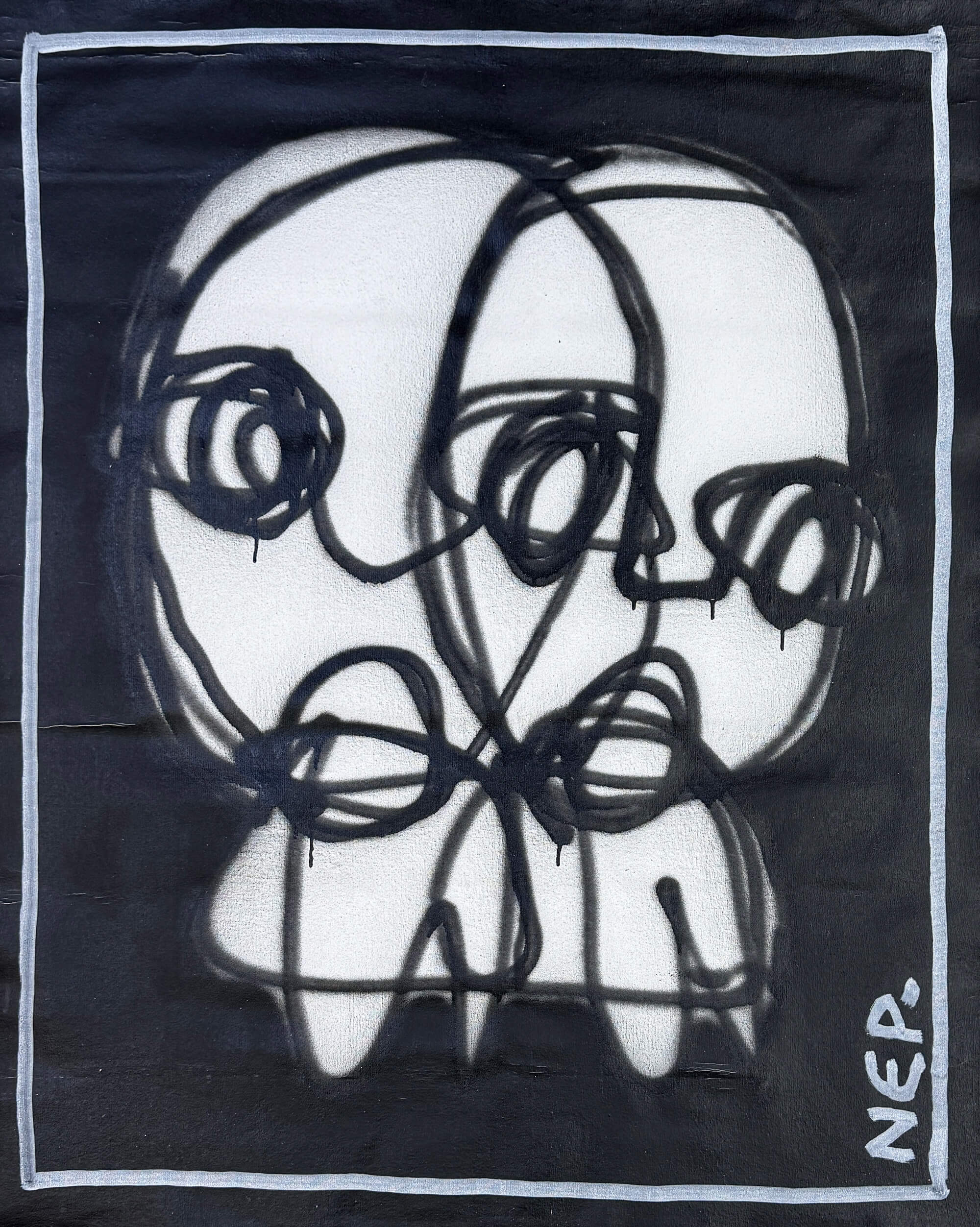 The artwork (Infatigables 4 by Nep )presents a striking monochrome depiction, where bold black lines weave together abstract forms resembling two intertwined figures. Set against a stark white background, the forms are outlined decisively, yet maintain an air of fluidity and motion, as if perpetually in transformation. The minimalist composition is enveloped in a black border, grounding the ethereal figures within a defined space. The artist’s use of dripping lines breaks traditional boundaries, adding a raw, emotive layer to the piece. This approach evokes a sense of immediacy and spontaneity, engaging viewers to interpret the connection between the figures. The signature “NEP” in the corner asserts a personal touch, completing this captivating exploration of identity and relationship through abstract expressionism.