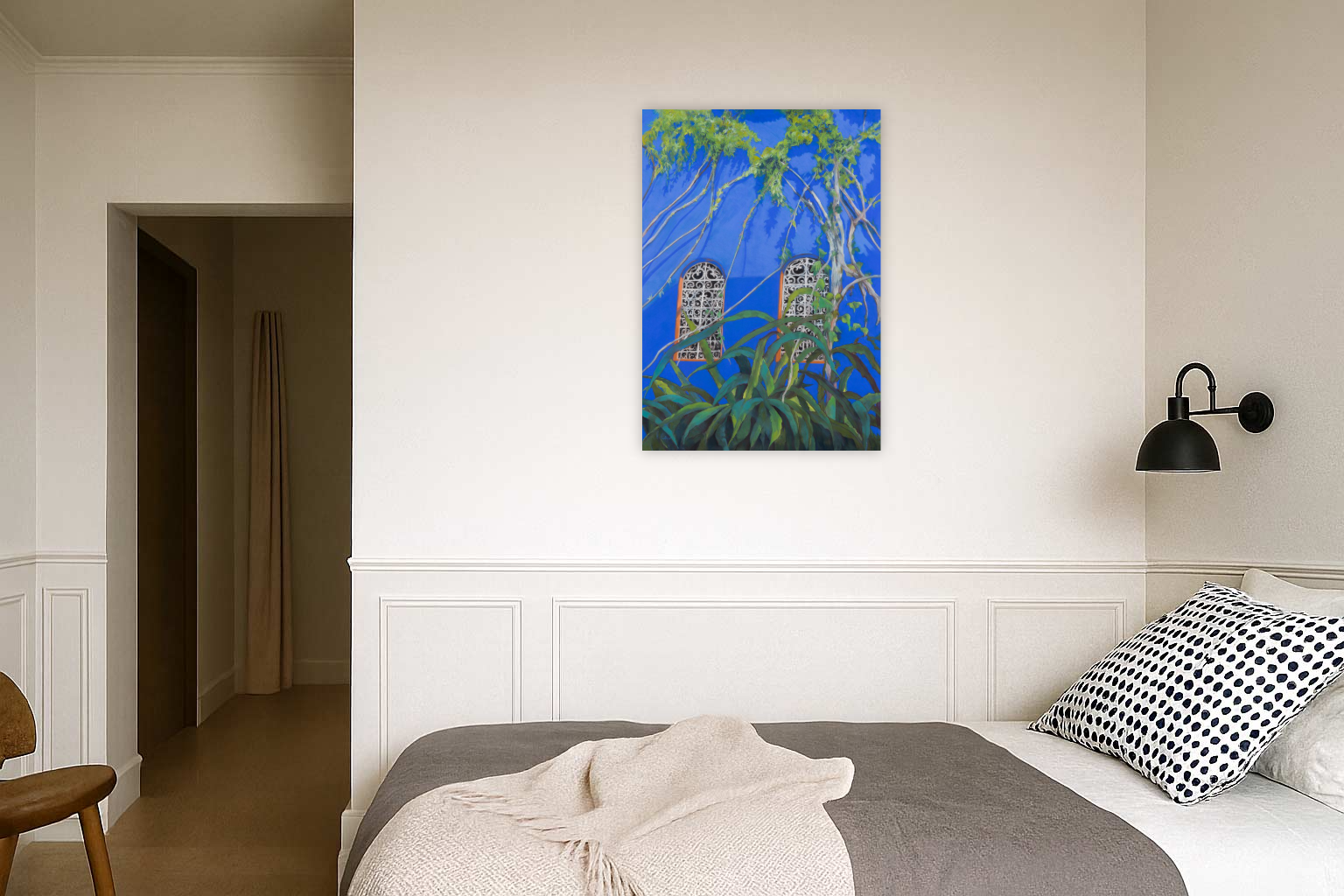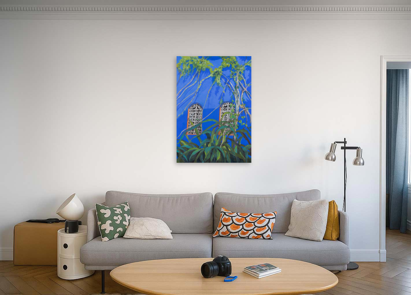 Work of the Majorelle series, this pastel by the choice of the composition and the intense blue, gives a graphic and contemporary vision of this garden with a thousand facets. The arabesques formed by the lianas merge with the volutes of the window grilles, in response to the play of shadow cast on the facade. The work is rigid since it is made on a Pastelmat laminate; it is delivered protected by crystal paper for the pastel and must be placed under glass for its durability and conservation. To be supervised by a professional