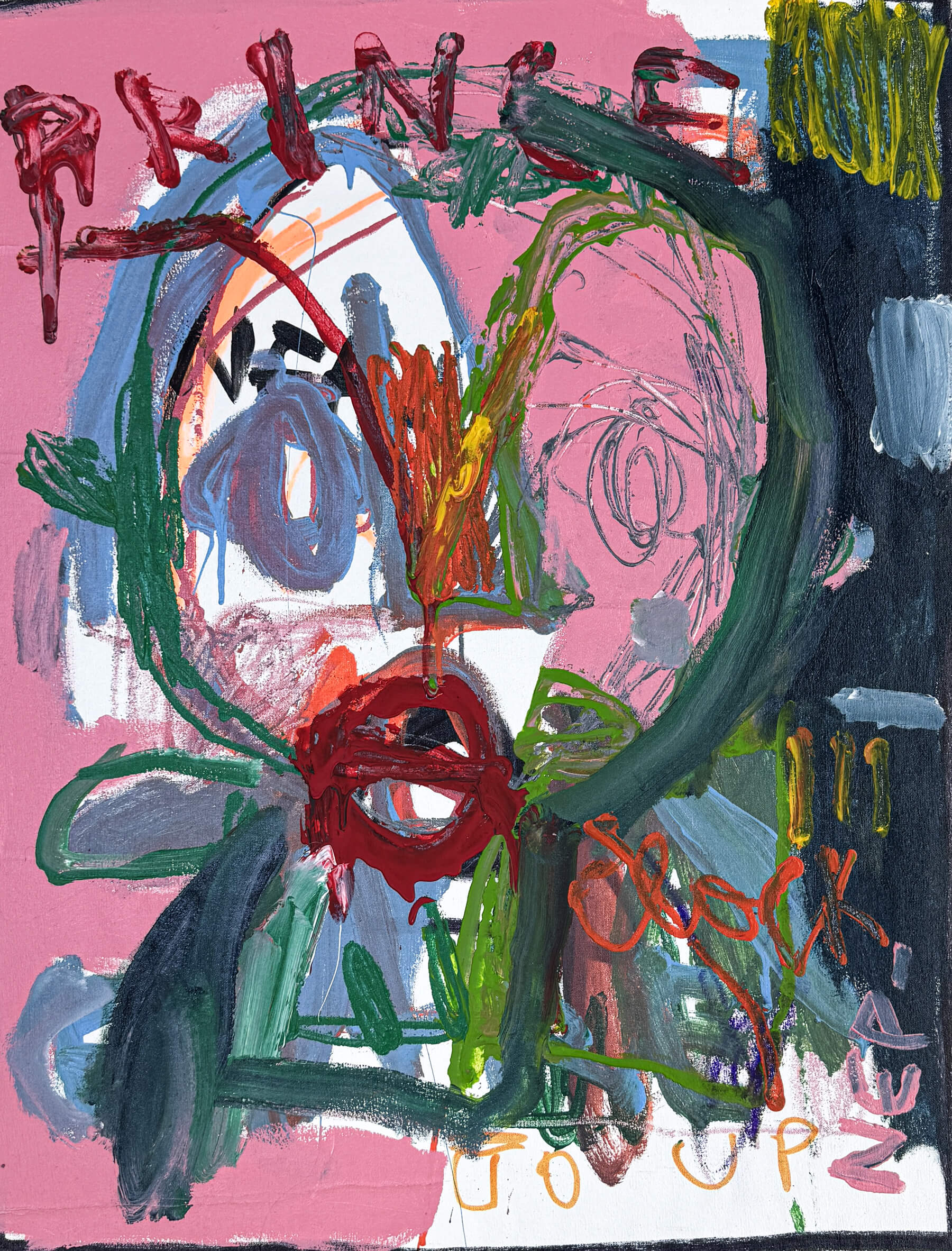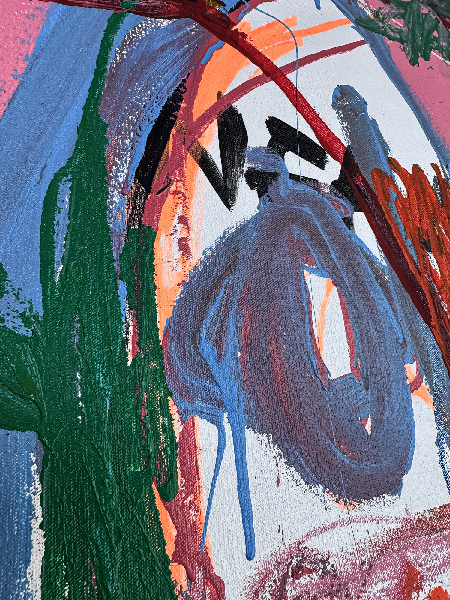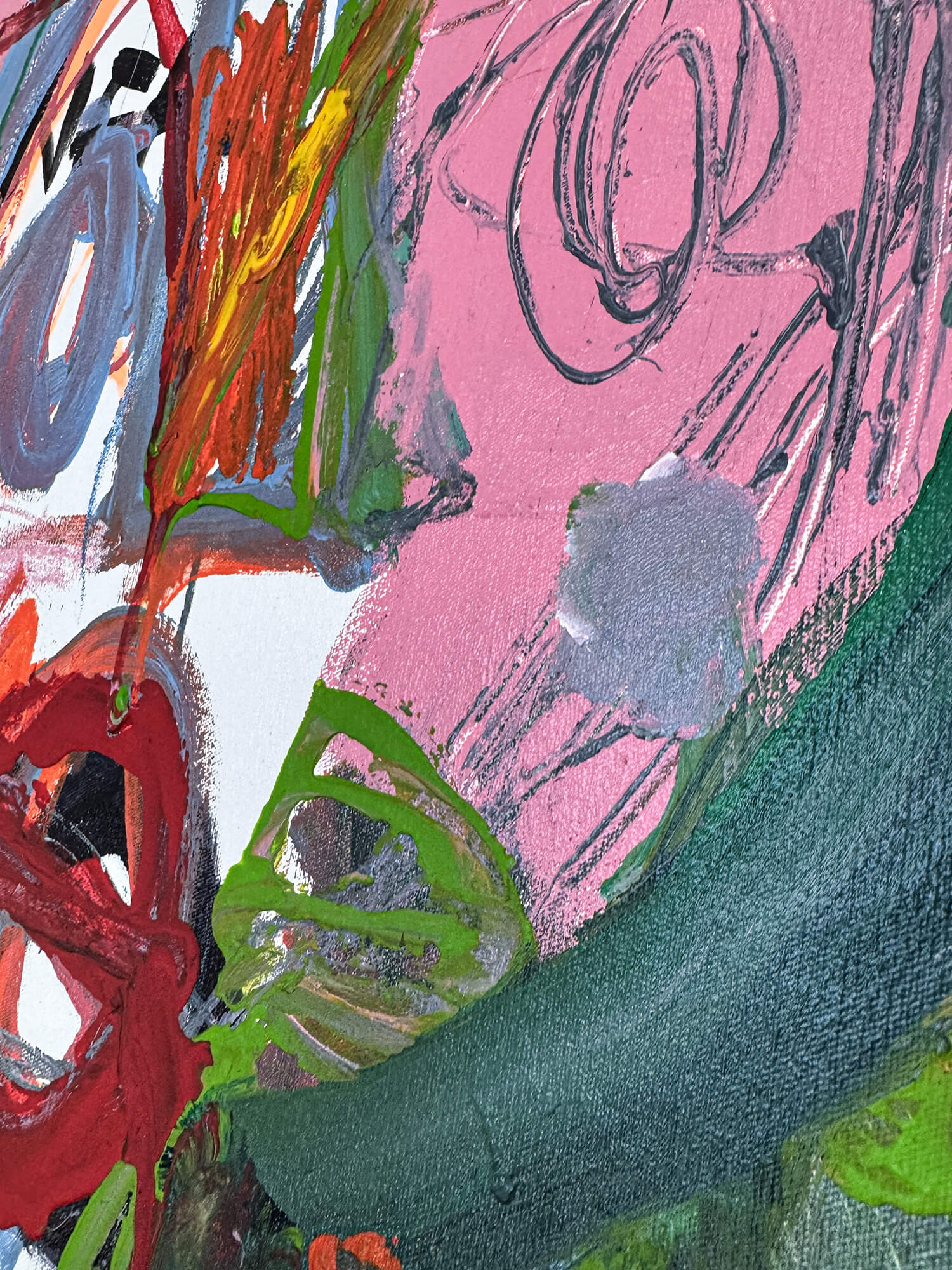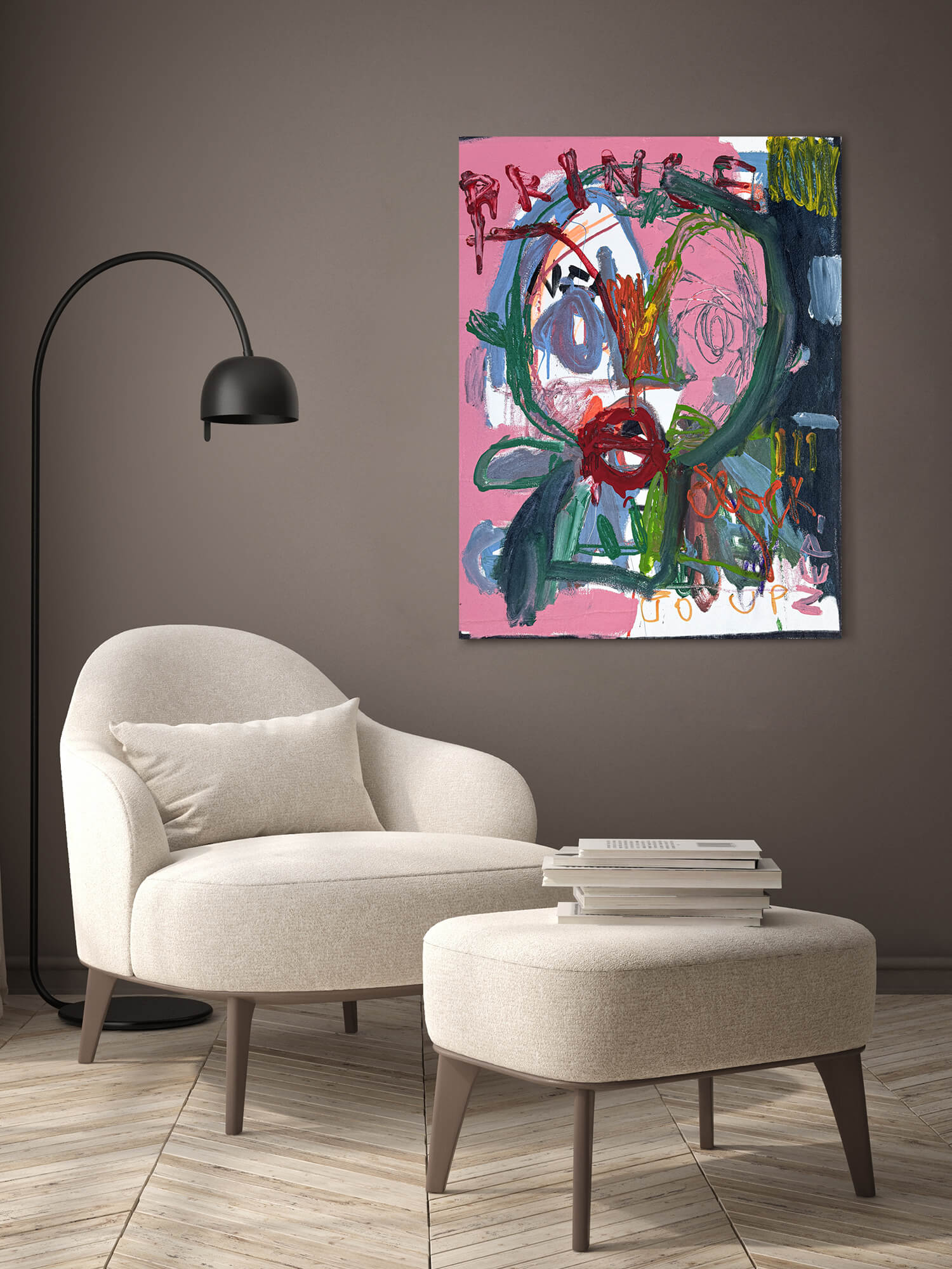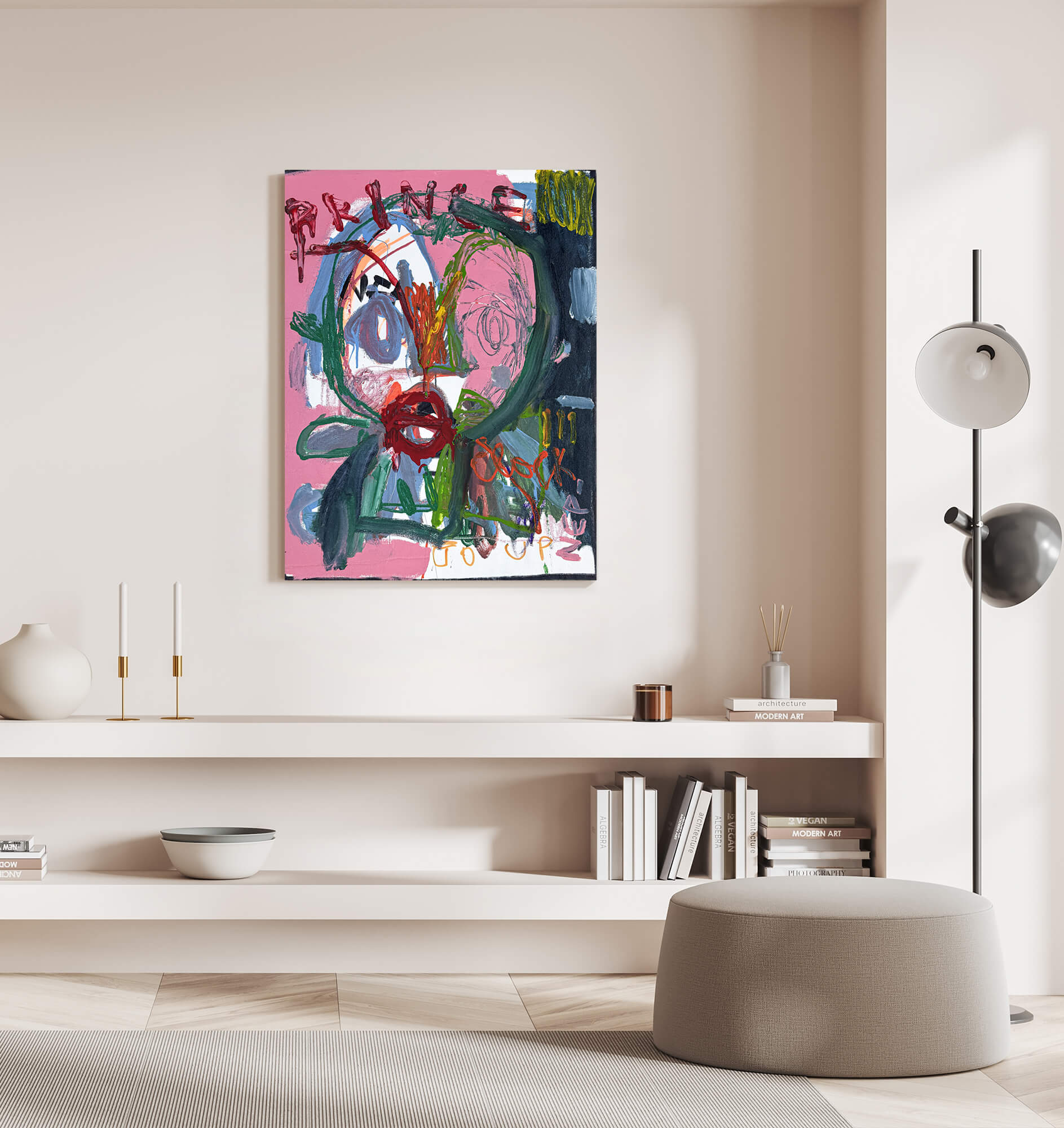 This striking artwork (Juste par principe by Nep) presents an abstract portrait that exudes a raw, emotive energy. Dominated by bold, frenetic strokes, the composition blends vibrant colors like crimson, emerald, and cobalt against a stark pink backdrop. The facial features are distorted and exaggerated, conveying a sense of urgency and intensity. Scribbles and words are scattered across the canvas in red and orange, further enhancing the chaotic vibe. The eyes, disproportionately large and asymmetrical, draw immediate attention, serving as focal points of expression. The word “PRINCE” at the top adds a layer of intrigue and narrative. This piece captures an avant-garde, rebellious spirit, offering a vivid exploration of identity and emotion. The fusion of text and imagery invites the viewer to ponder deeper meanings, making it a compelling piece of contemporary art.