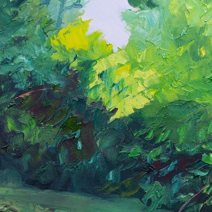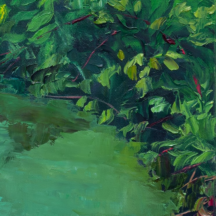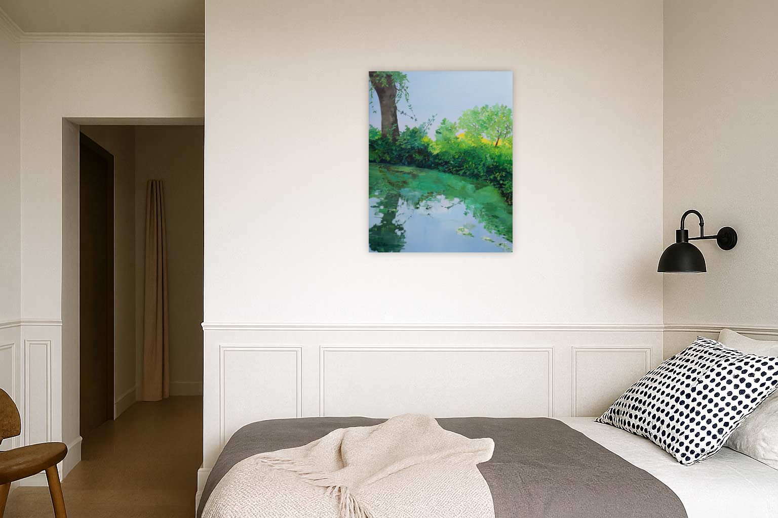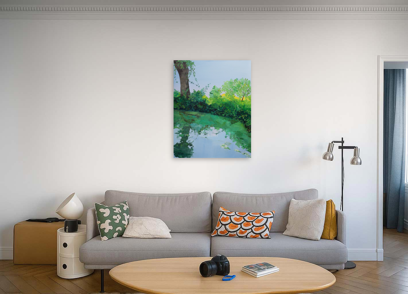 This work depicts a bucolic landscape with remarkable precision and vividness. A peaceful river reflects the verdant hues of the surroundings, creating a soothing symmetry. To the left, a majestic tree rises, its branches adorned with lush foliage, detracting from the depth of the composition. Dense vegetation lines the watercourse, while in the background, trees and a delicate blue sky evoke a bright day. The contrast between the shades of green and the shimmering reflection in the water, inevitably holding the eye, underlines the artist’s mastery of light. The judicious use of colors creates a serene atmosphere and invites contemplation. This painting is distinguished by its ability to capture the tranquility of nature, while offering a visual escape imbued with calm and natural beauty.