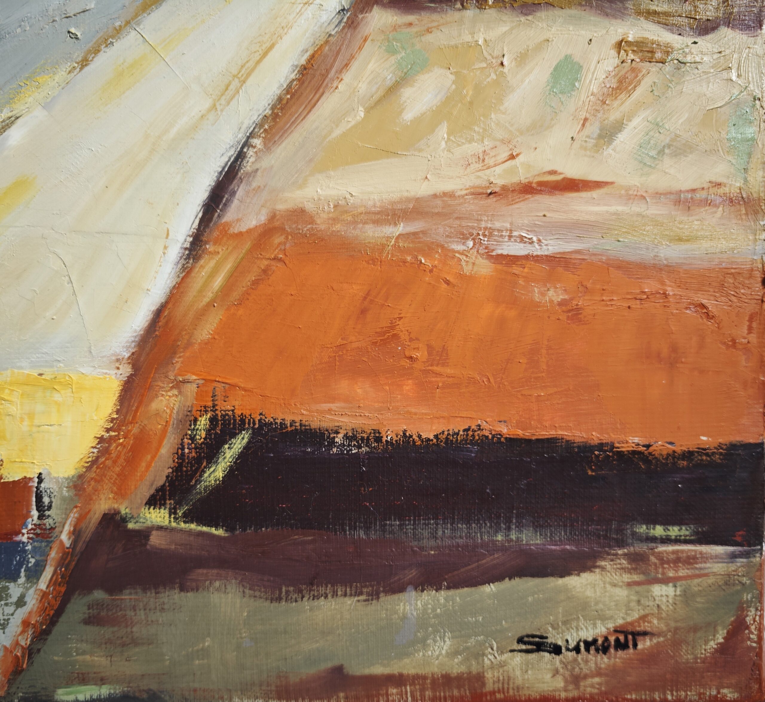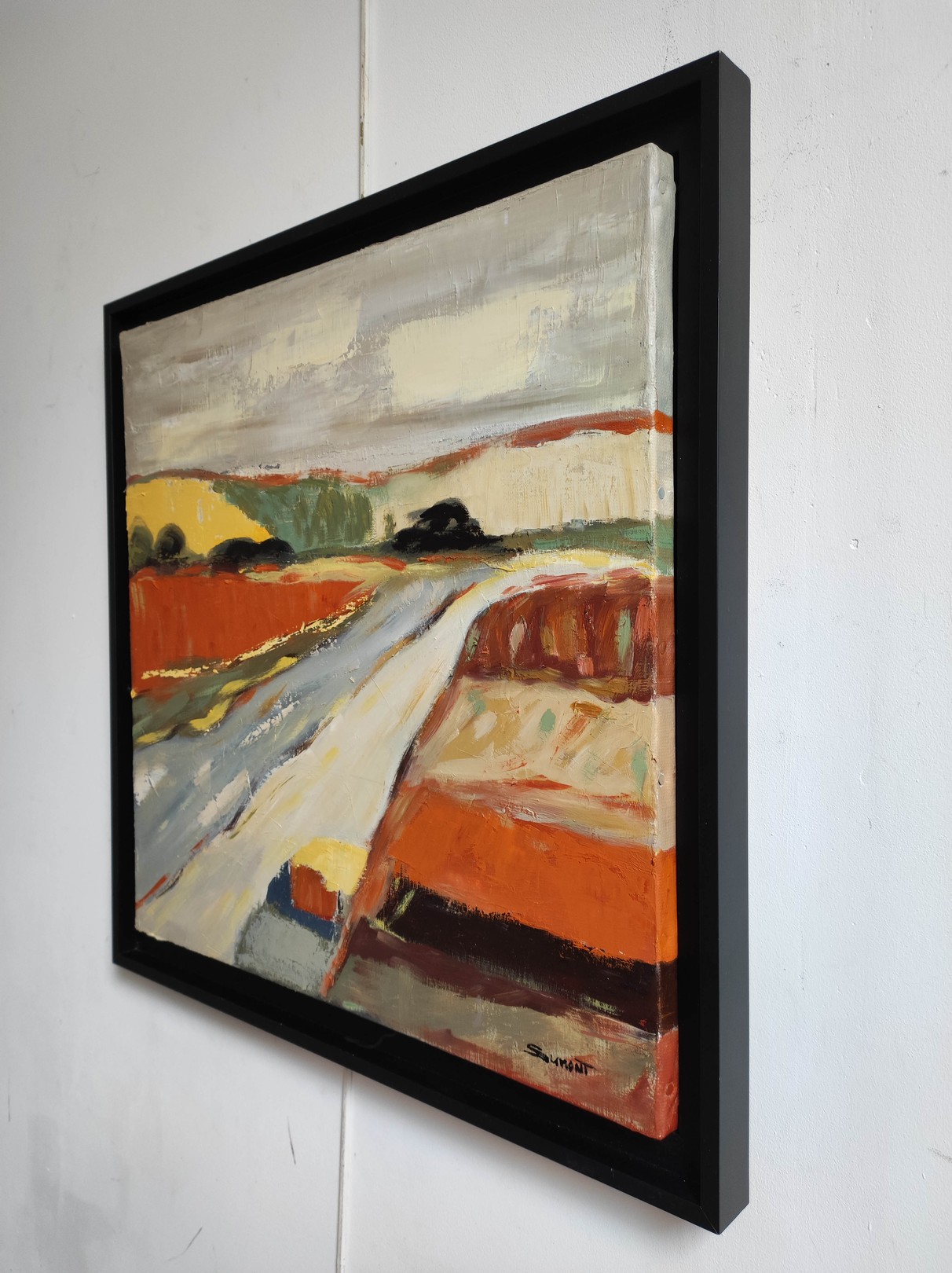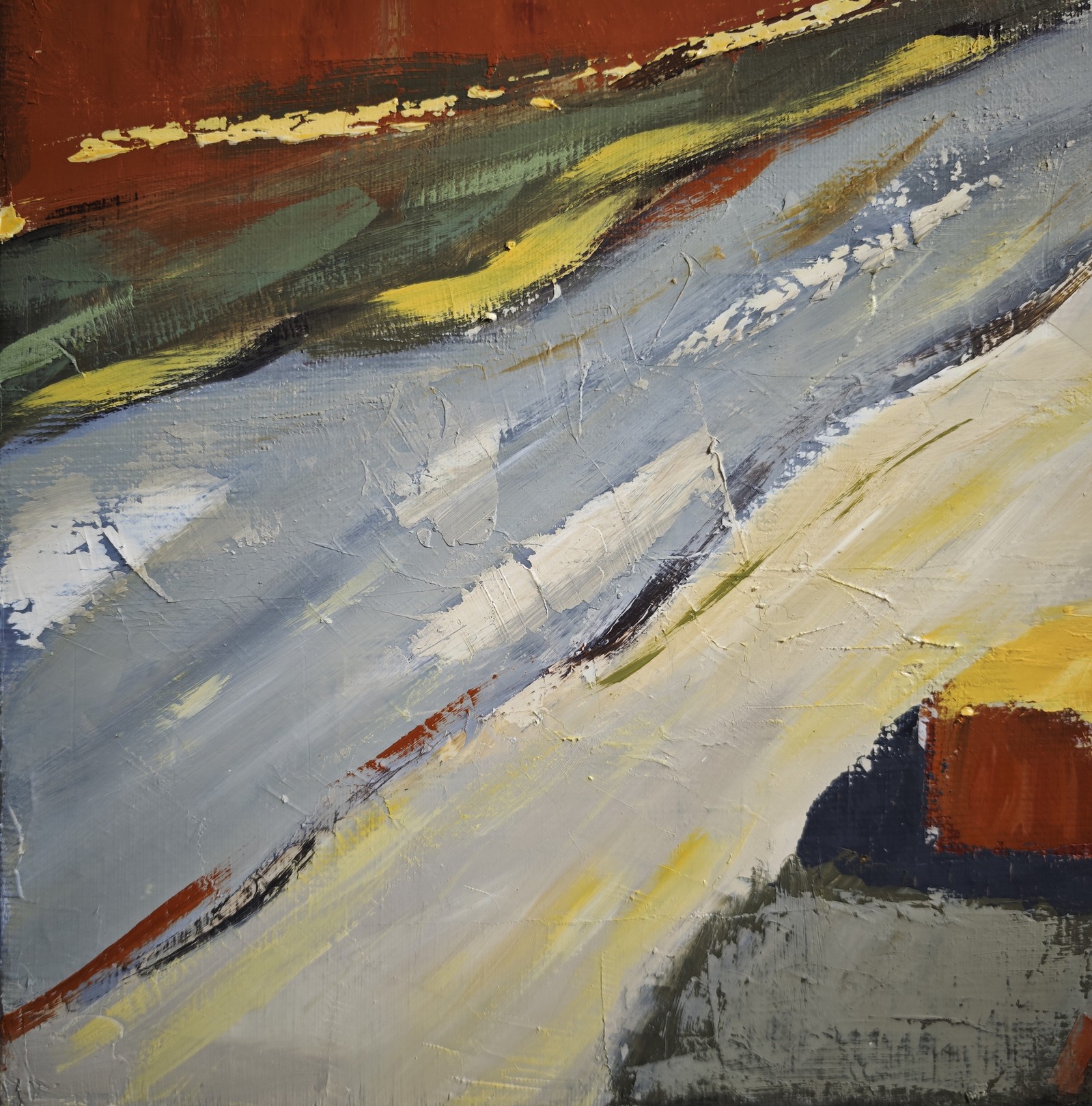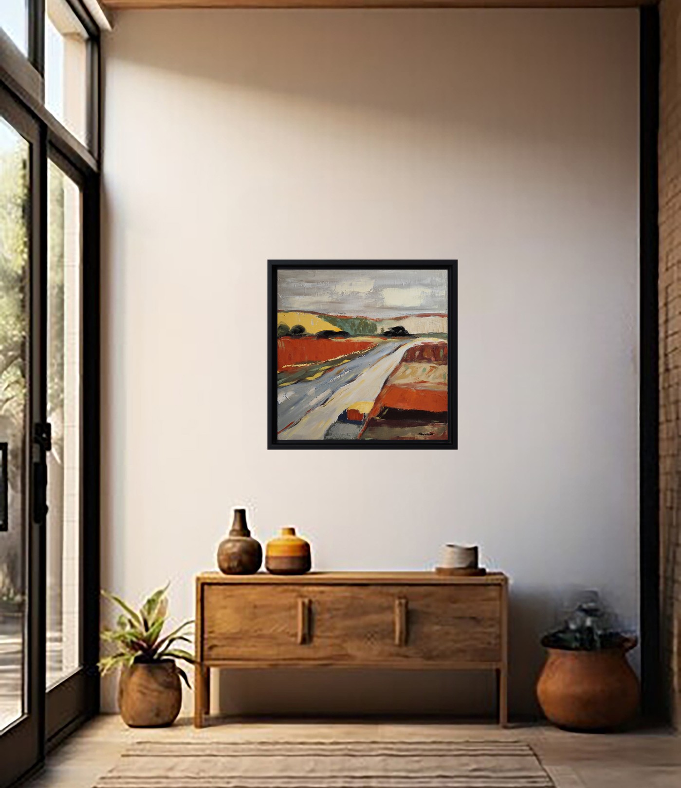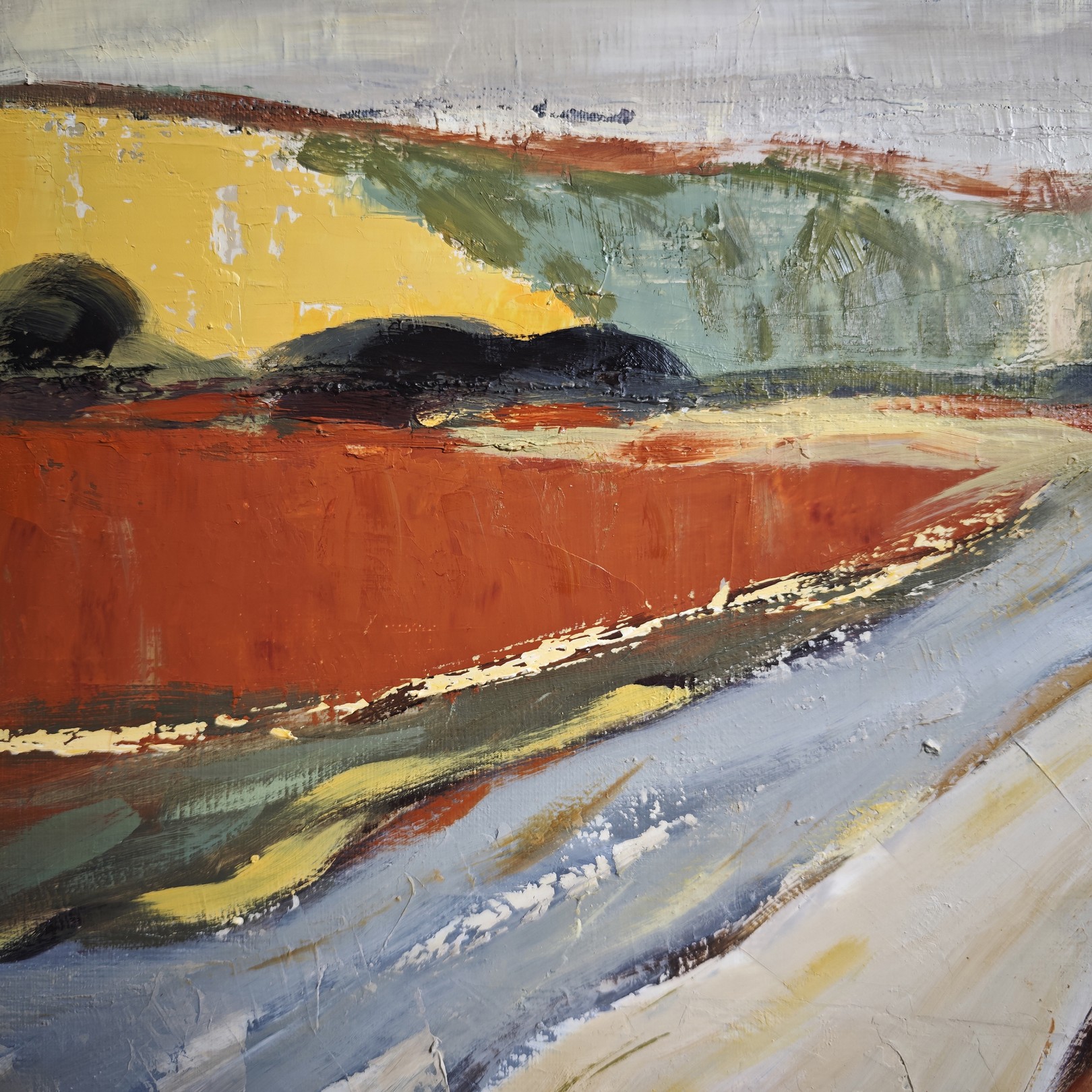 In this work, Sophie Dumont explores a stylized landscape crossed by a clear path that stretches toward the horizon. Here, color becomes sensational: deep reds and burnt earths interact with luminous yellows, muted greens, and milky grays, in a structured yet fluid composition.