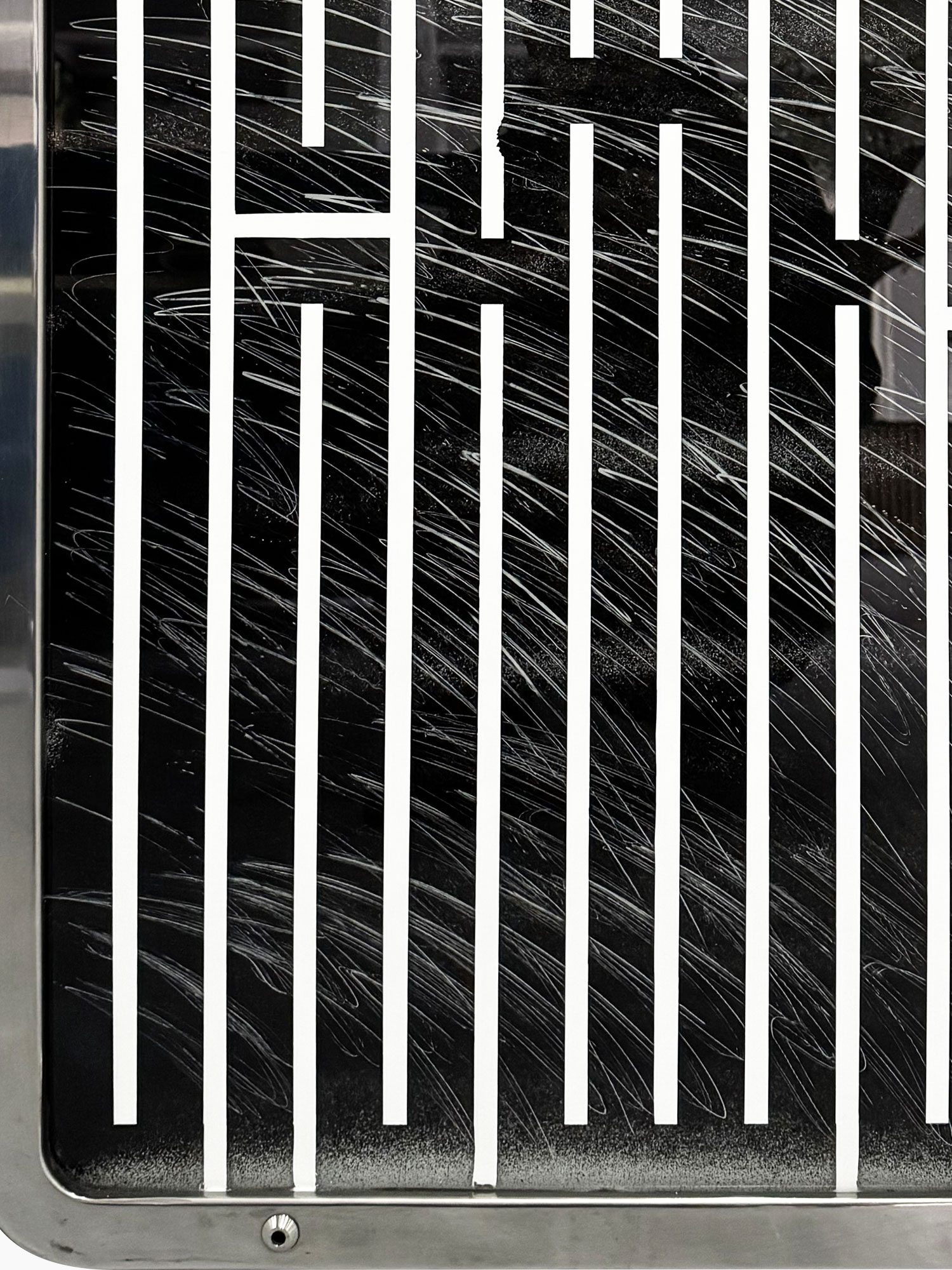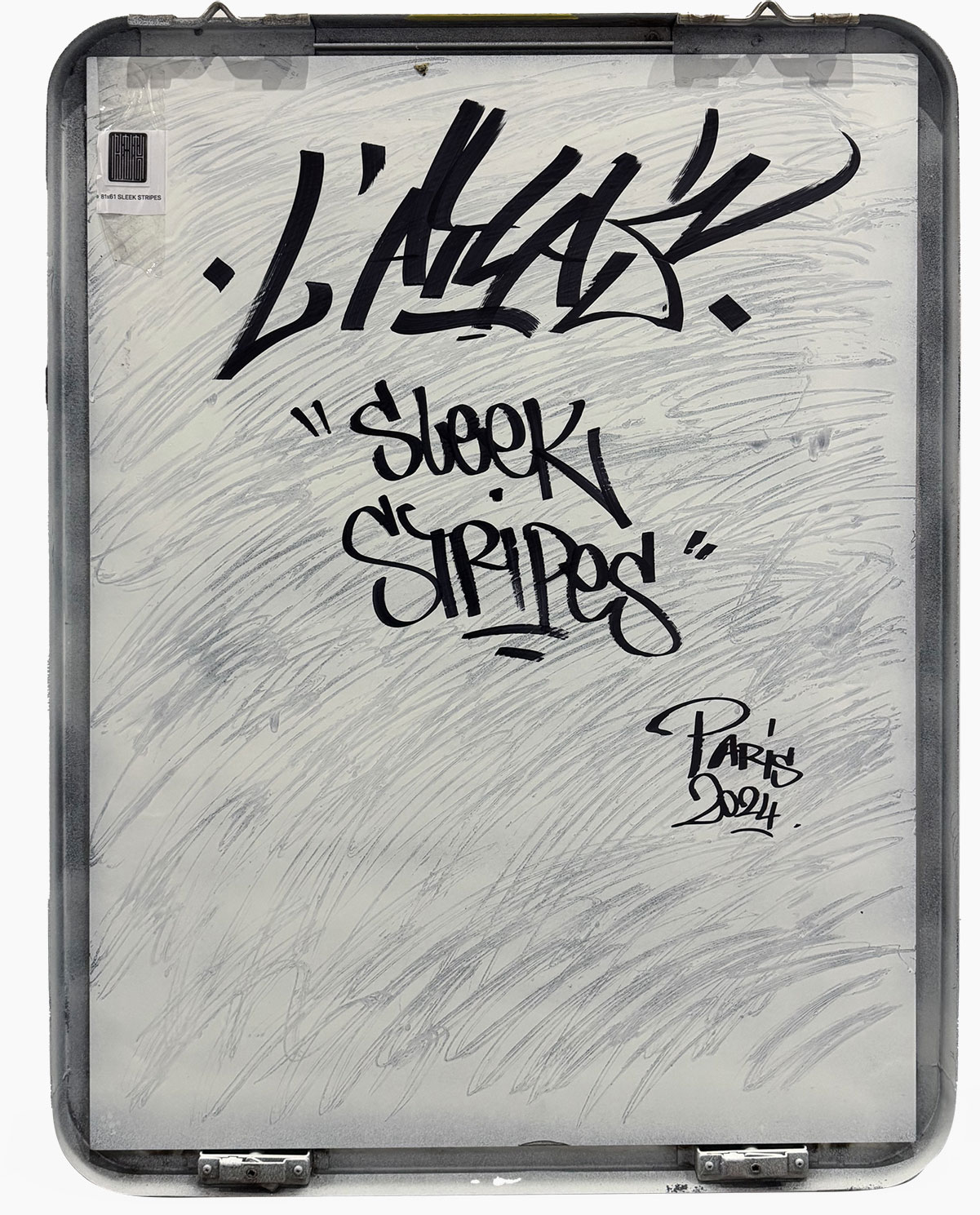"Come As You Are" de L'Atlas est une œuvre provocante qui mêle brillamment son style typographique distinctif à une touche viscérale d'expressionnisme abstrait. Cette œuvre d'art utilise un arrangement austère et structuré de lignes verticales et horizontales recouvertes d'une explosion chaotique de rouges et de noirs, sur un fond gris moucheté qui suggère un sentiment d'agitation et d'intensité.