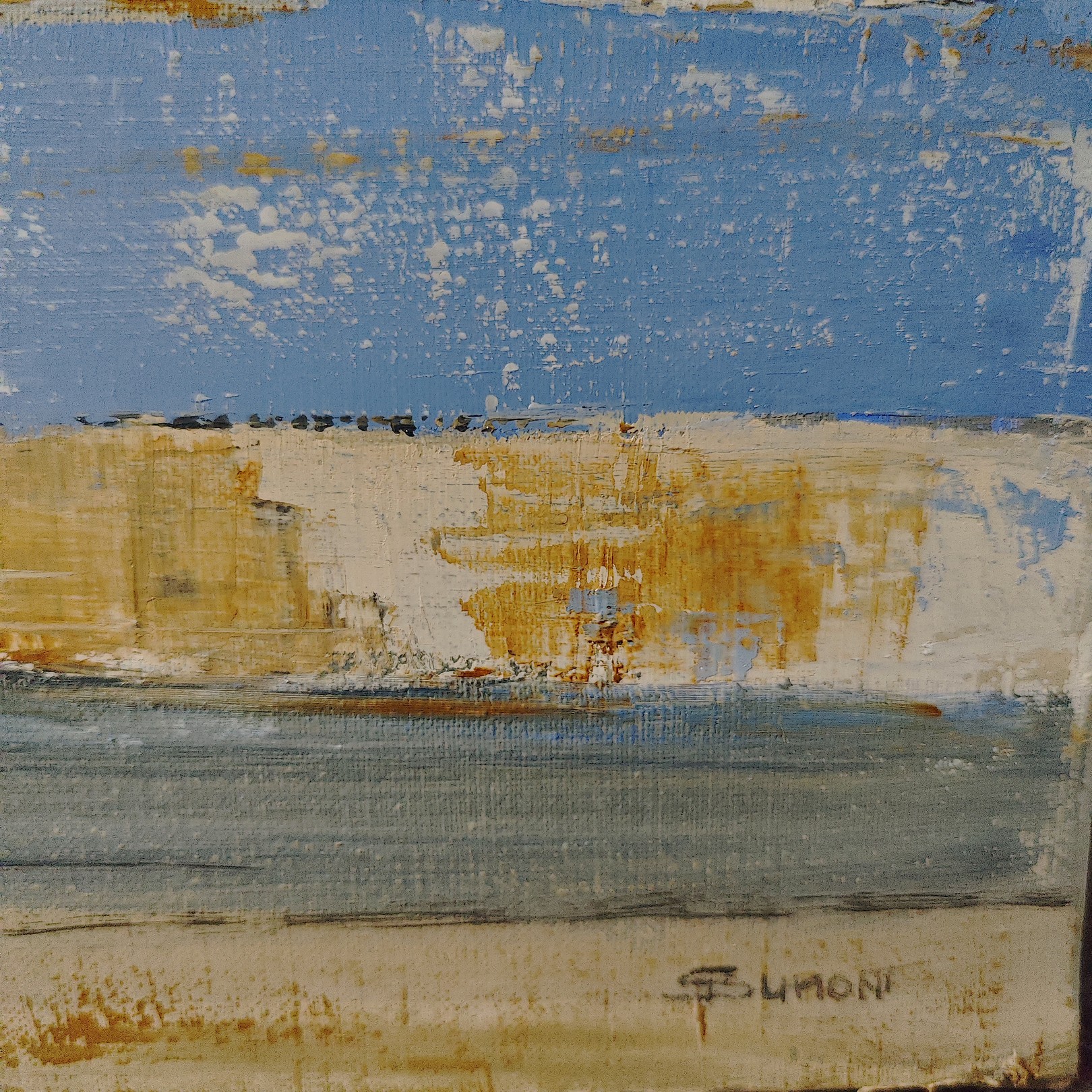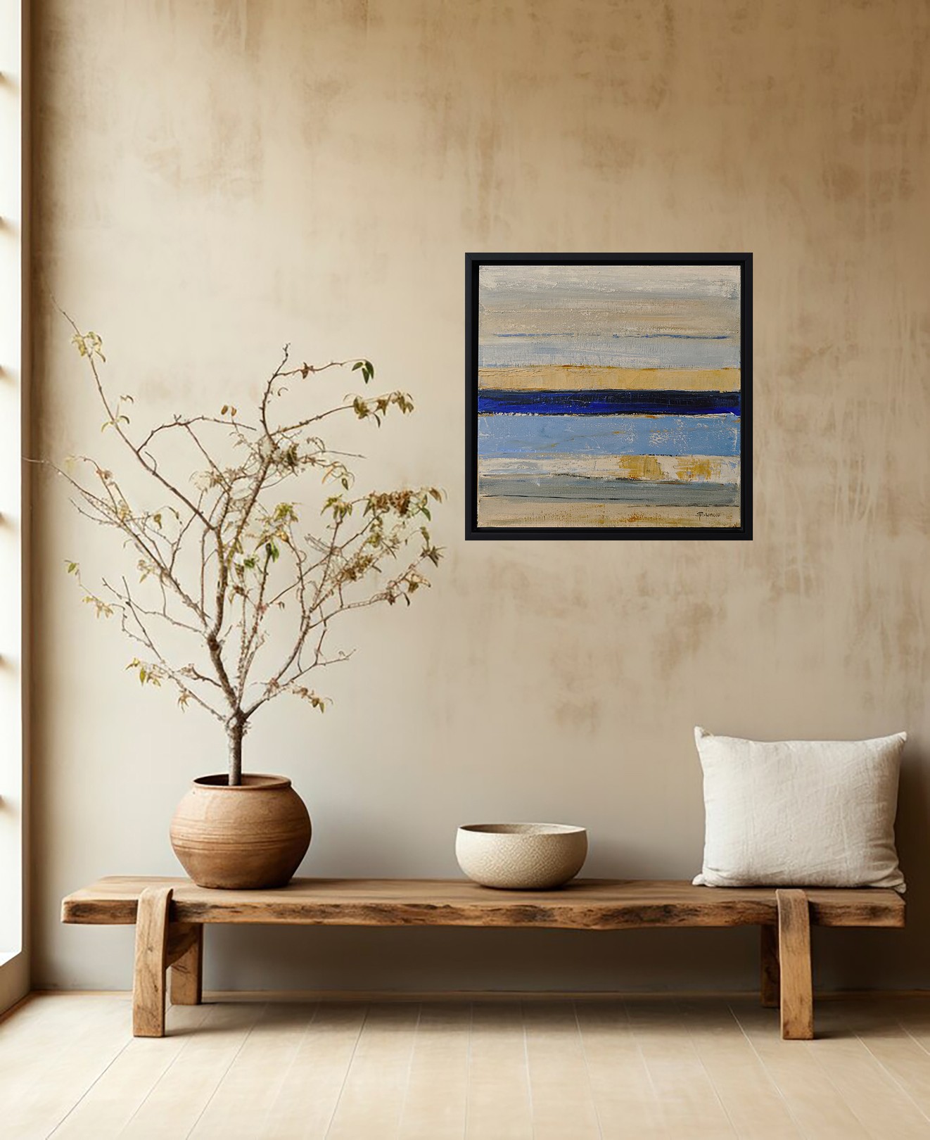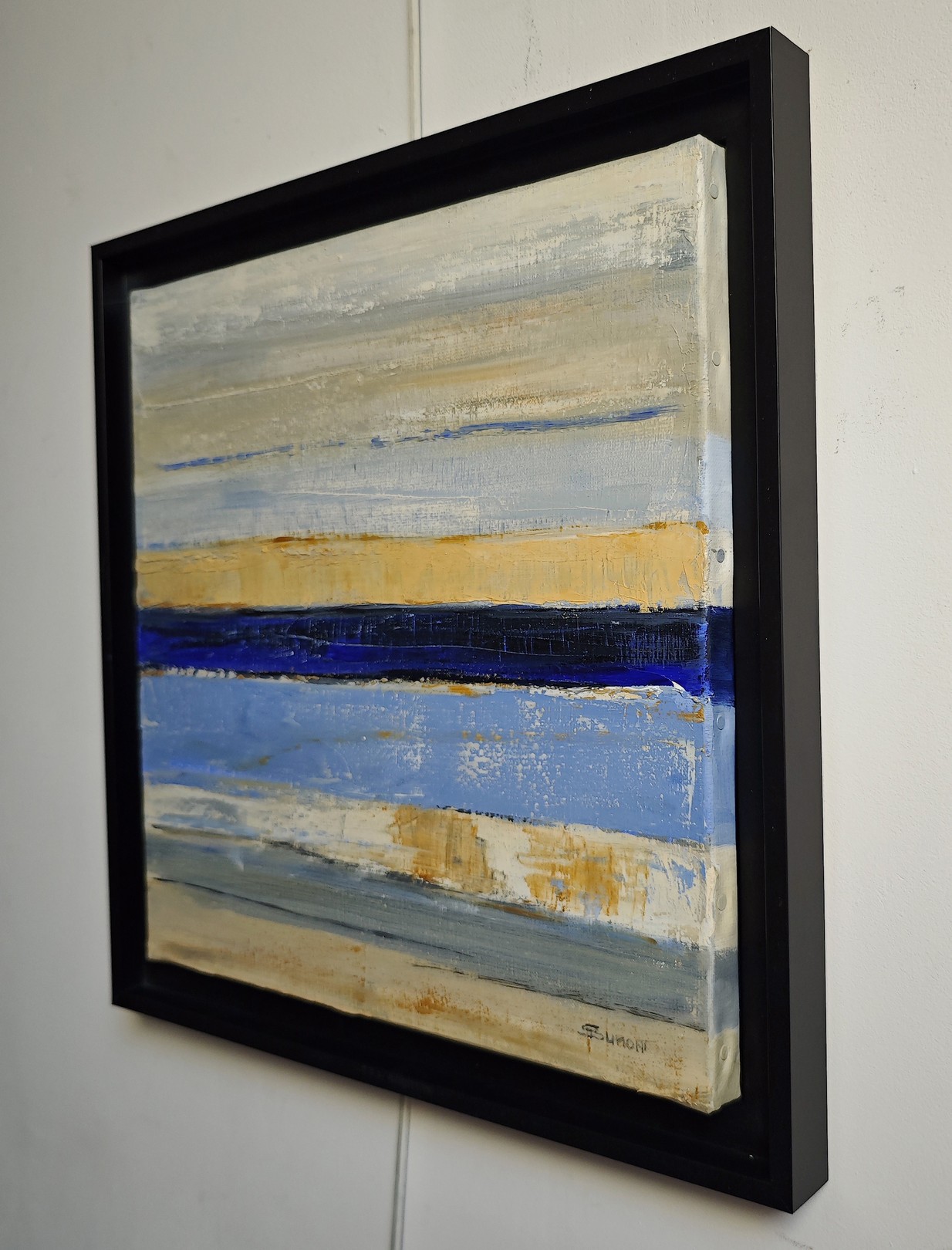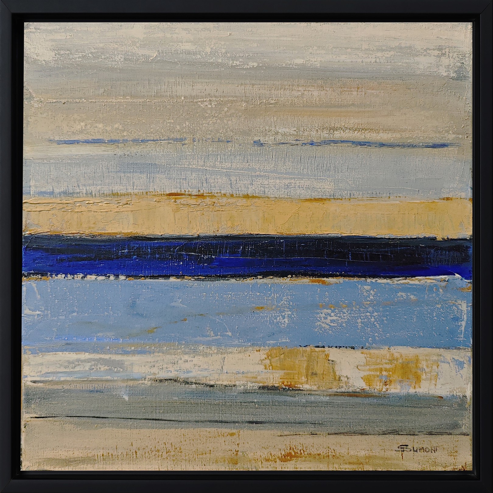 Ce tableau impressionnant se distingue par ses bandes horizontales de couleurs évoquant un paysage marin abstrait. La composition est dominée par des teintes de bleu, beige et sable, créant une harmonie visuelle apaisante. Une ligne centrale d’un bleu profond traverse l’œuvre, suggérant une mer tranquille ou un horizon lointain. Le contraste entre les textures rugueuses et lisses confère une profondeur dynamique, engageant le spectateur à explorer chaque couche. Les nuances subtiles et les coups de pinceau audacieux démontrent une maîtrise technique remarquable, transformant la simplicité apparente en un chef-d’œuvre captivant. L’encadrement noir accentue l’intensité des couleurs, guidant le regard et intensifiant l’expérience immersive. Cet art, à la fois minimaliste et riche en émotion, capture l’essence d’une sérénité naturelle et invite à la contemplation.