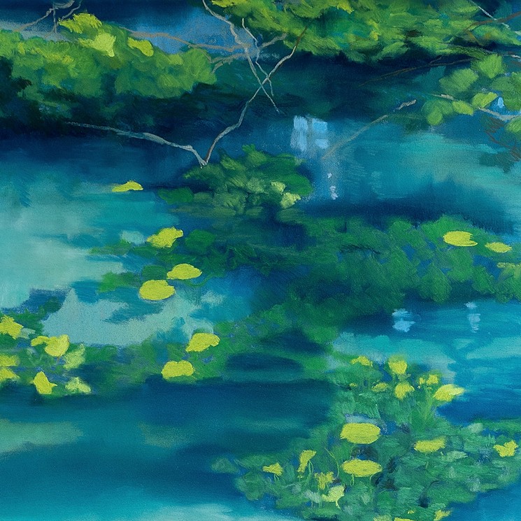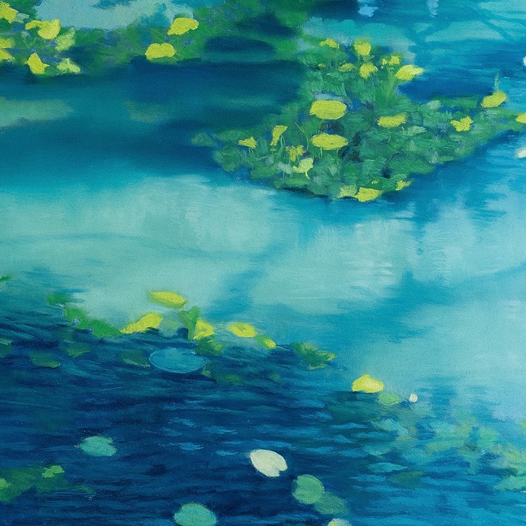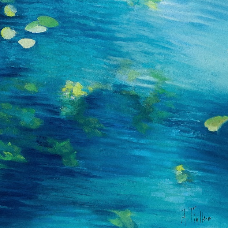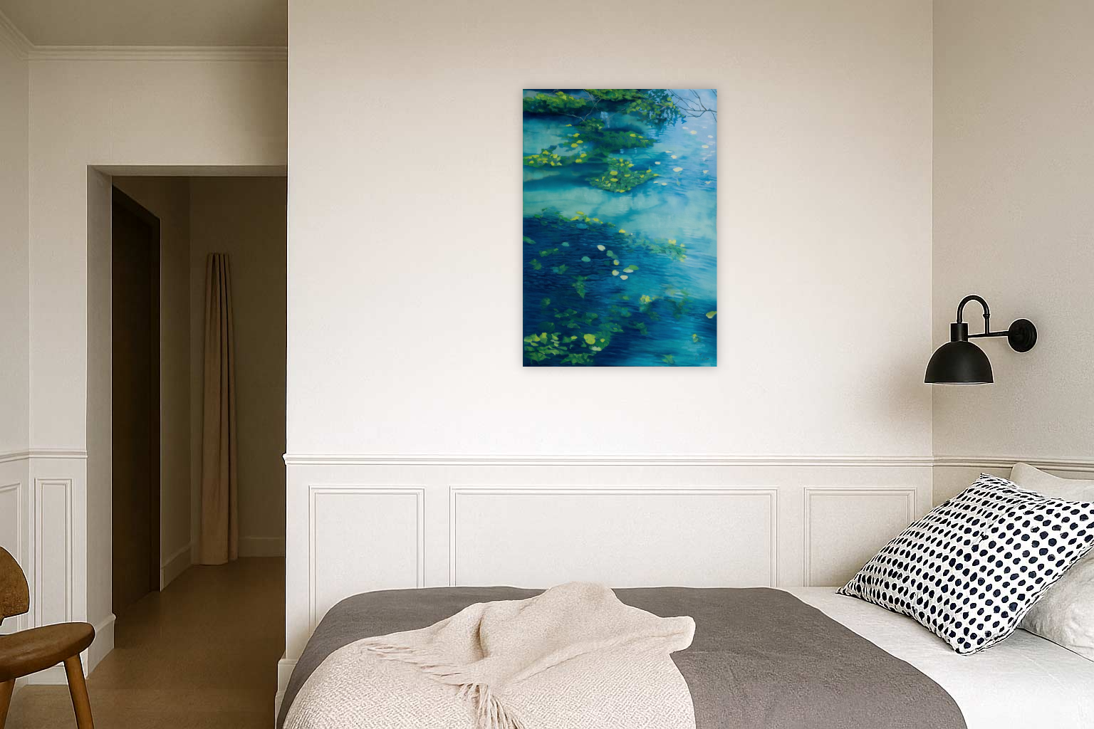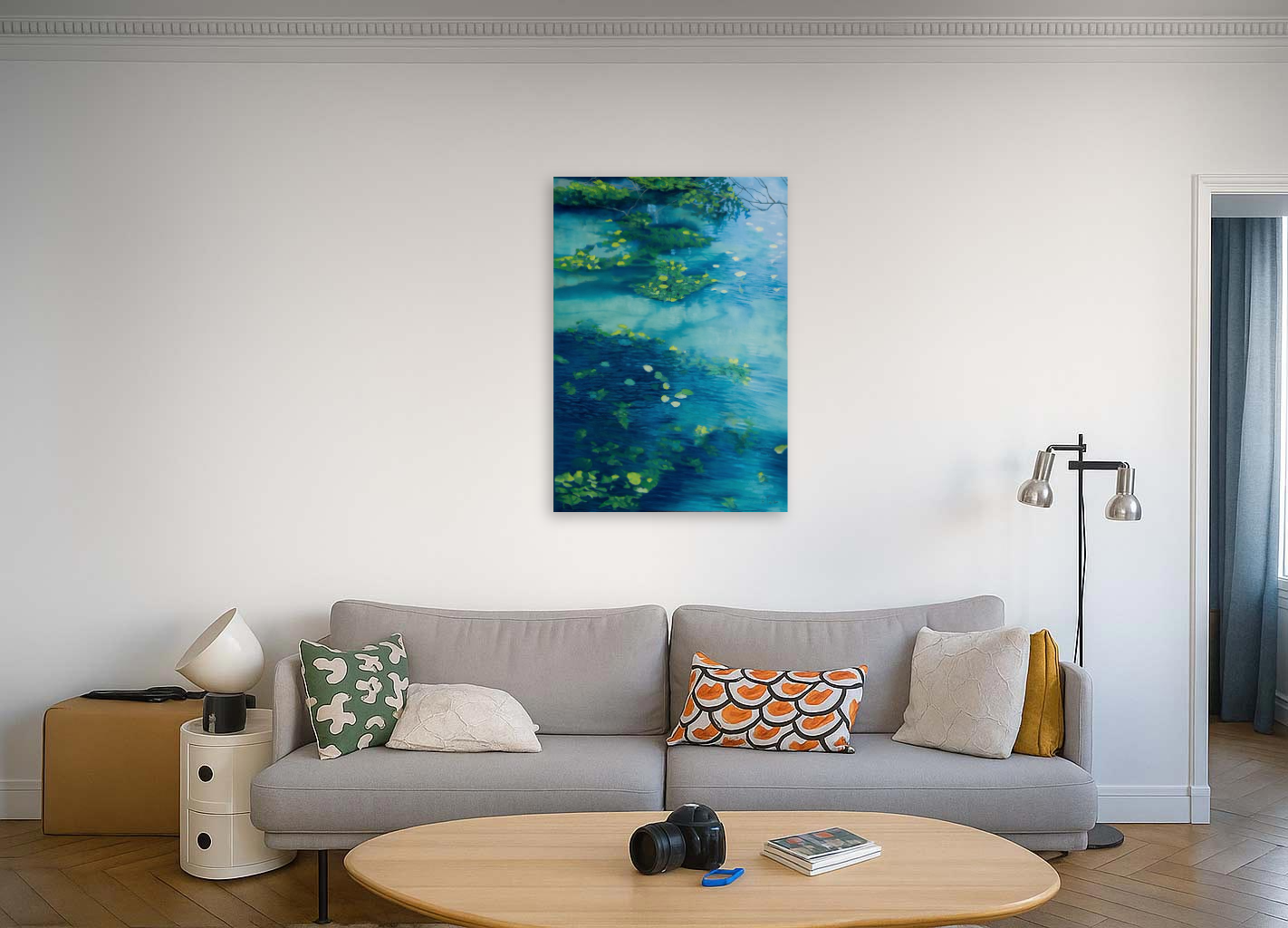 This captivating work evokes a serene pond where shades of blue and green harmoniously meet. The artist masters the use of light to create shimmering reflections on the water, bringing to life a peaceful and immersive scene. The leaves floating on the surface add an organic dynamic, their careful arrangement guiding the eye through the depth of the composition. The subtly varied tones capture the transparency and delicate movement of the water, giving the whole an almost dreamlike quality. Branches discreetly intrude into the frame, anchoring the scene in a tangible reality while reinforcing its natural, wild aspect. This work is distinguished by its ability to transport the viewer to a place of calm and reflection, where nature is magnified in all its ethereal splendor.