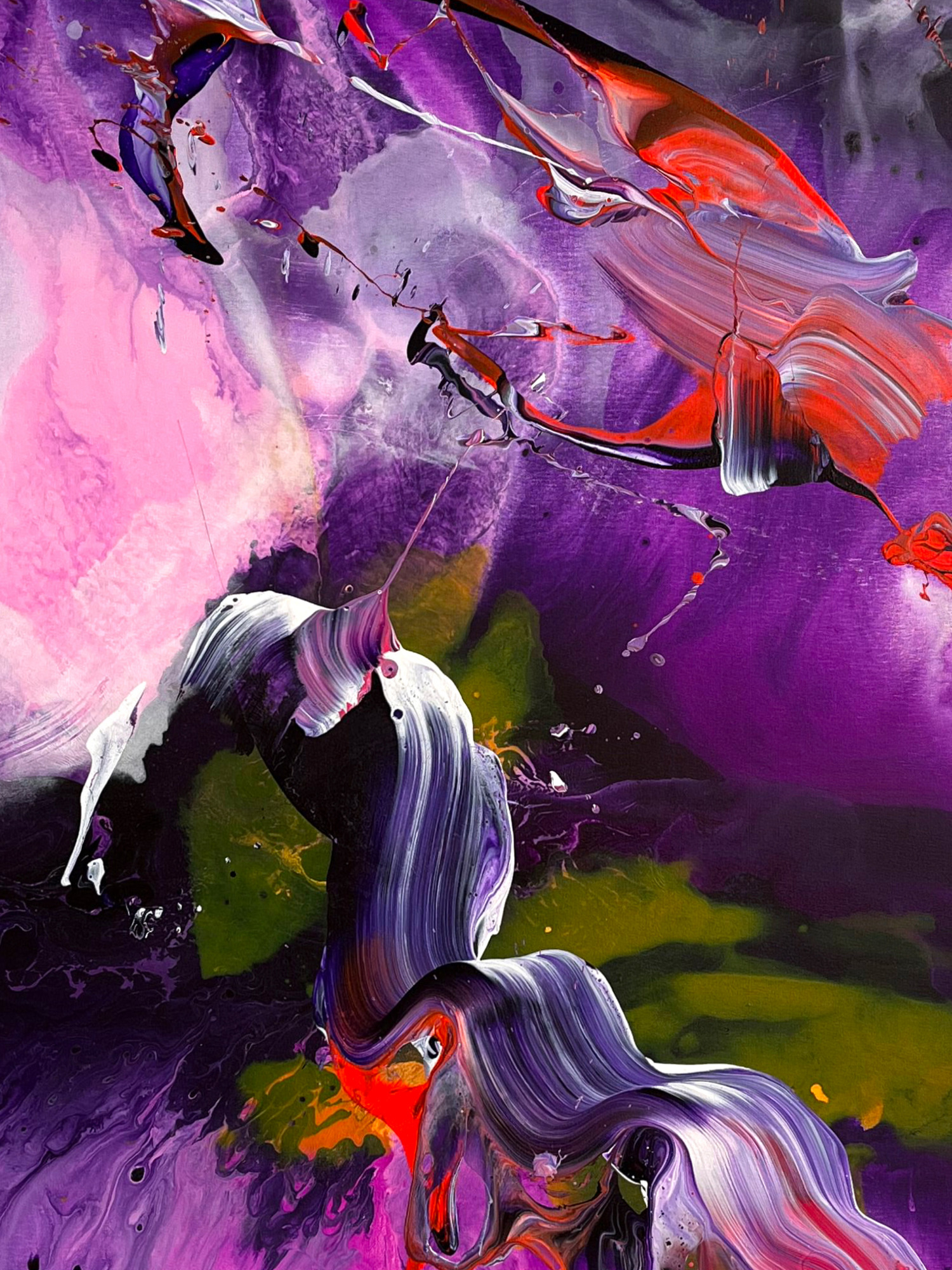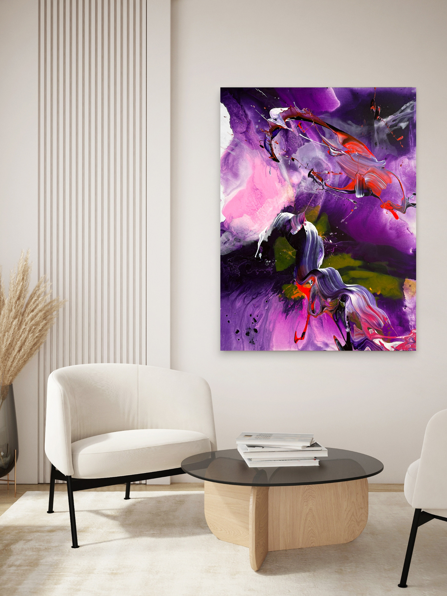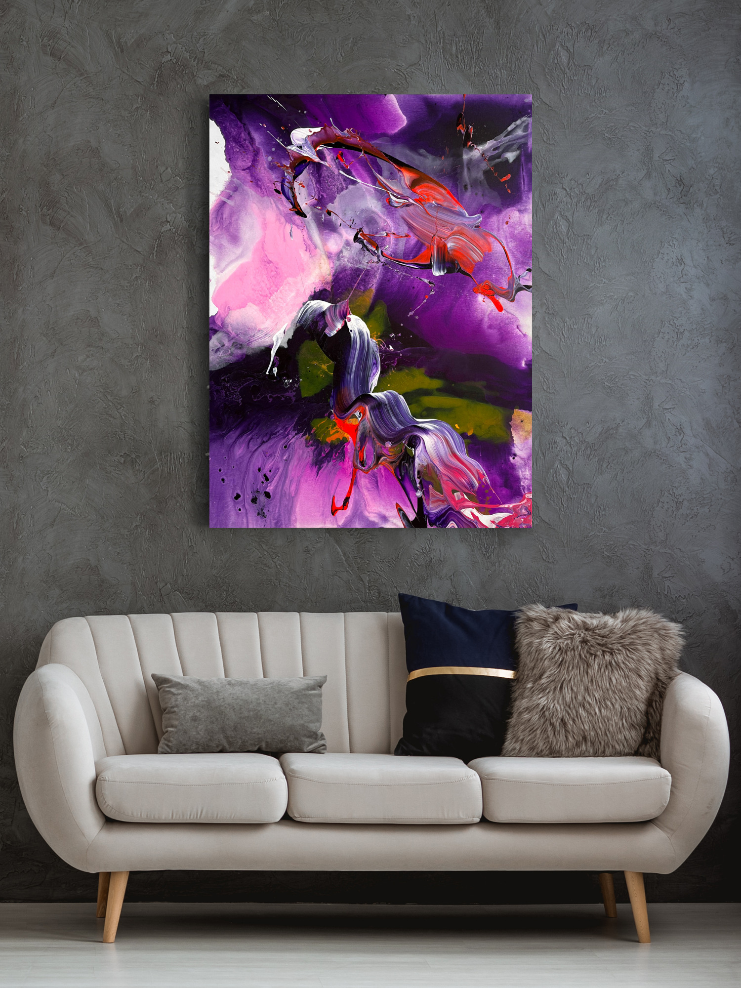 Schizas uses abstrait techniques to blur the line between structure and spontaneity. The palette is a study in contrast, deep, moody undertones interrupted by bursts of coloré vibrancy that seem to break through like moments of clarity amid the chaos. The brushwork carries a raw urgency, layering motion upon motion, leaving behind traces of movement that feel almost alive. This grande taille piece doesn’t just exist in a space; it reshapes it, demanding attention and interpretation.