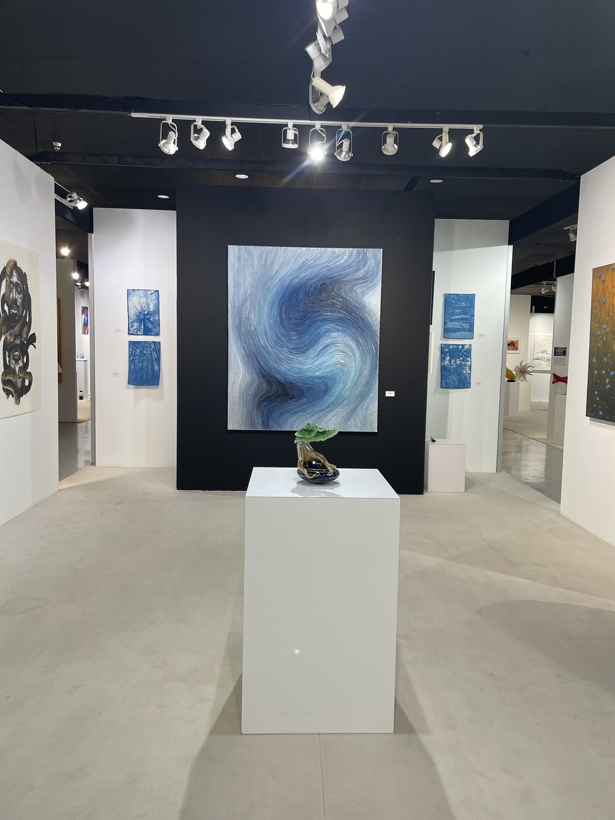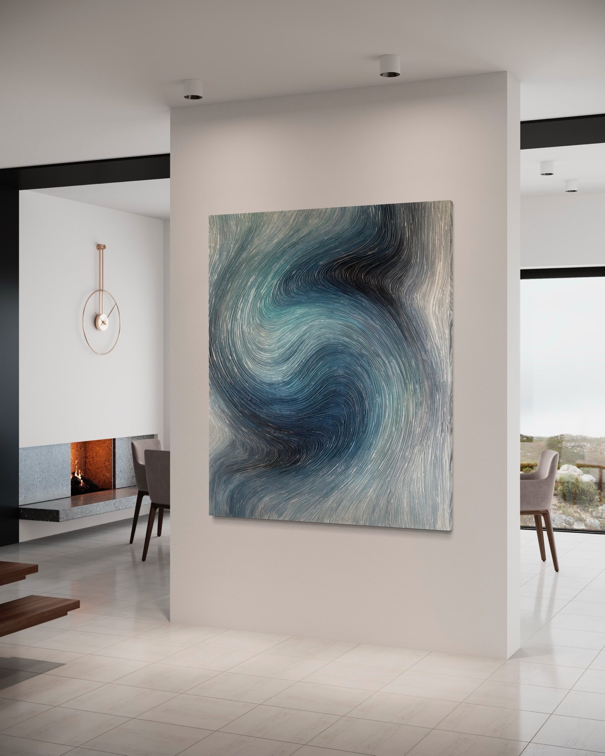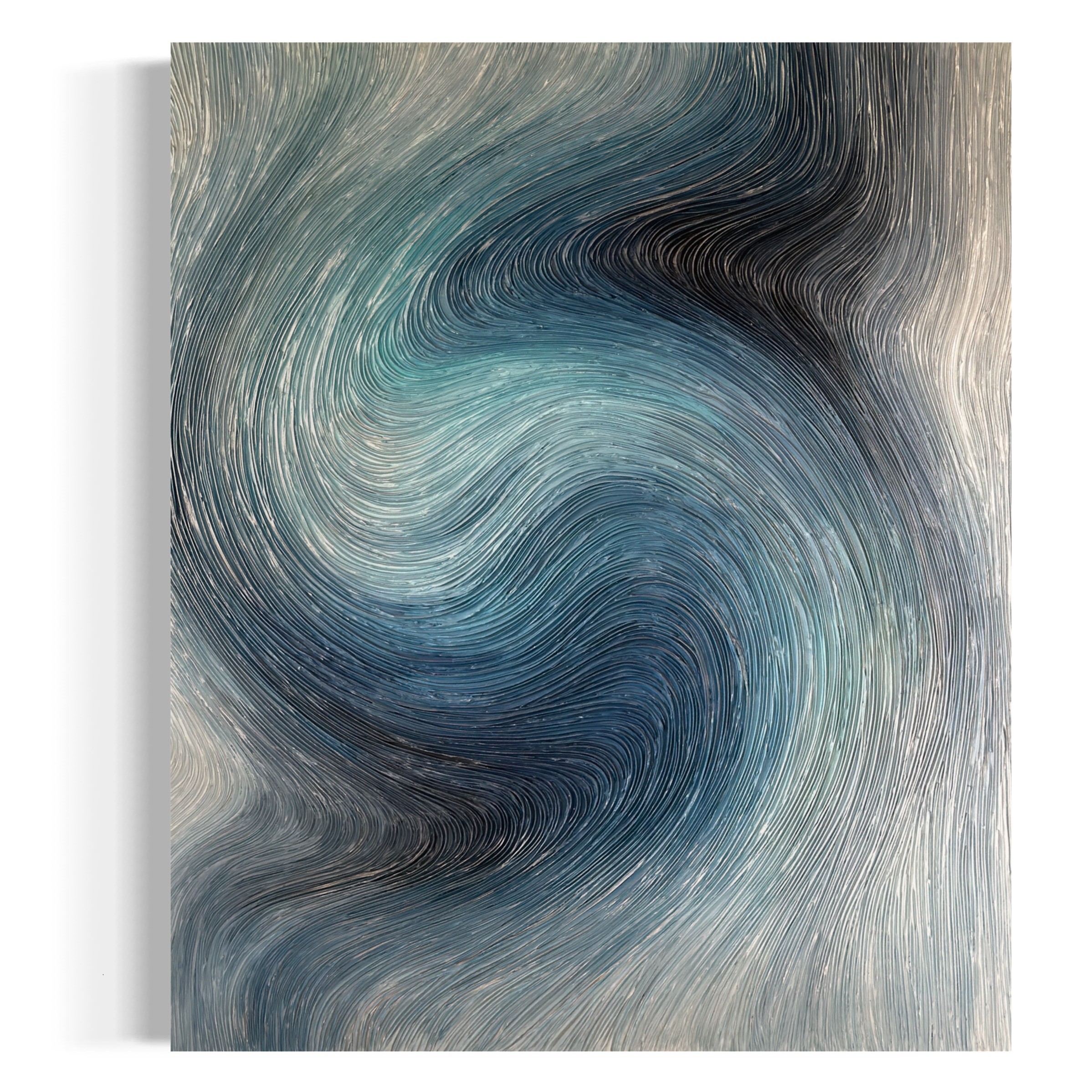 This artwork is a mesmerizing abstract piece characterized by undulating, swirling patterns in shades of blue, gray, and black. The intricate lines flow with rhythmic precision, creating a dynamic sense of movement and depth. The artist skillfully uses gradient shading to evoke a feeling of fluidity, as if the viewer is witnessing the gentle ebb and flow of waves or the swirls of a powerful vortex. The interplay of light and dark tones adds an element of mystery and intrigue, drawing the viewer into the composition. Its hypnotic allure lies in the meticulous layering of textures and the seamless transition between hues, offering a serene yet intense visual experience. This piece stands out for its ability to convey movement and emotion through abstract forms, making it a striking and thought-provoking work of art.