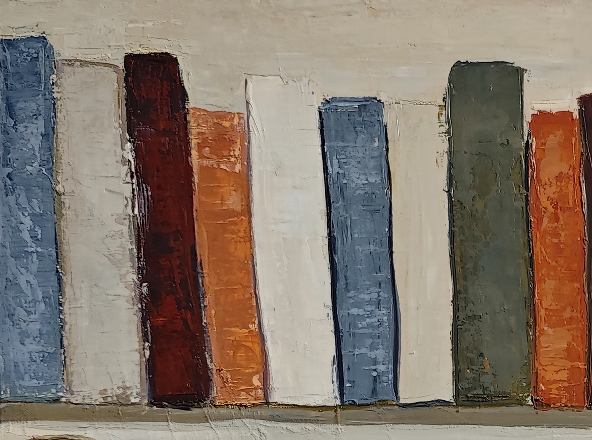 Through exclusively oil painting with a knife, Sophie Dumont creates a book architecture that is both refined and vibrant, where each volume becomes a trace of thought rather than a simple represented object. The layers of color—soft ochres, deep indigos, muted grays, orange bursts—exude a feeling of inhabited, almost meditative calm.