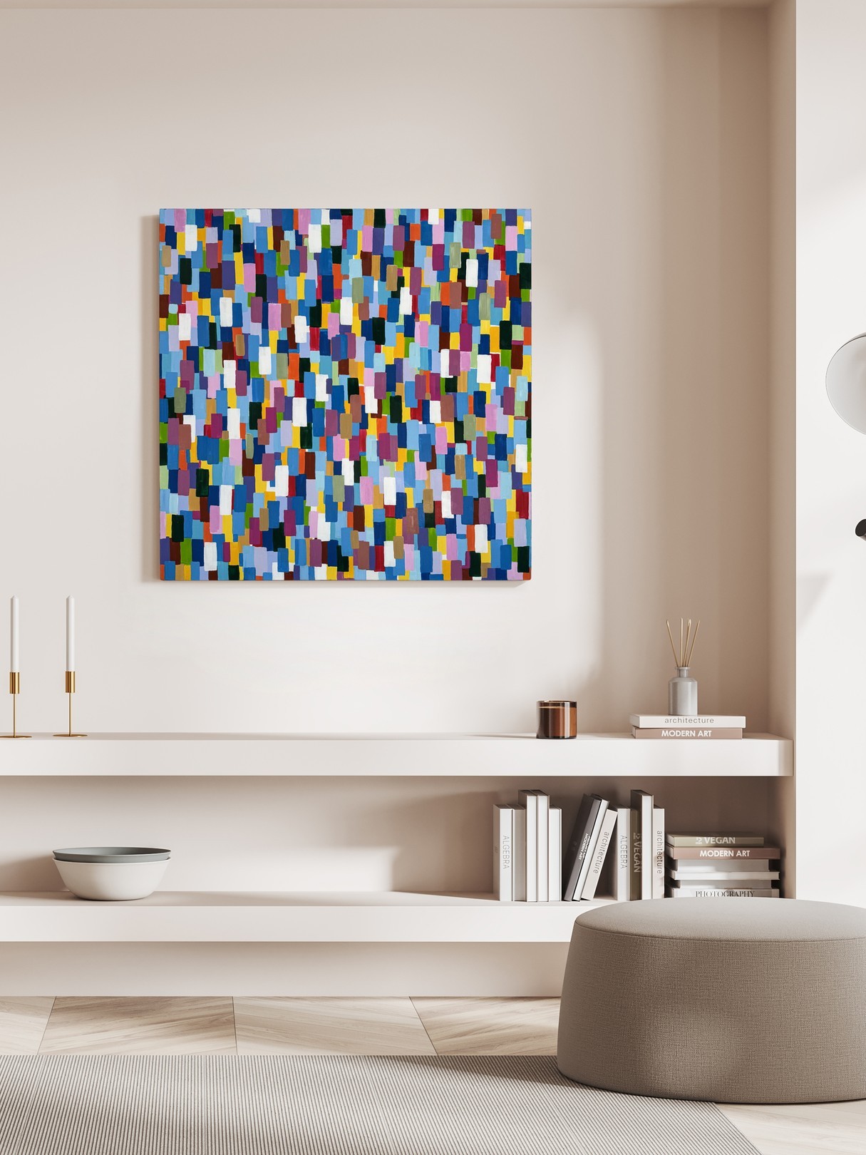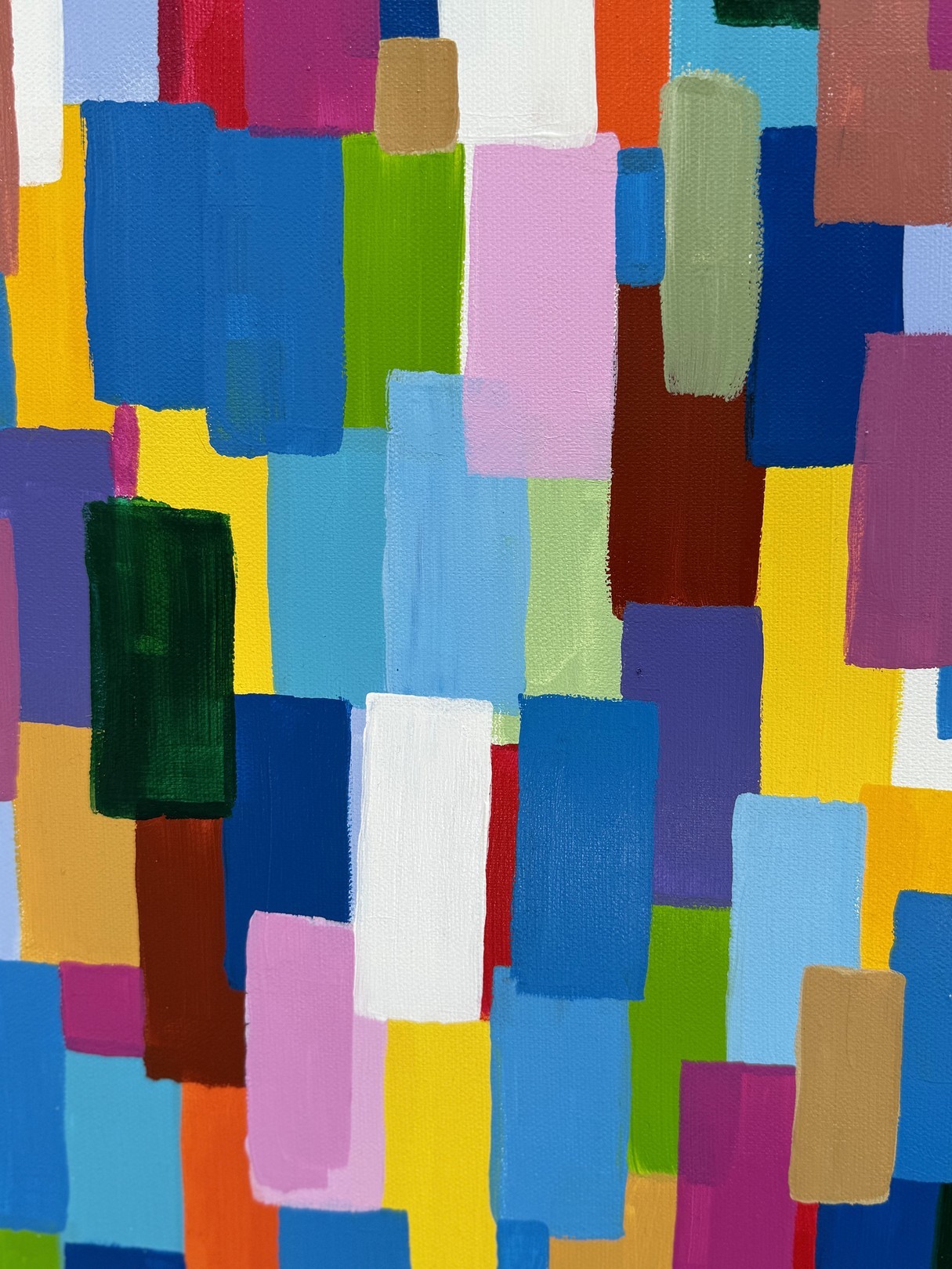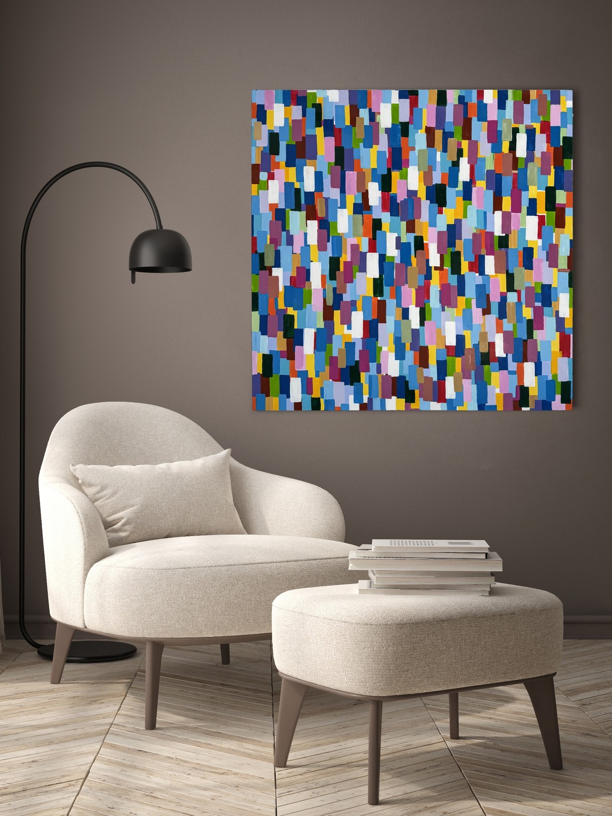 Koffi harmonizes disconnected layers of pigment, drawing inspiration from Wes Anderson’s pastel tones and Sonia Delaunay’s abstract compositions. Beyond its playful and naive appearance, his work creates a universal language that invites a profound reflection on the human condition and the beauty found in spontaneous harmony.