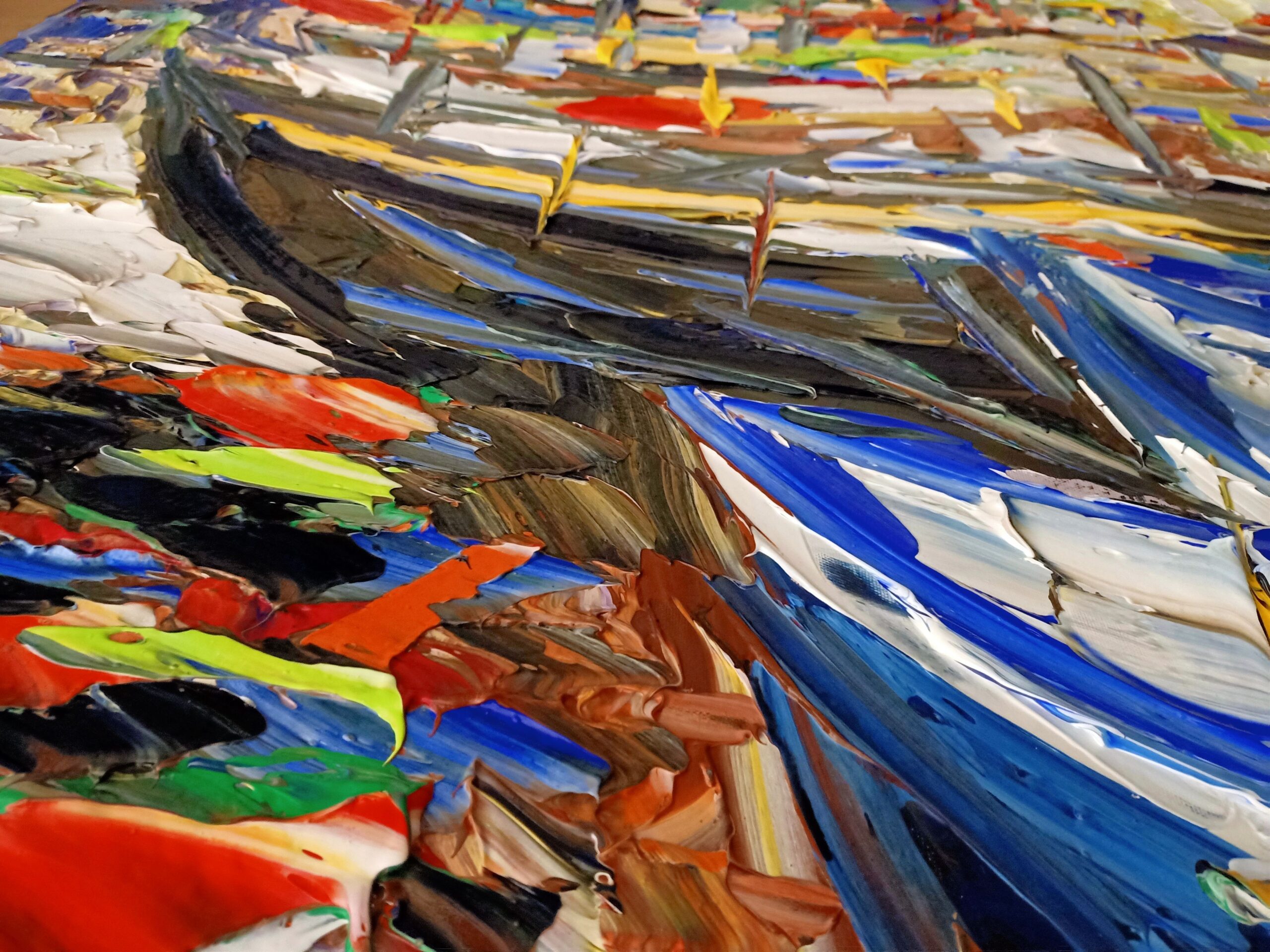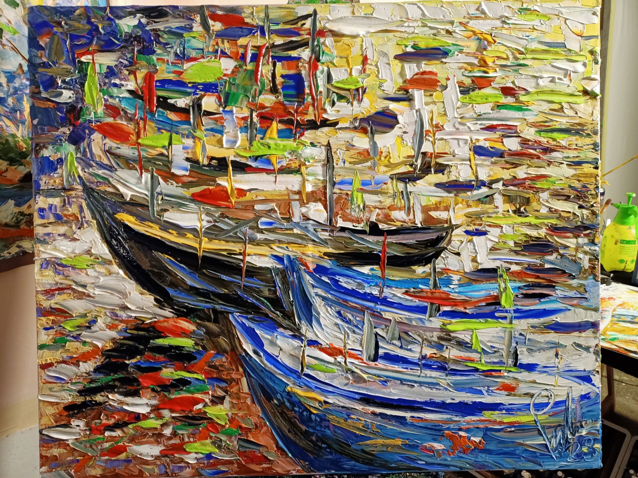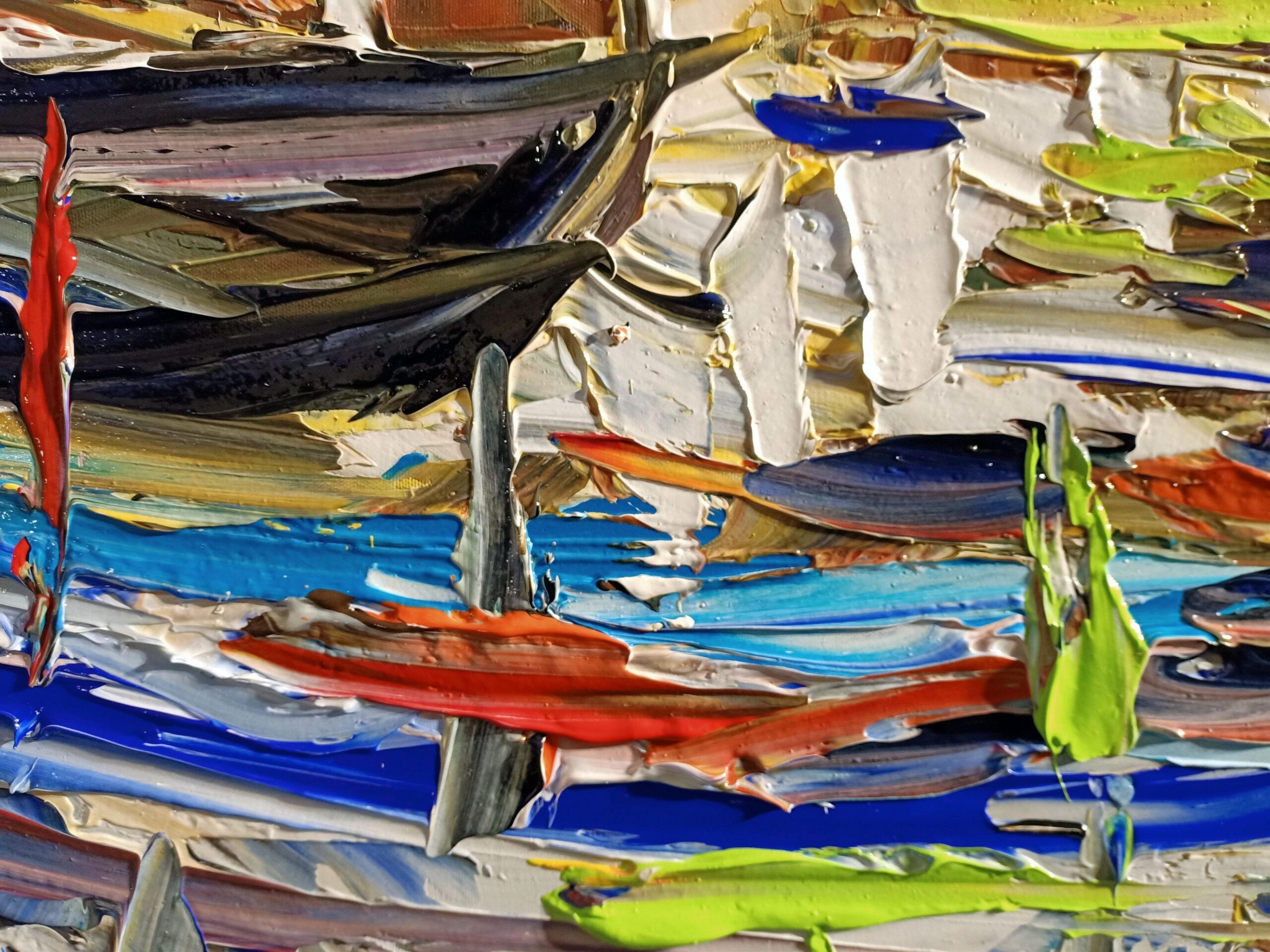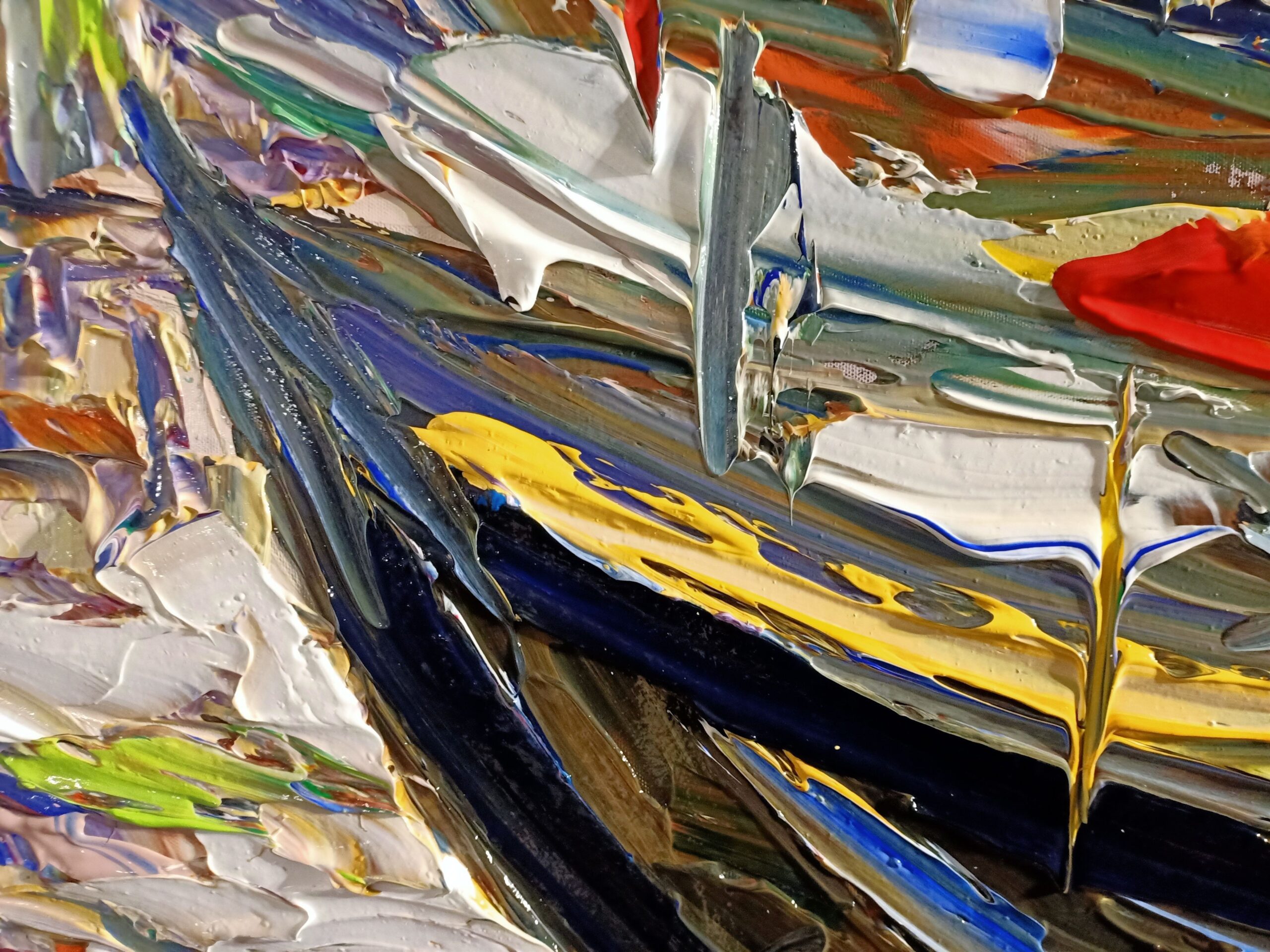 L’opera rappresenta due barche in primo piano, con un’altra imbarcazione sullo sfondo. Le acque tranquille e cristalline riflettono i colori vivaci del cielo e delle barche, creando un’atmosfera di serenità e armonia. La scelta di utilizzare colori materici e pastosi applicati a spatola conferisce al dipinto un’energia dinamica e una tridimensionalità unica.