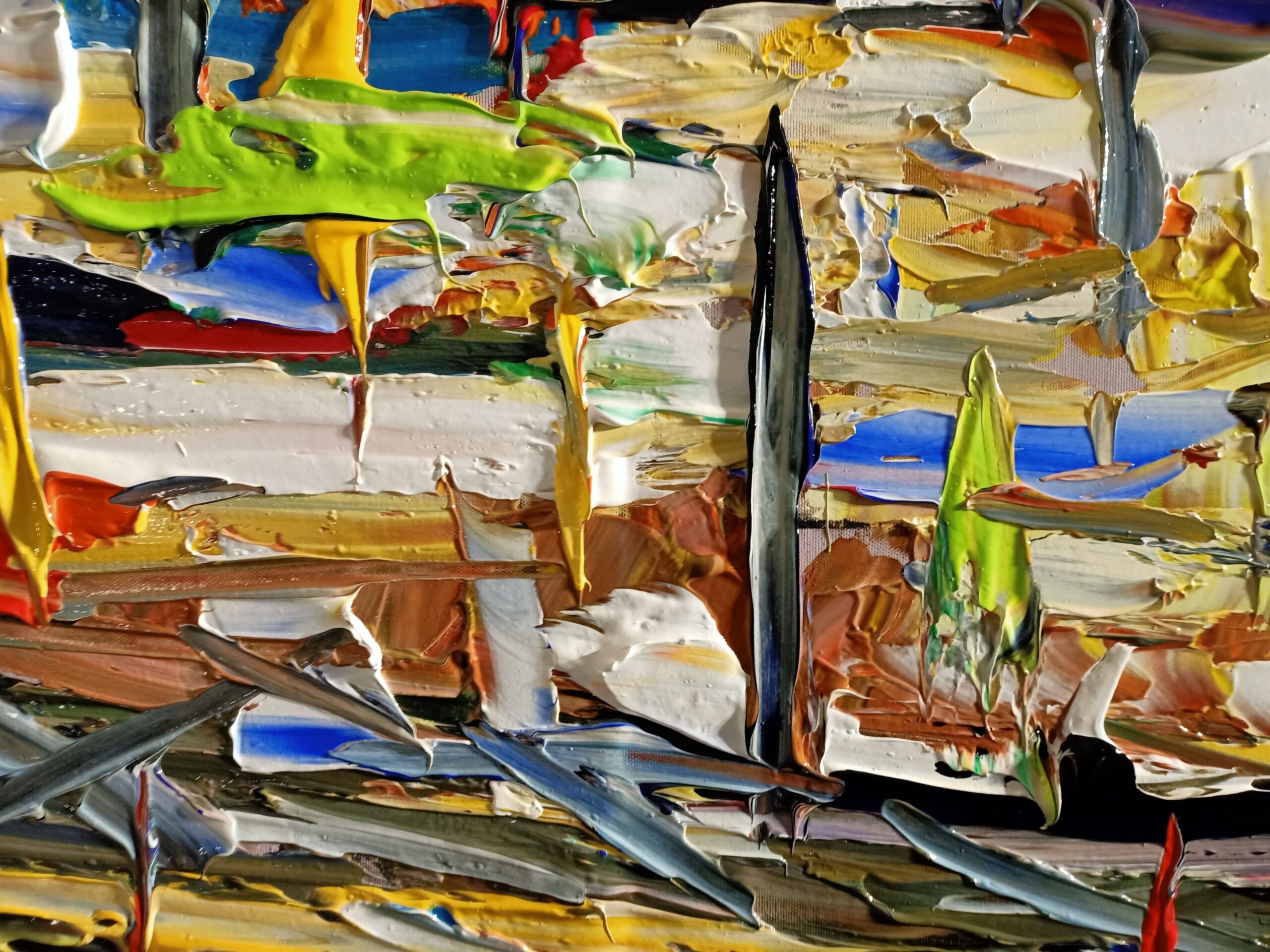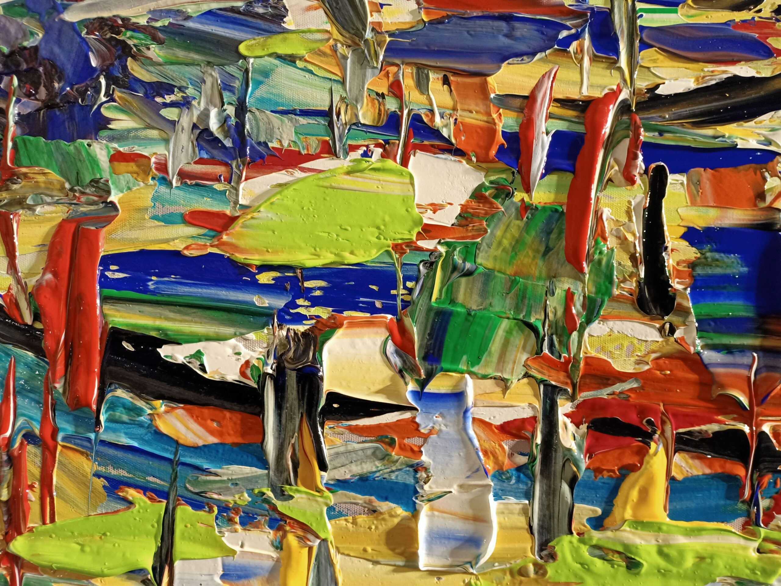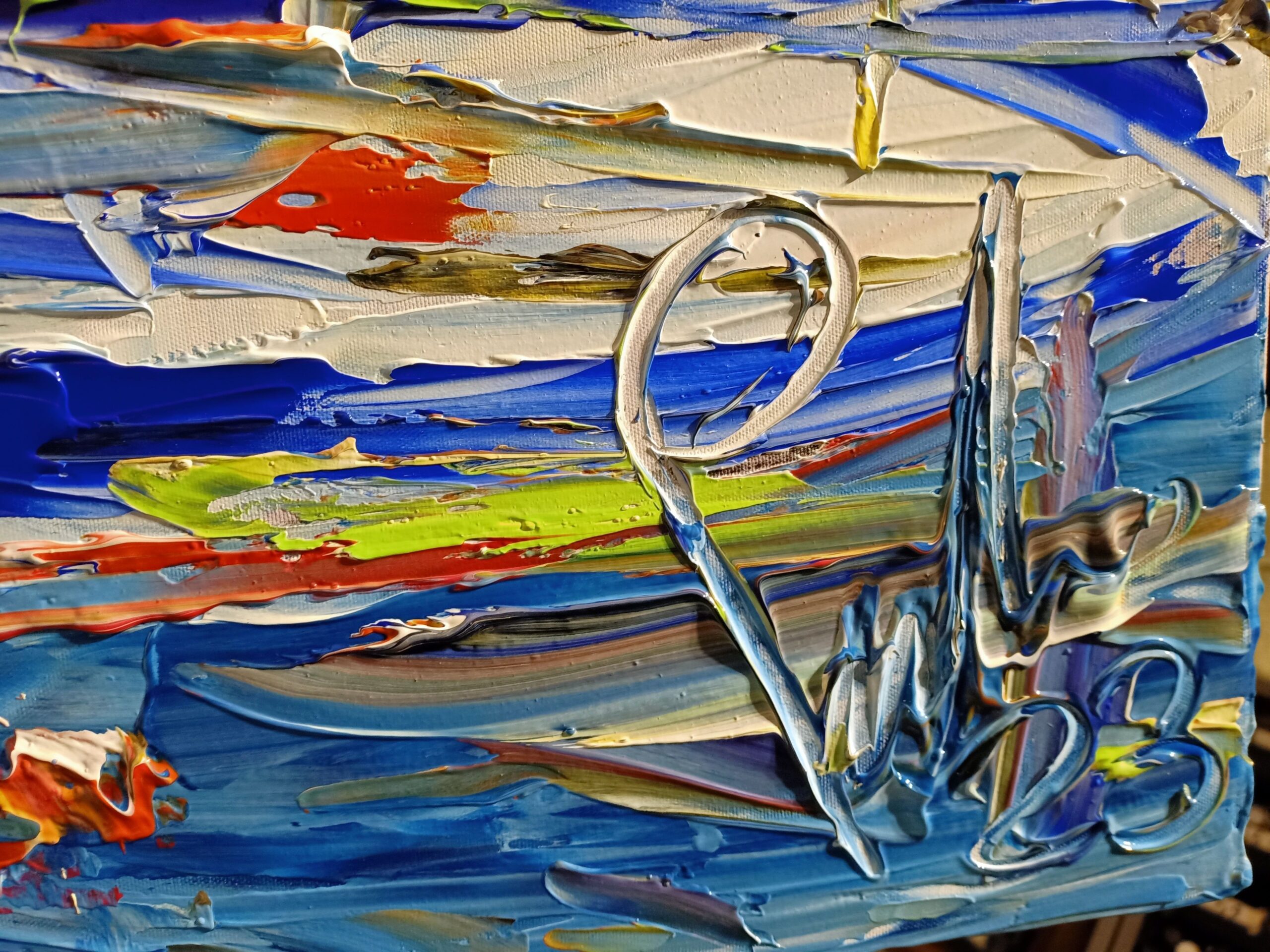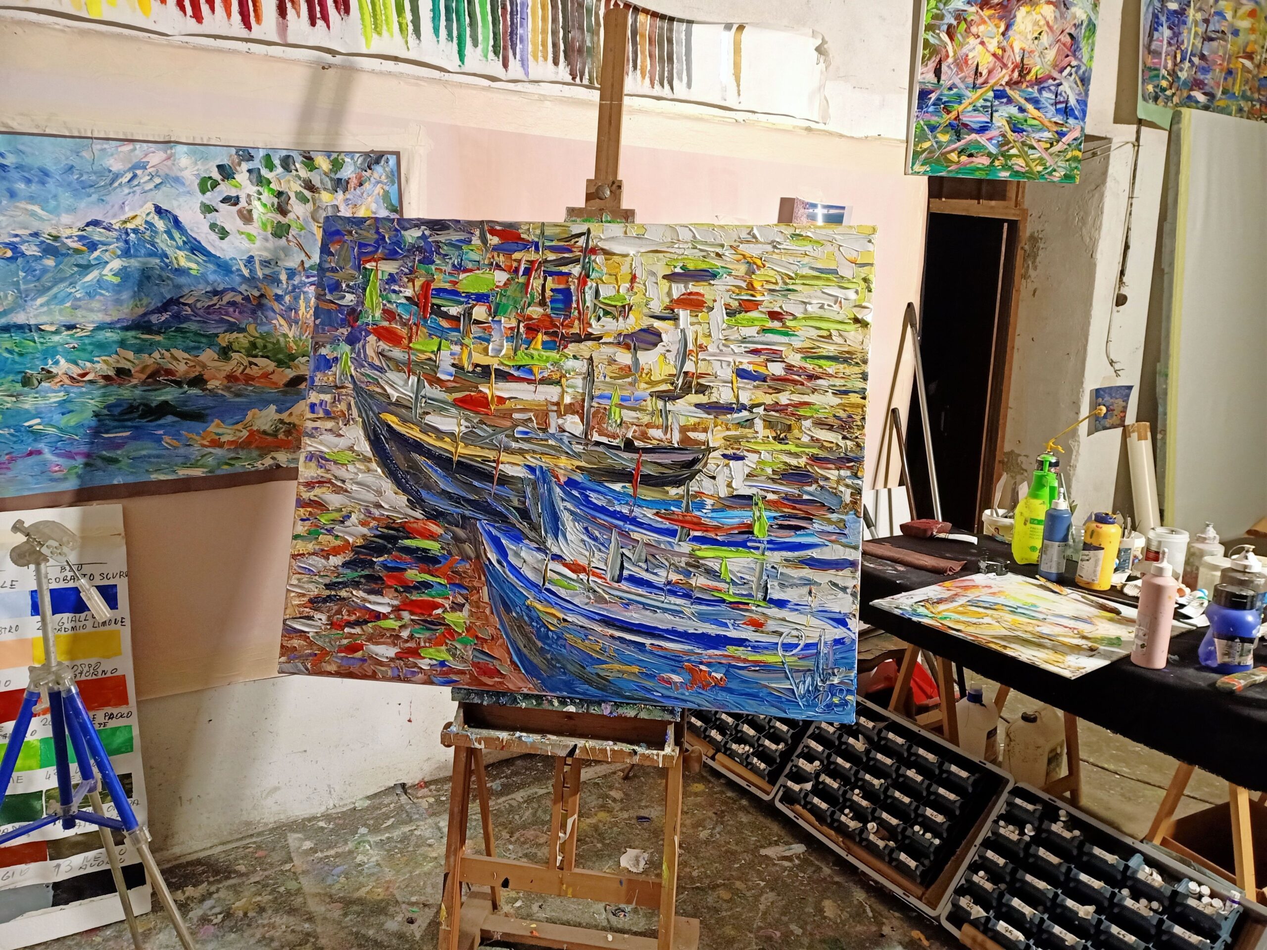 L’opera rappresenta due barche in primo piano, con un’altra imbarcazione sullo sfondo. Le acque tranquille e cristalline riflettono i colori vivaci del cielo e delle barche, creando un’atmosfera di serenità e armonia. La scelta di utilizzare colori materici e pastosi applicati a spatola conferisce al dipinto un’energia dinamica e una tridimensionalità unica.