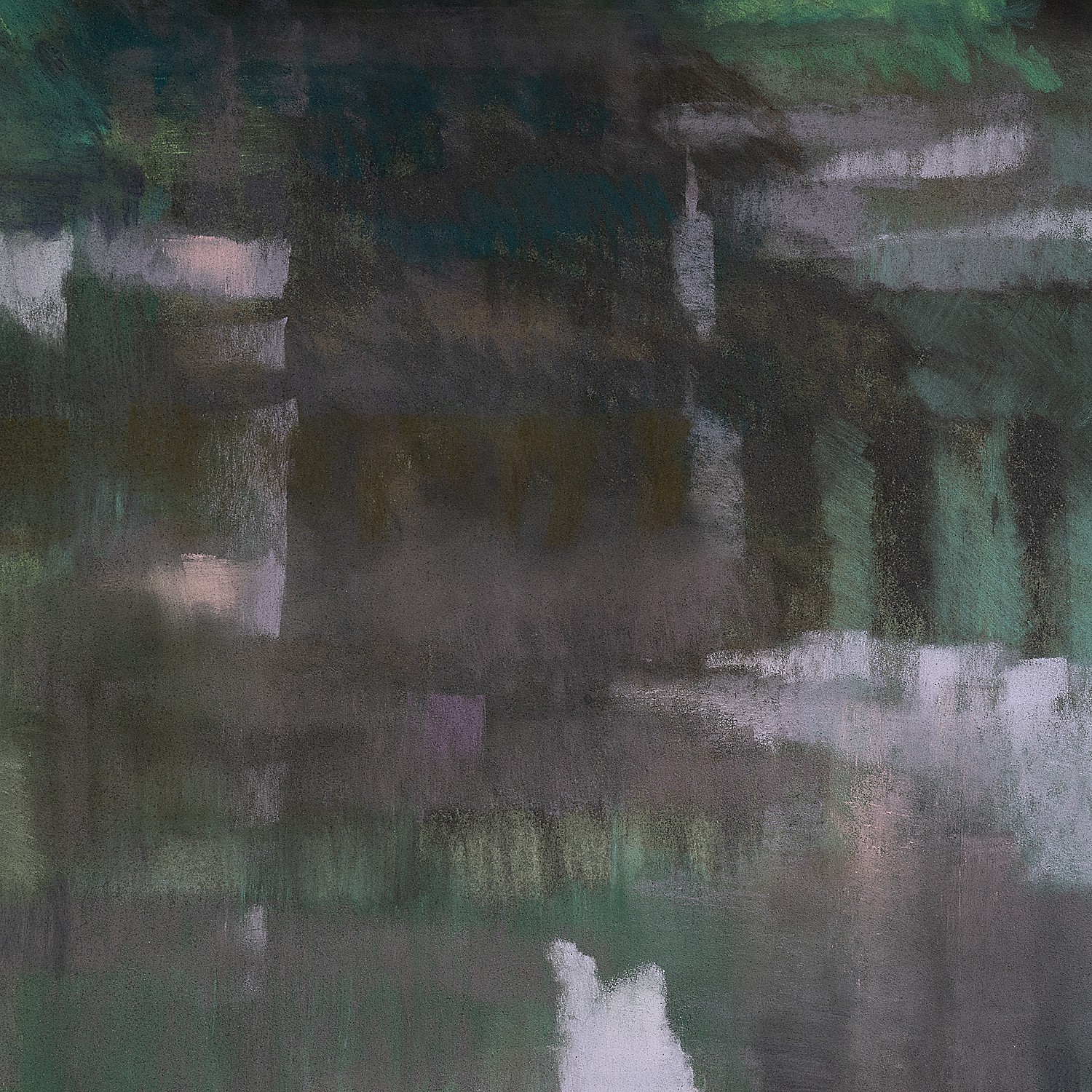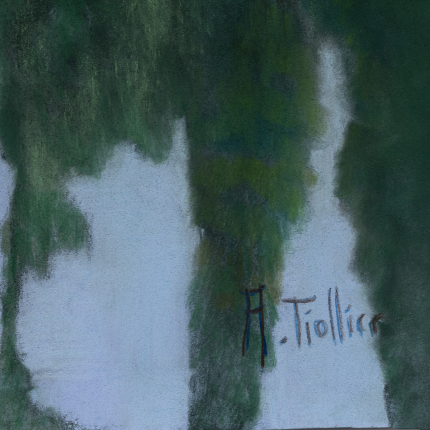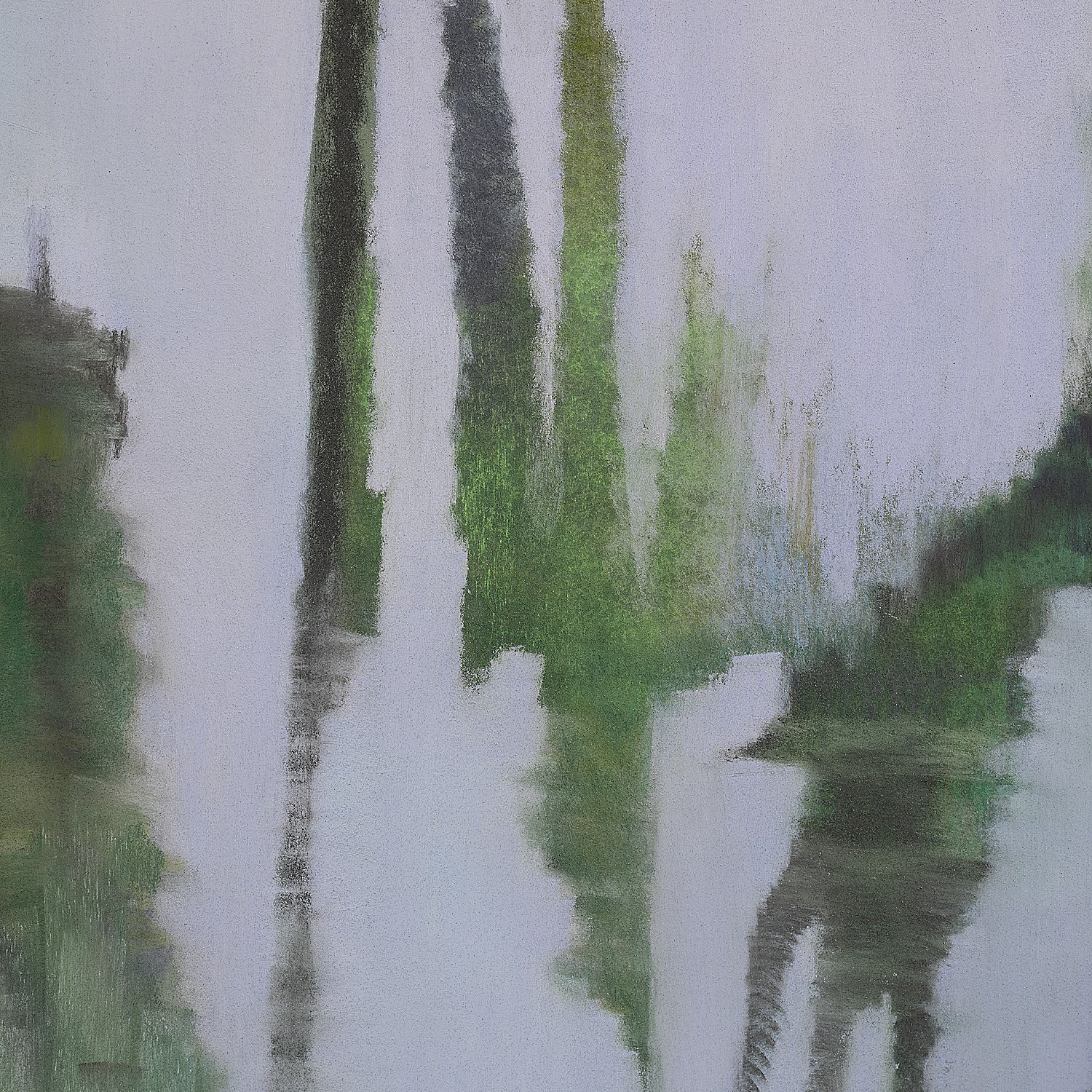This artwork presents a hypnotic waterscape where reflections create a symphony of colors and abstract forms. The predominant green hues evoke a lush natural scene. The mirror-like effect of the water transforms the trees into long, elongated, almost ghostly silhouettes, adding a dreamlike dimension to the whole. The shimmering surface, traversed by gentle ripples, suggests a soft, peaceful current. The fluid and masterful drawing technique manages to capture the essence of nature while inviting introspective contemplation. The absence of a clear boundary between the land and its reflection lends the work a poetic abstraction, paying homage to the subtleties and complexity of the natural world.