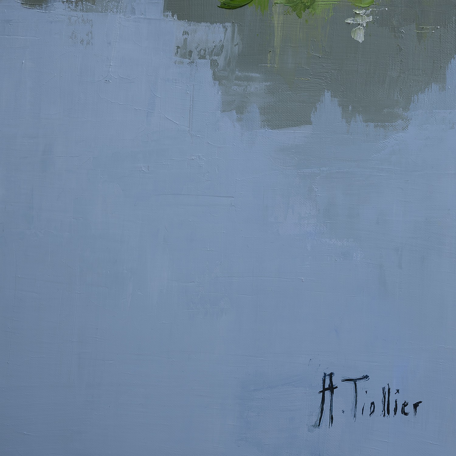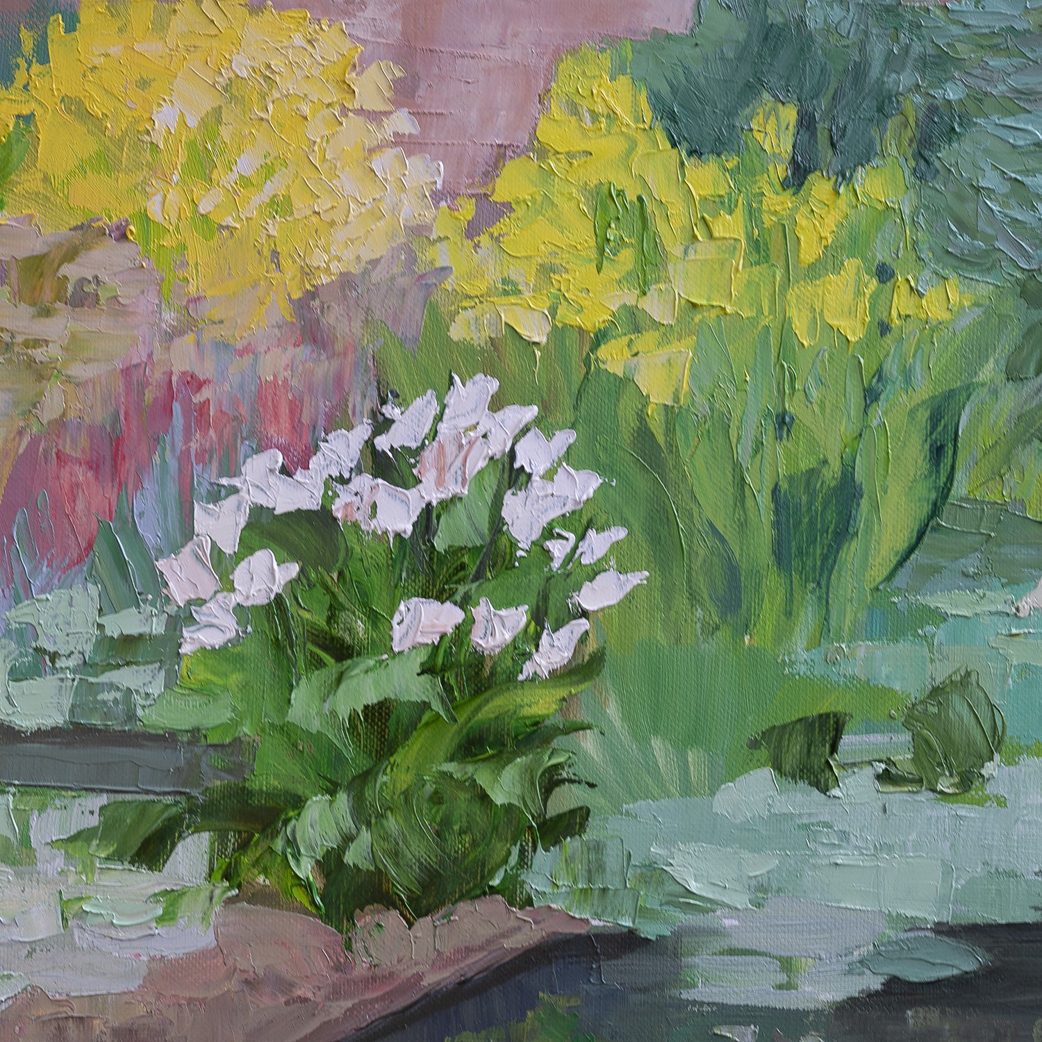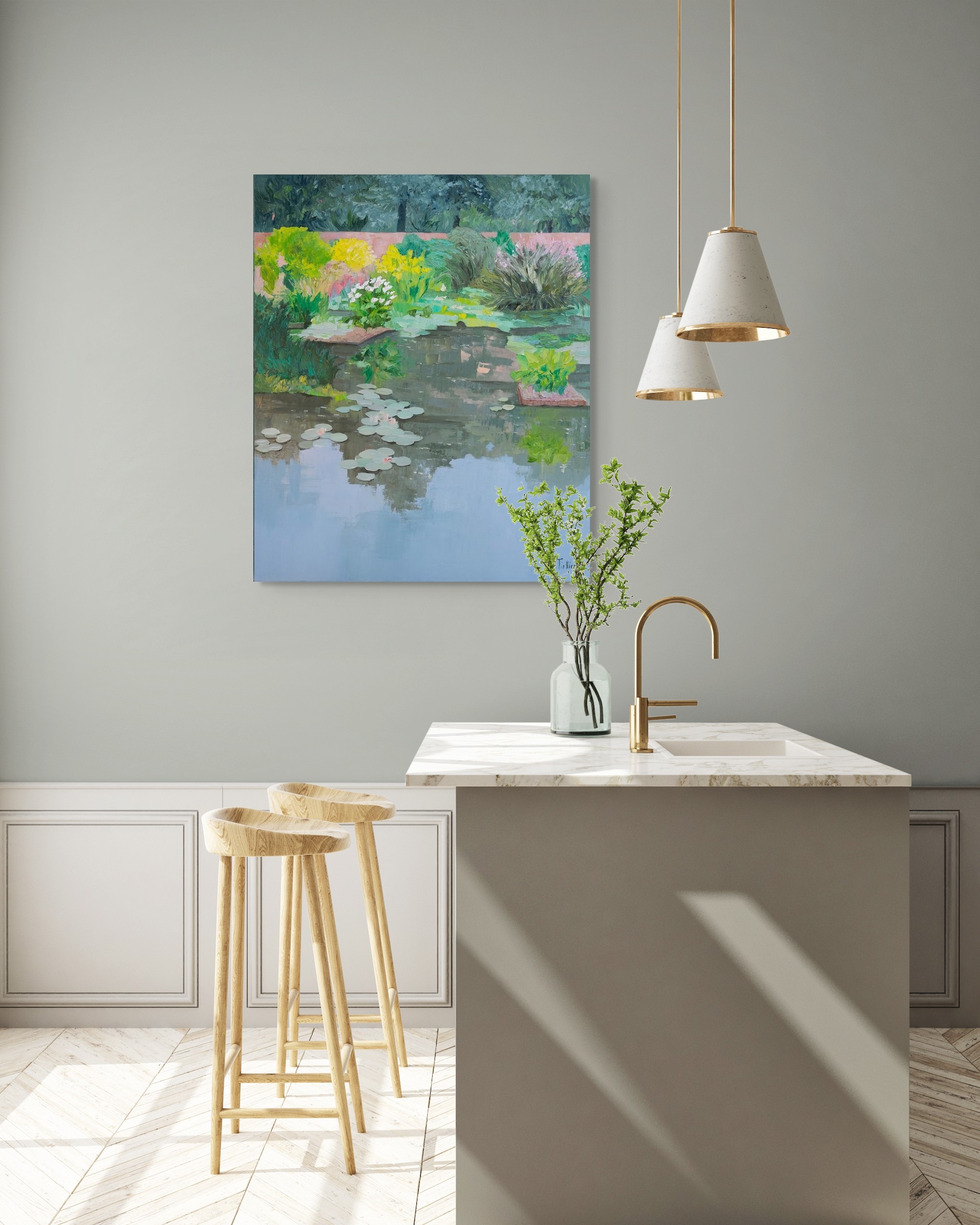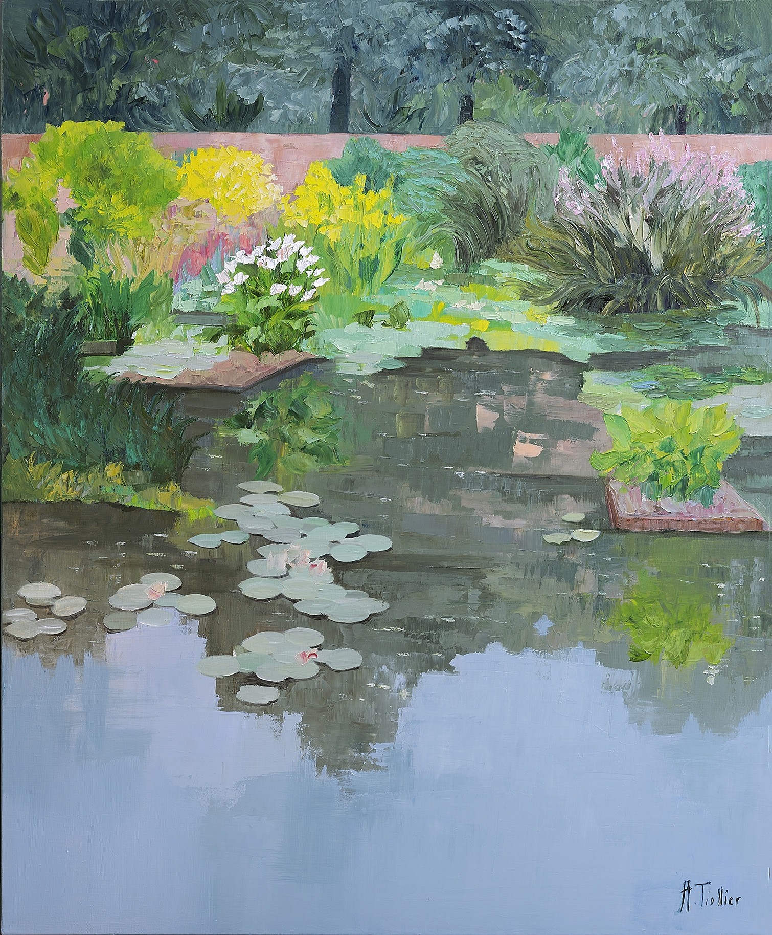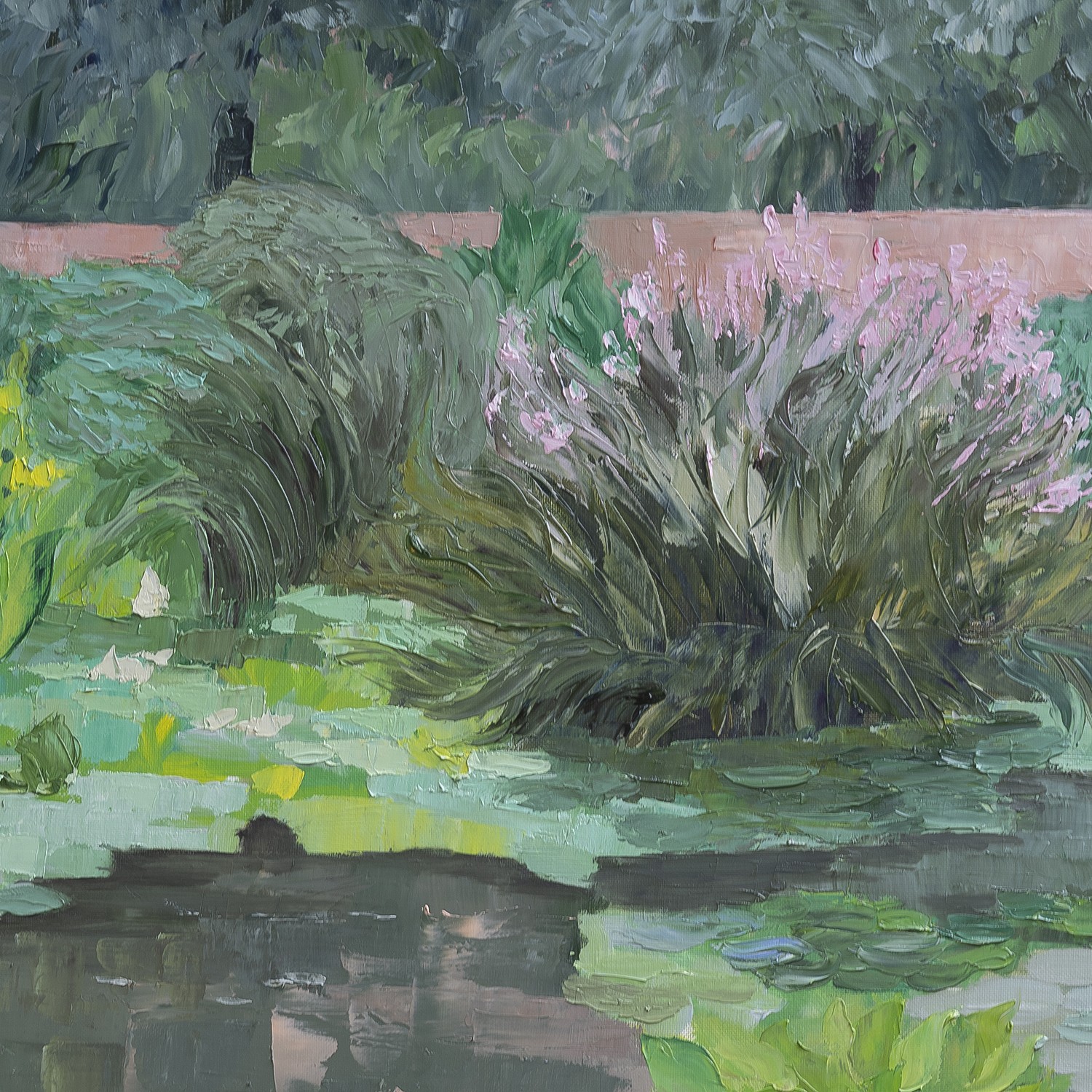 The artist chose to show the striking contrast between the reflection of the cloudless sky and the proliferating plants of the garden, all in gentle harmony.