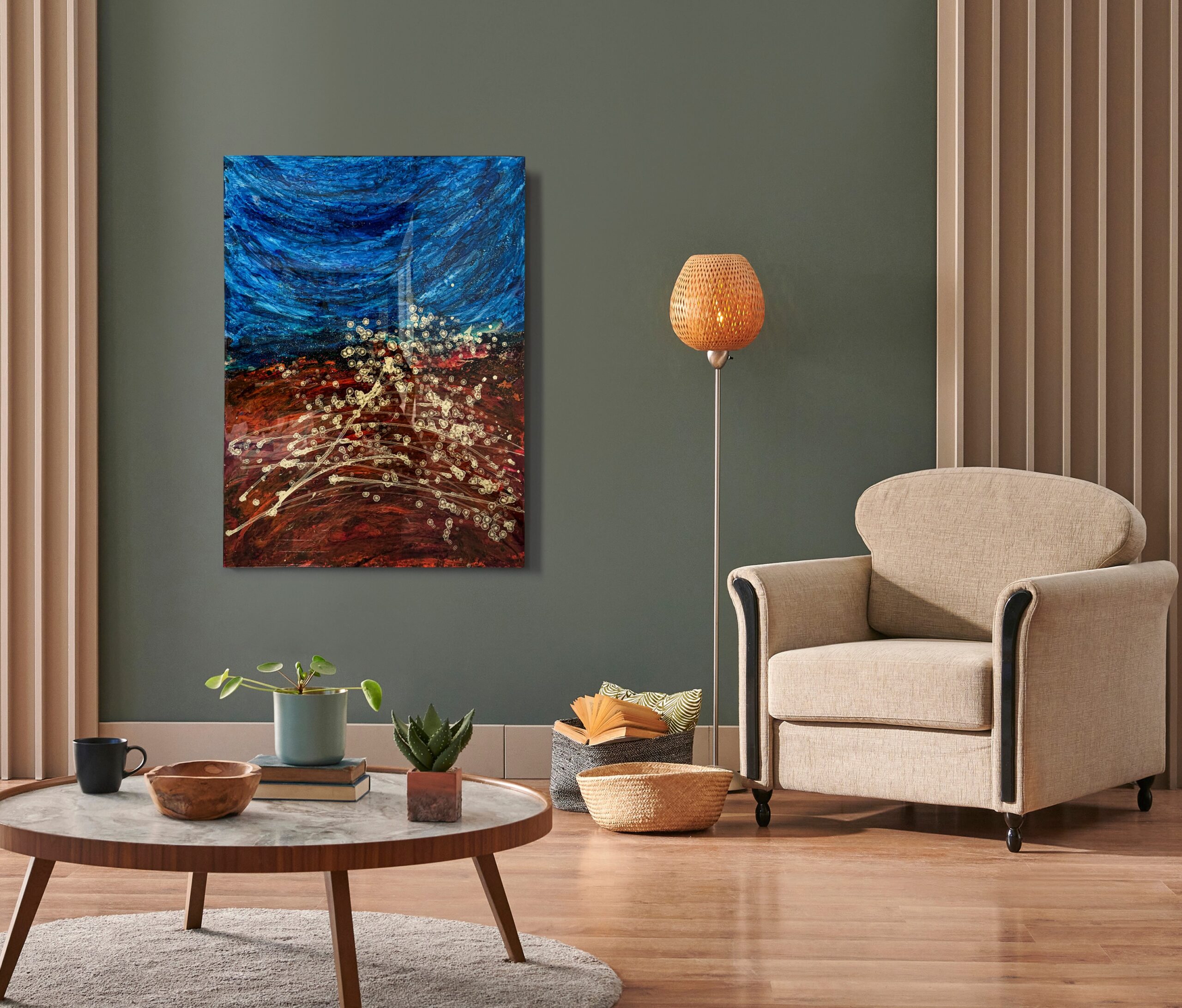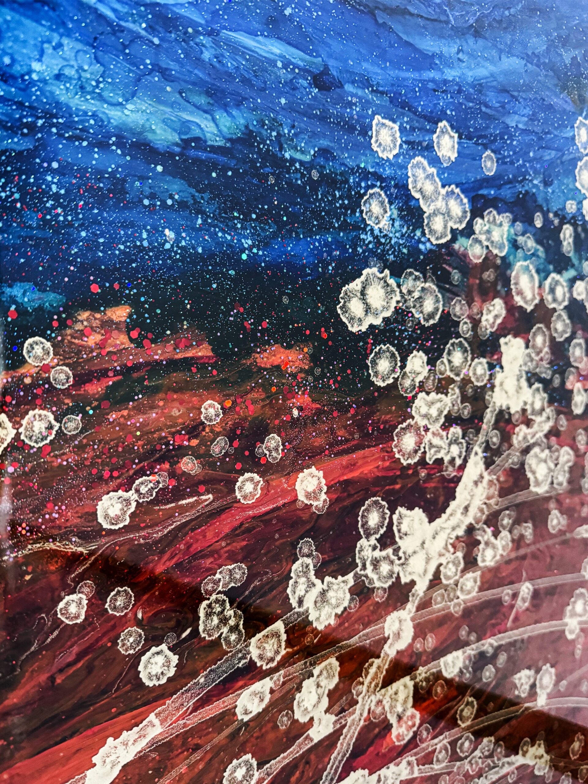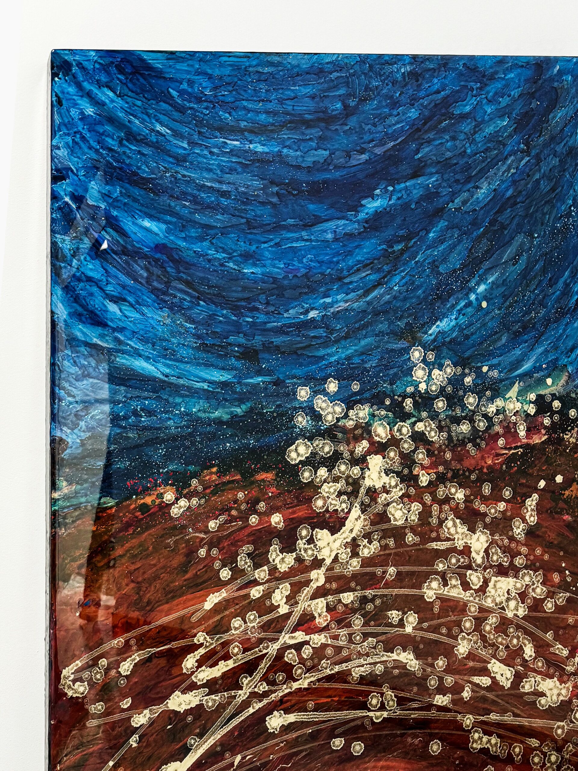 Crafted using 7 layers of high gloss resin, each enriched with unique pigments, gold leaf, oils, and techniques, the artwork exhibits a mesmerizing depth. It’s difficult to capture the full brilliance of colors and glossy effects in photos; additional images or videos can be provided upon request to offer a more accurate representation.
