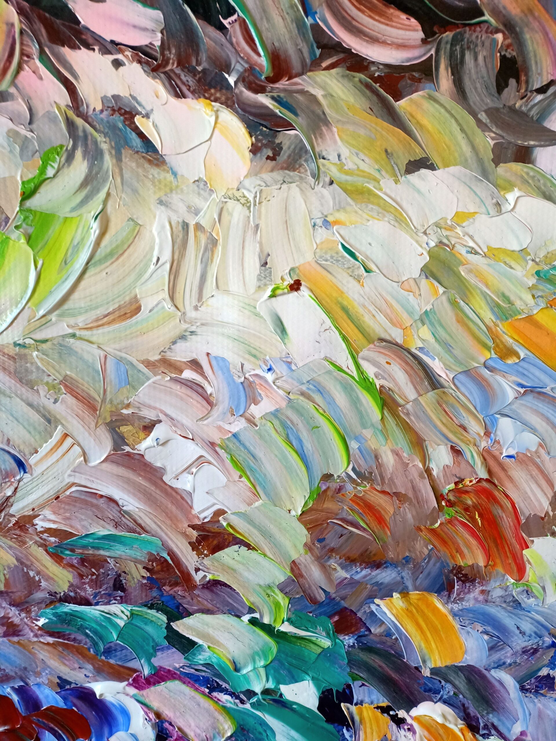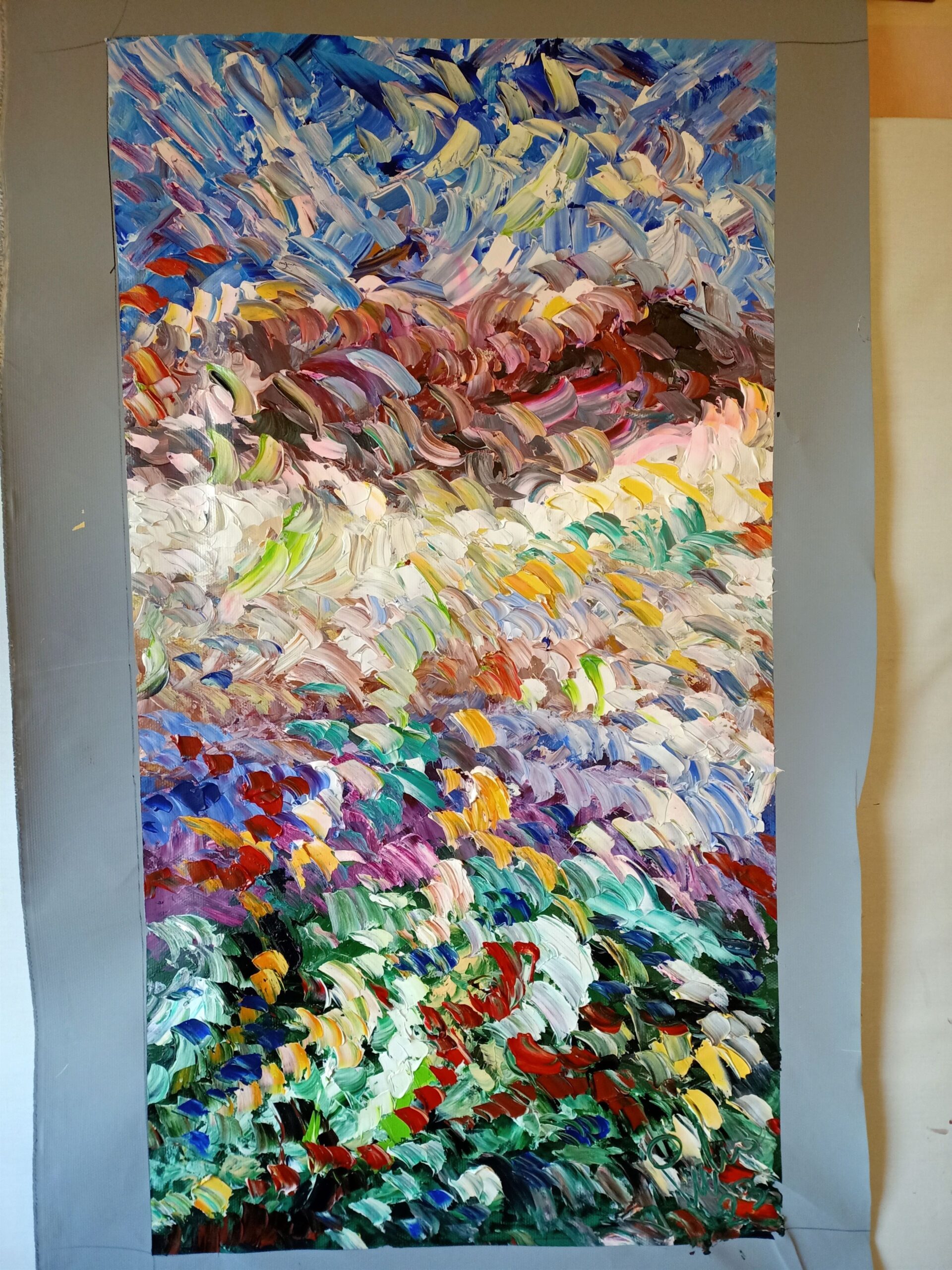 As an art critic who is also the artist behind the creation, I find myself in the unique position of interpreting “Scroscio d’acqua,” my 2023 acrylic on canvas piece measuring 80x140cm. In this work, I endeavor to capture the vivacity and perpetual motion of water. Each stroke is a testament to the fluidity and transient beauty found in nature’s cascades. The palette knife technique brings forth a tactile dimensionality, with the blues, whites, and umbers swirling together to mimic the frothy churn of a waterfall’s embrace.