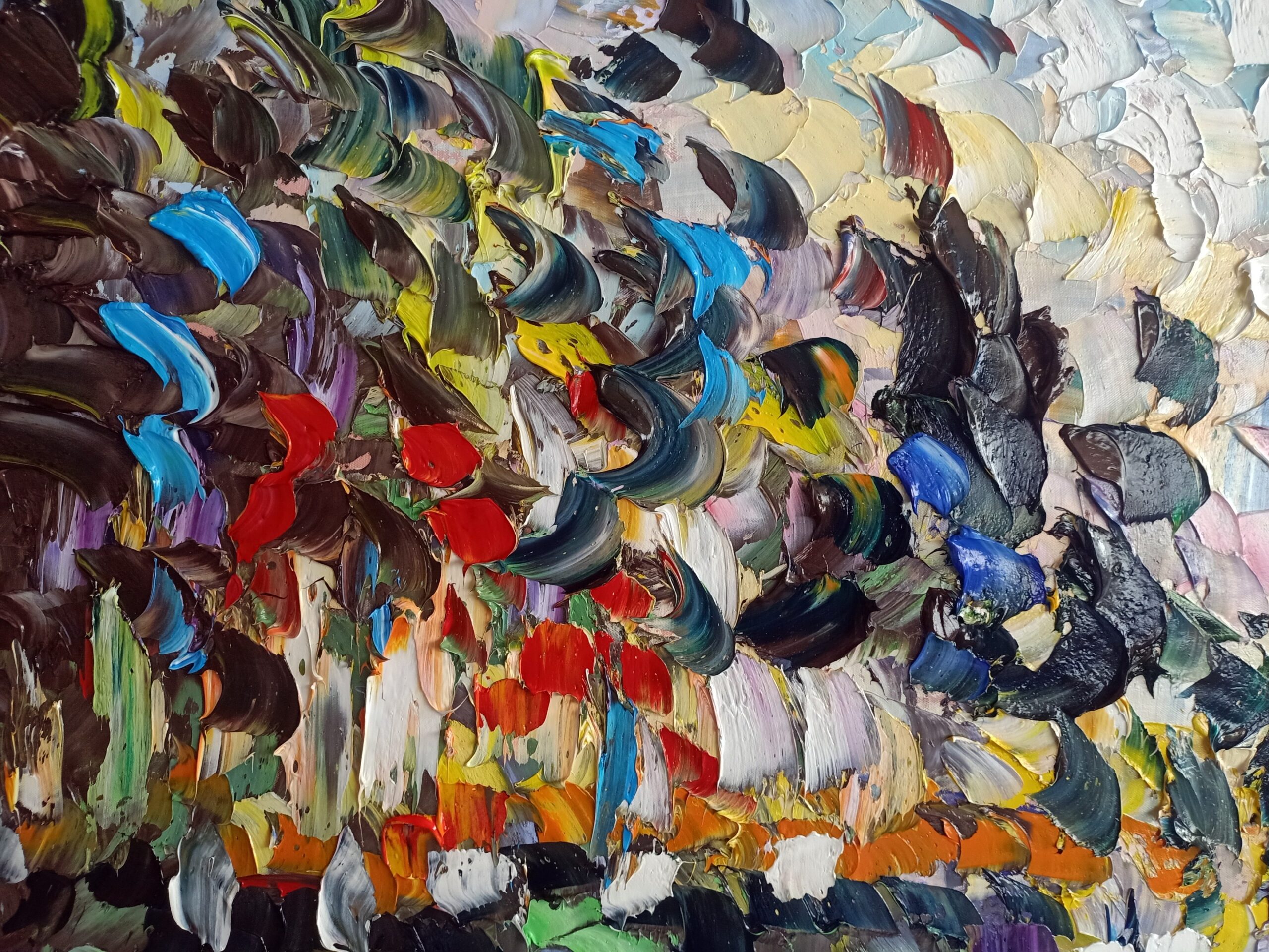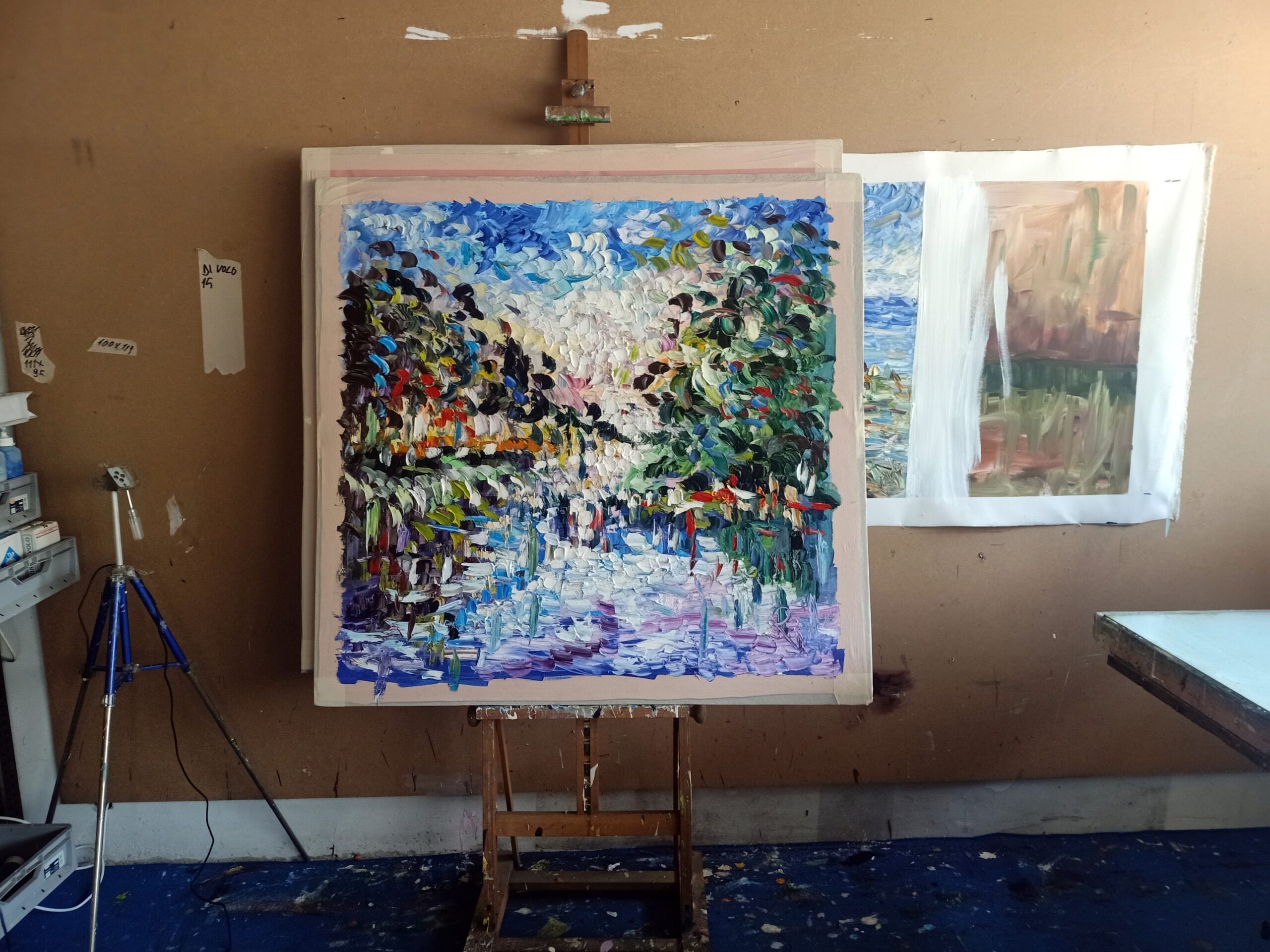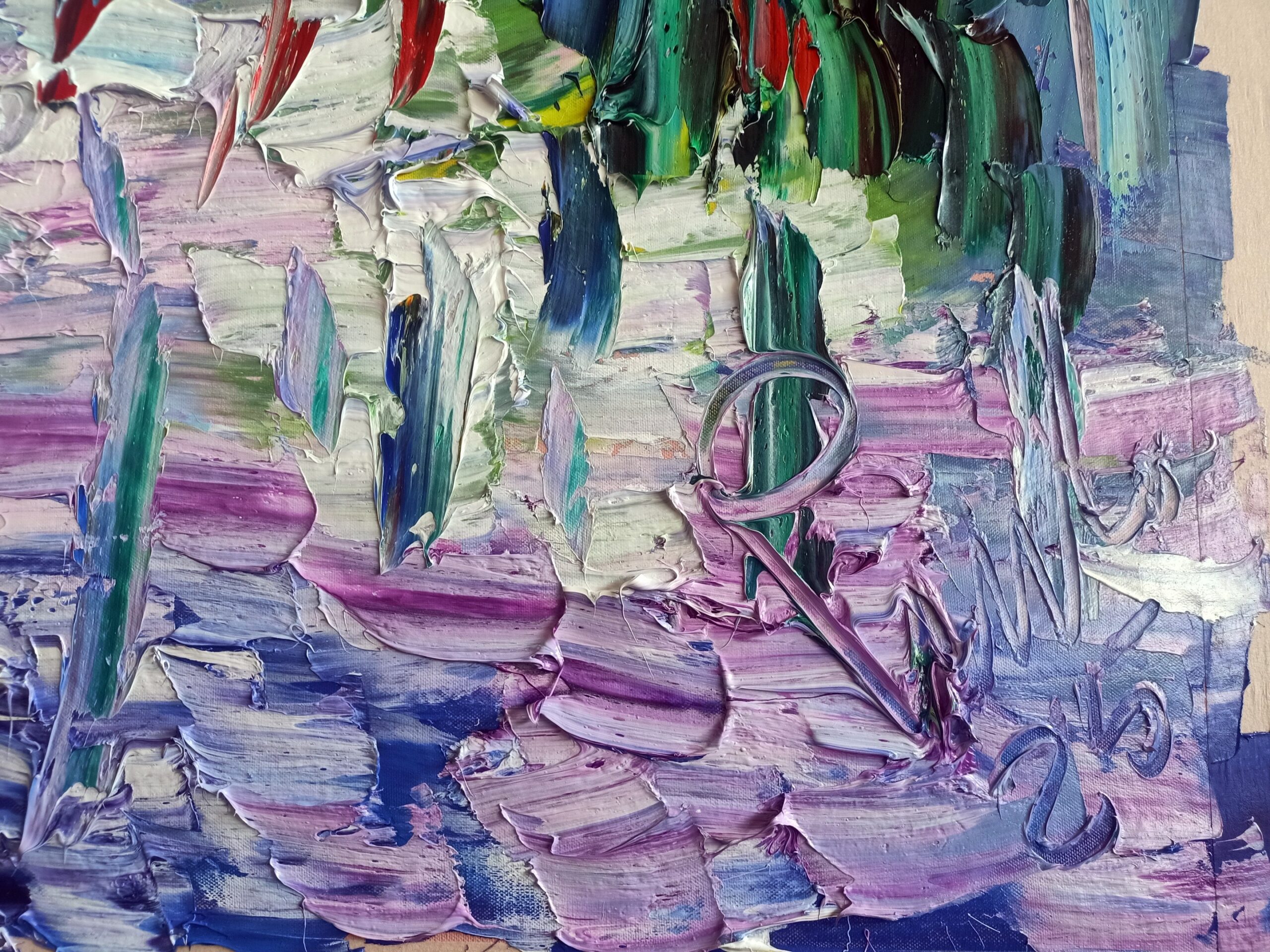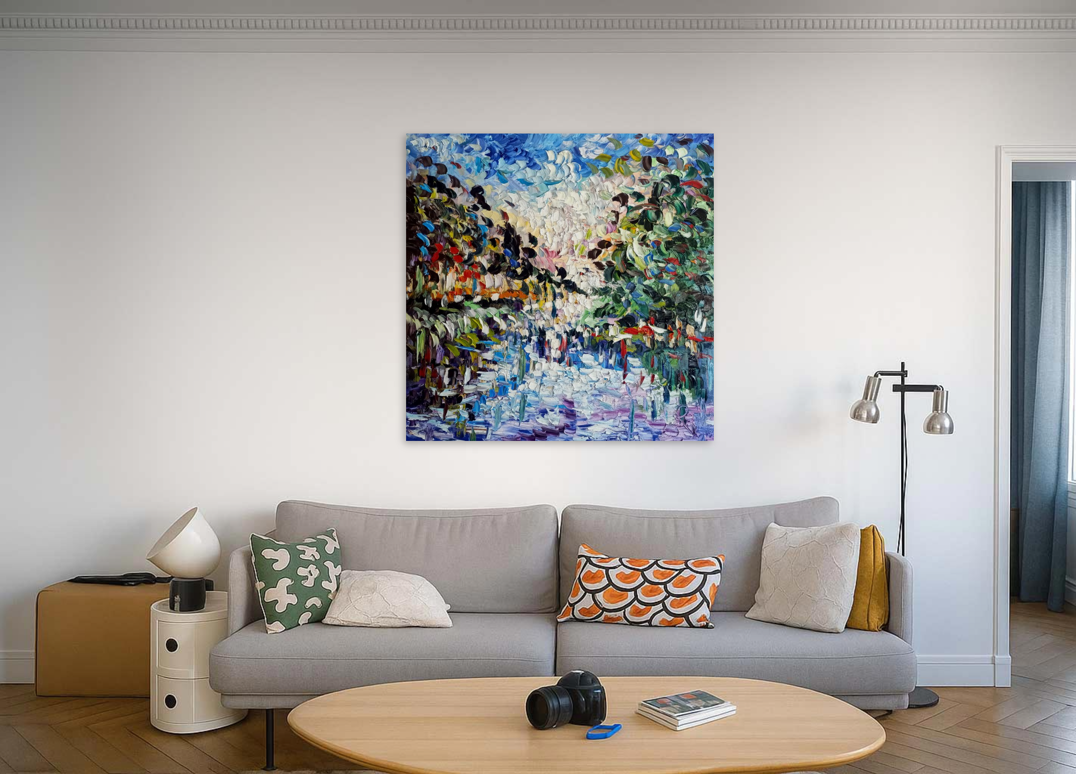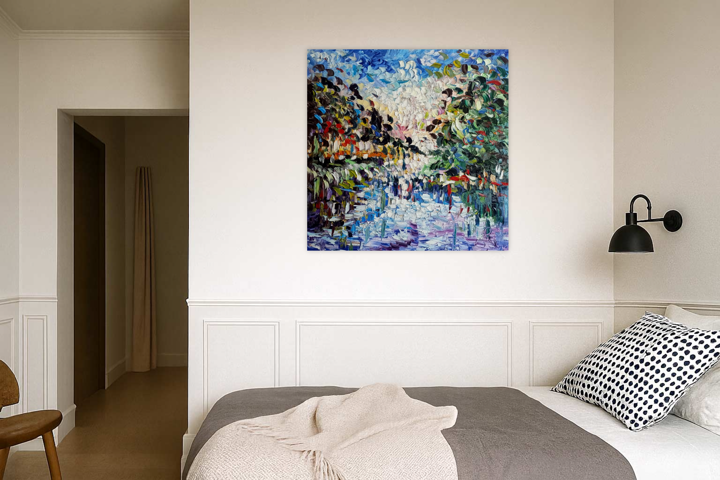 Summer Evening Lights distills the glow of a warm dusk into a cascade of lush colour. Using generous impasto strokes, Antonino Puliafico layers emerald, cobalt, and soft coral hues, suggesting treetops and riverbank foliage shimmering in the last beams of daylight. A creamy sky melts into hints of pink and gold, while cool violets and blues ripple through the water below. The thick palette-knife work invites touch as much as sight—each ridge of paint catches light differently, echoing the sparkle of insects and the hush of twilight breezes. The scene feels at once abstract and familiar, capturing that fleeting moment when a summer day exhales into night. Whether viewed up close for its lively texture or from afar for its radiant harmony, Summer Evening Lights brings the calm, reflective mood of an August sunset into any contemporary space.