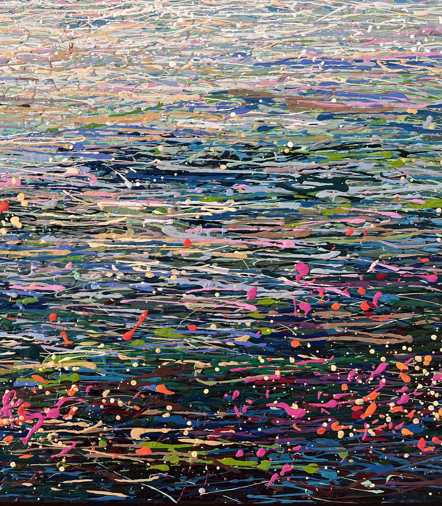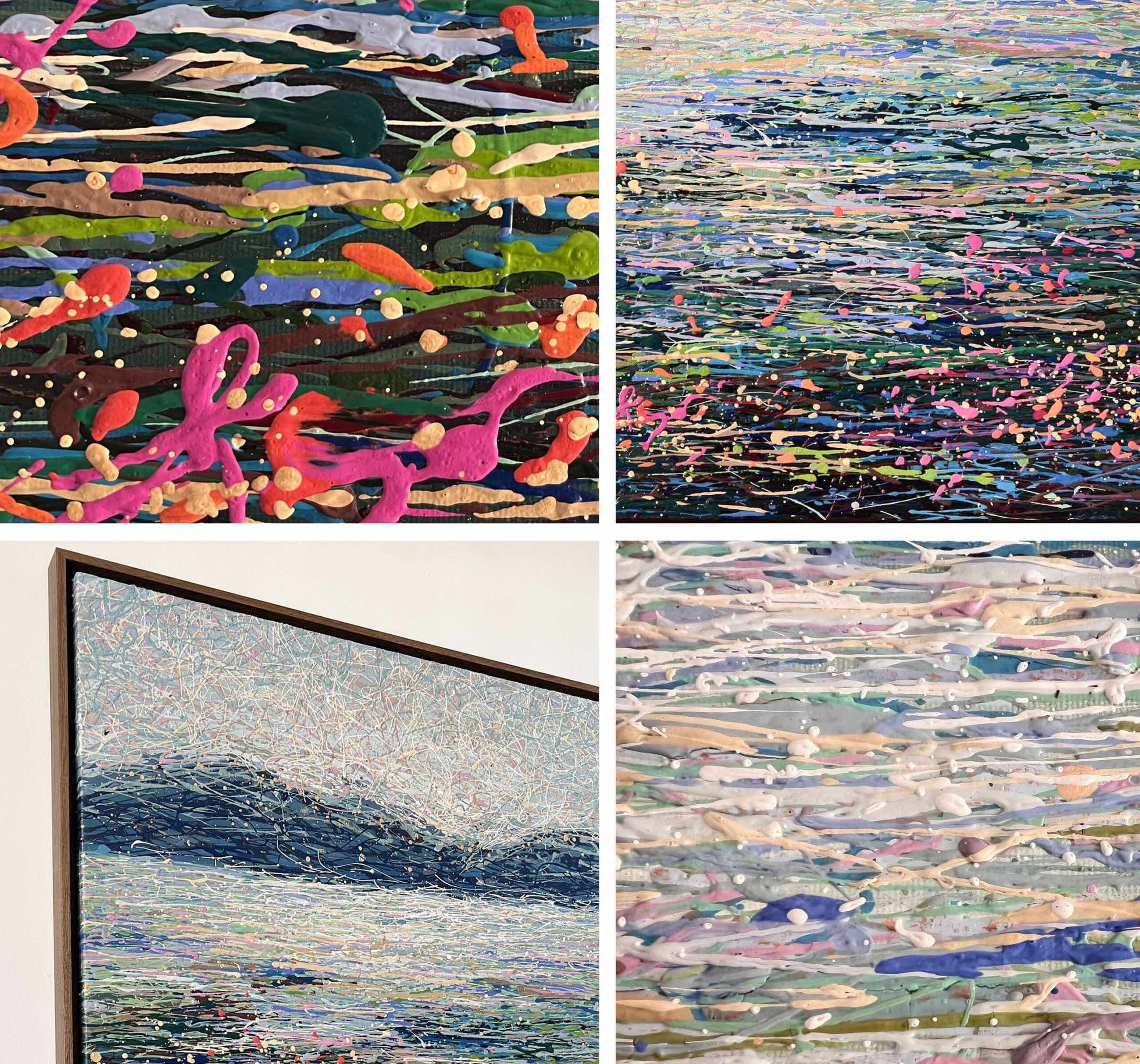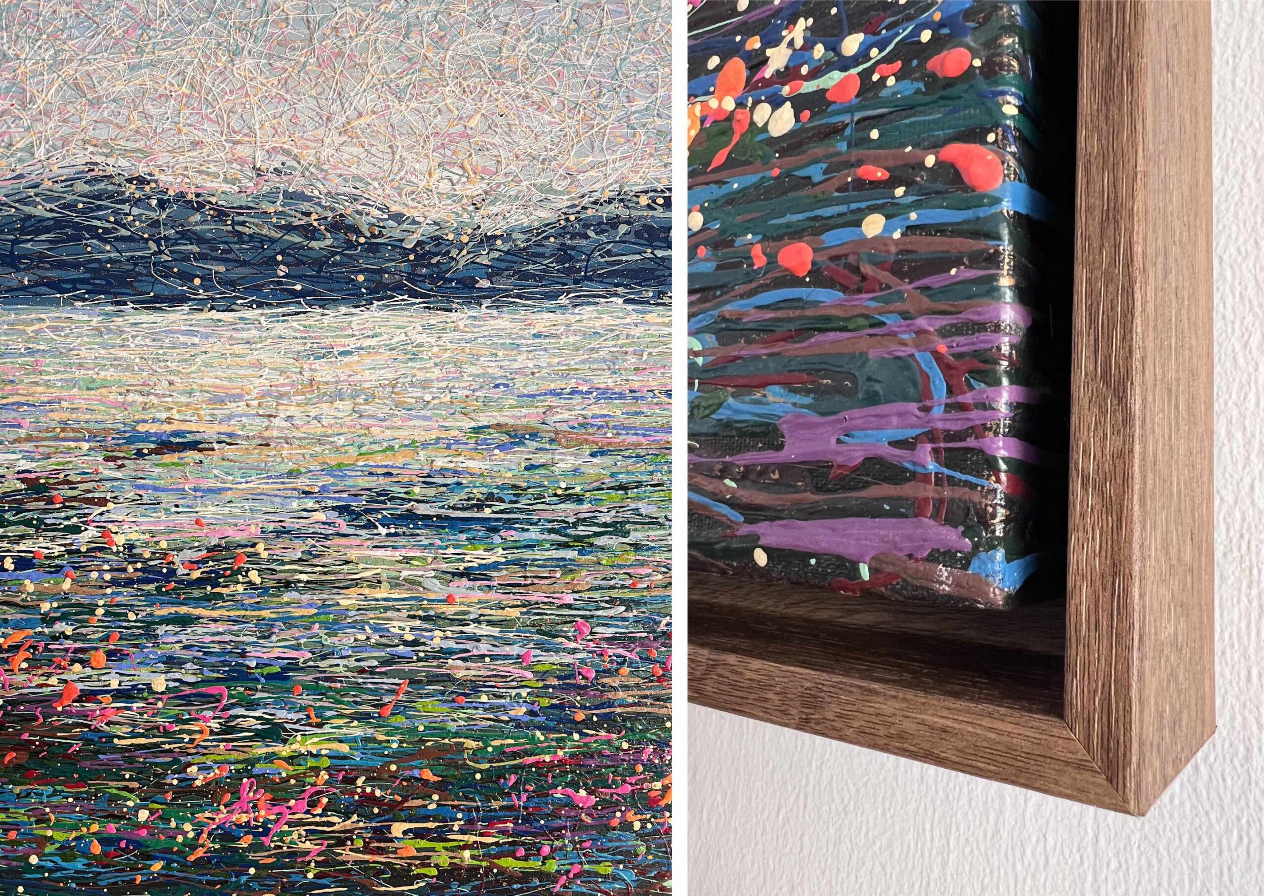 This one-of-a-kind artwork combines dynamic splashes and thread-like layers of acrylic paint, creating a rich, tactile surface that resembles woven fabric. Each layer is meticulously applied, forming a unique canvas within the canvas.