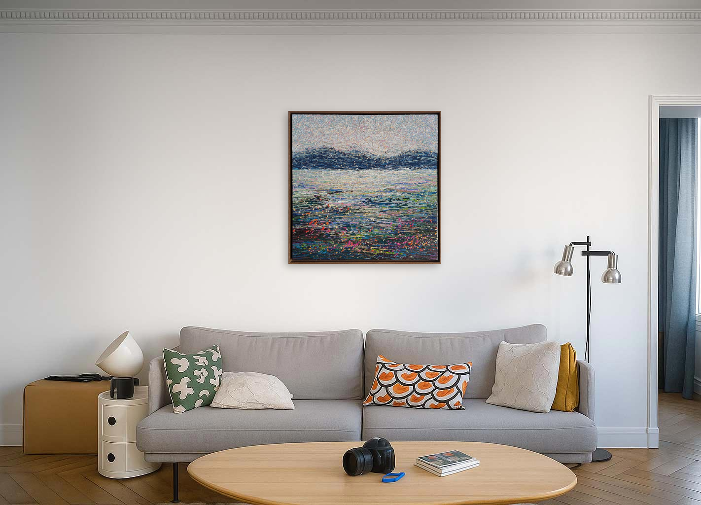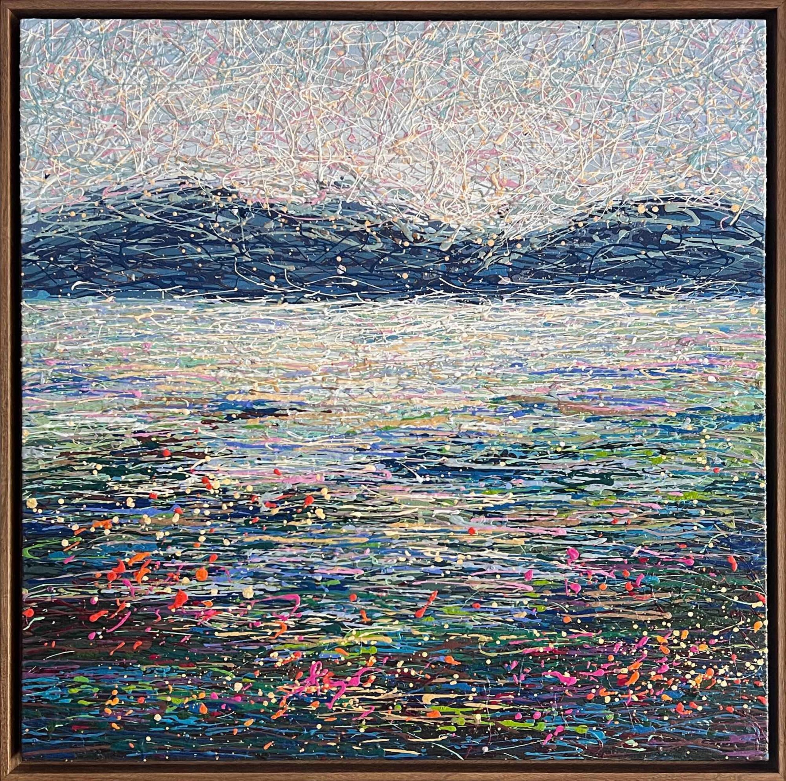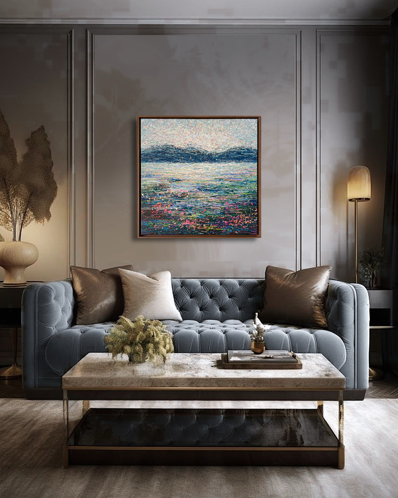 Luxury Textured Wall Art • Serene Abstract Landscape • Acrylic on Canvas • Original framed abstract painting with thread-like acrylic texture. Luxury wall art for contemporary interiors.