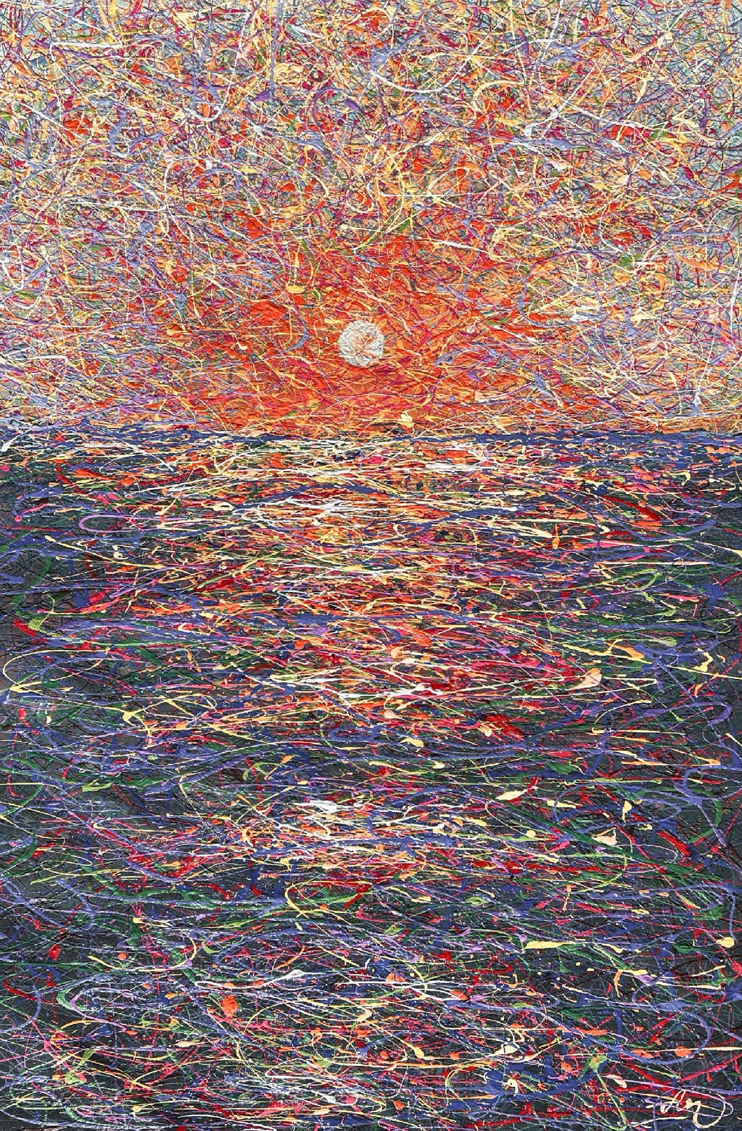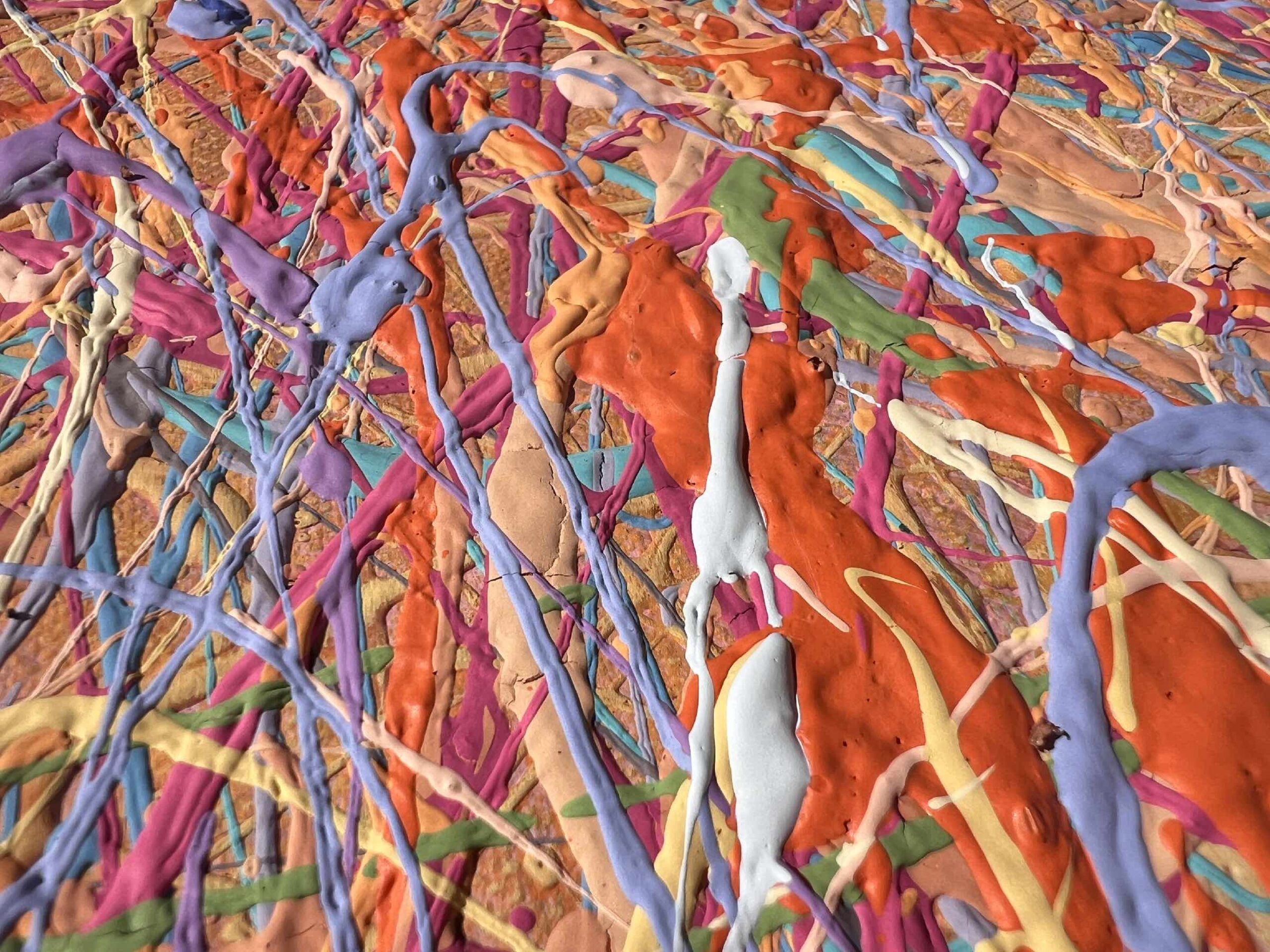 Created in a unique textured technique with flowing paint threads, it combines vibrant shades of blue, turquoise, and orange.