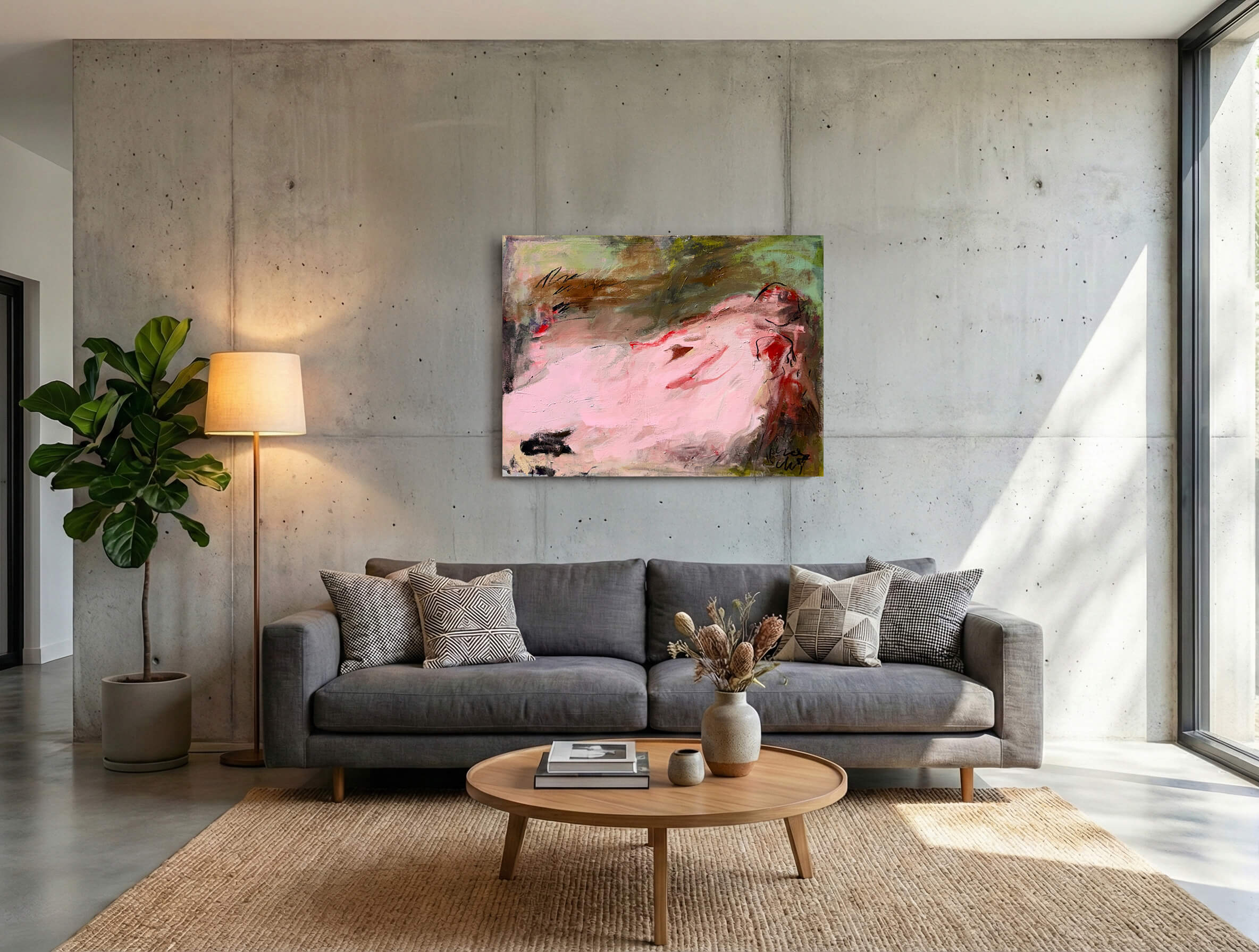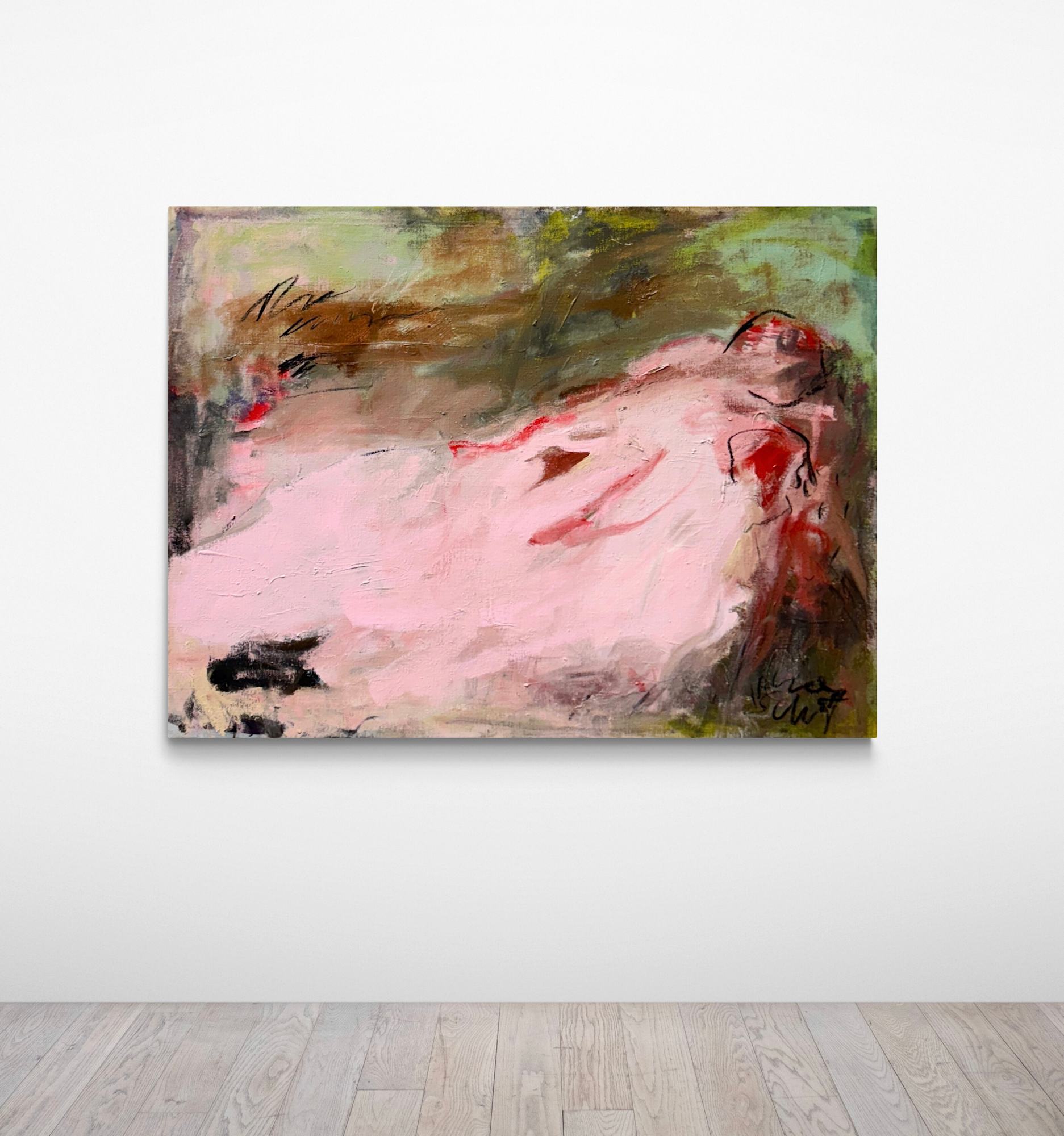 This artwork presents a striking, abstract composition dominated by swirling shades of pink, red, and earthy tones. The expressive brushstrokes and blurred edges create a sense of movement and emotion, inviting viewers to confront the intensity of the scene. The use of vivid pink contrasts with the darker, muddier hues, increasing the tension and complexity within the piece. Figures or forms appear to emerge and dissolve within the chaotic brushwork, enhancing the feeling of transition and fluidity. The artist’s bold technique and daring color choices make the painting both enigmatic and mesmerizing, drawing the eye and provoking introspection. This artwork stands out for its raw energy and the emotive power conveyed through its dynamic composition and texture.