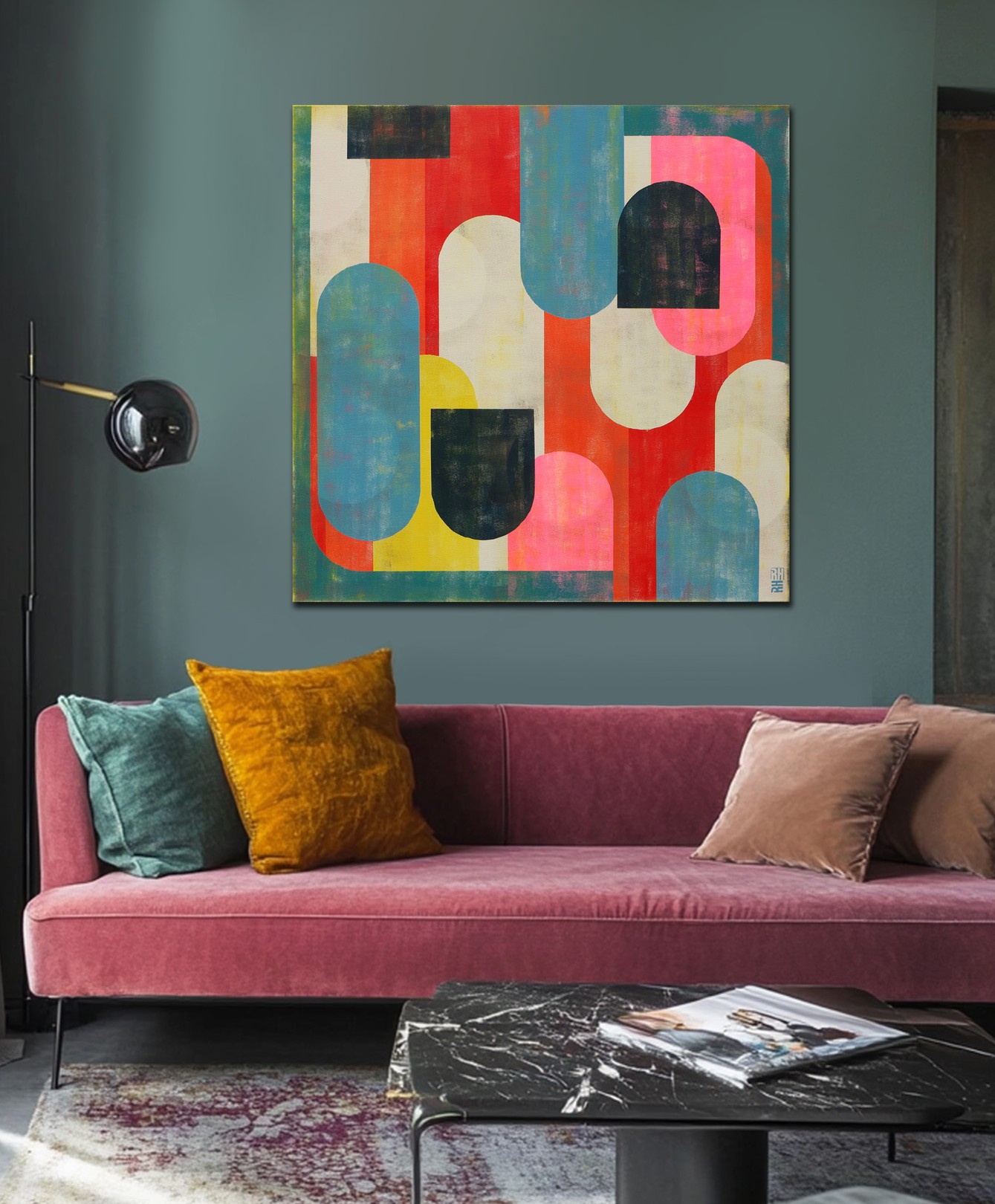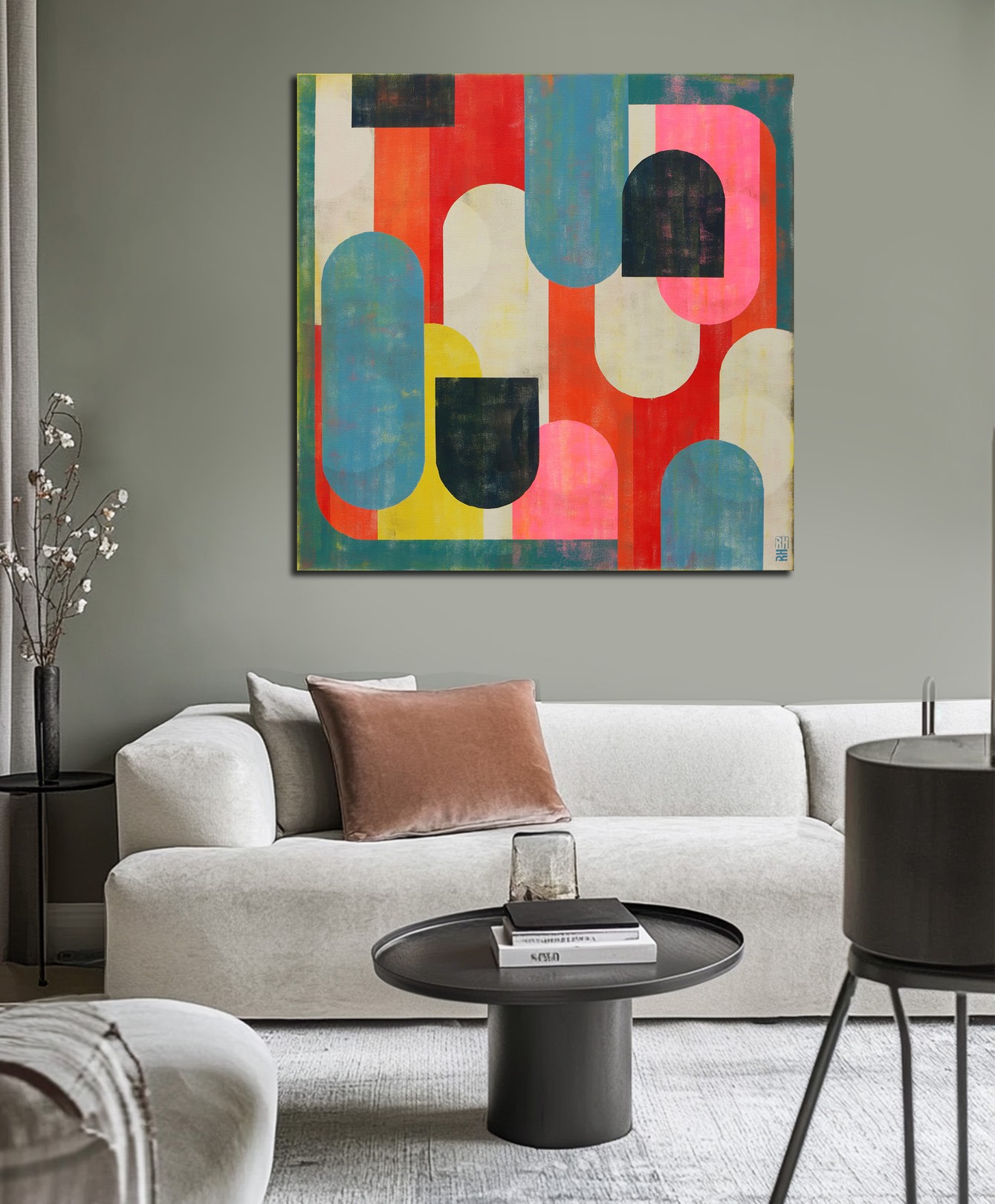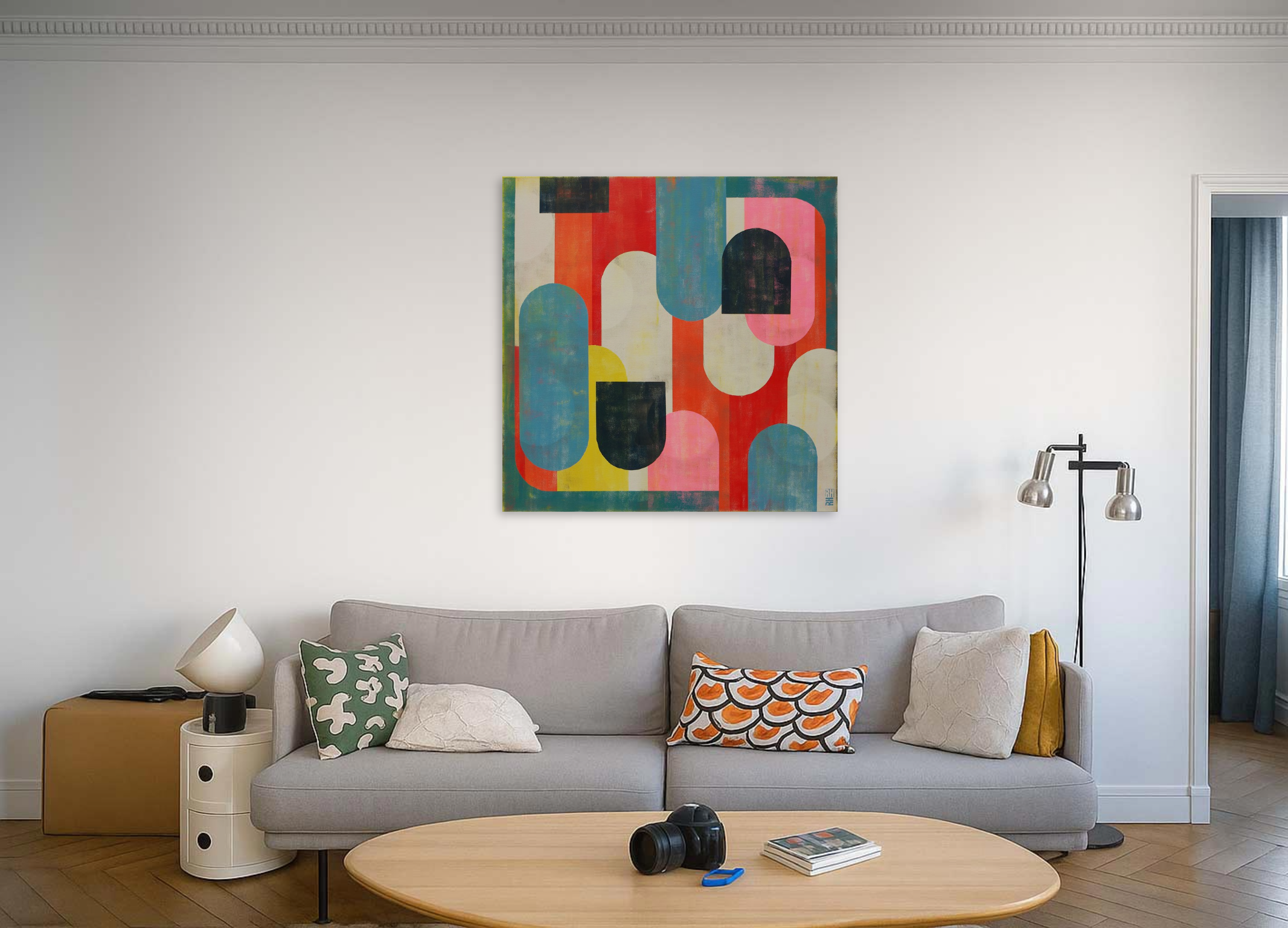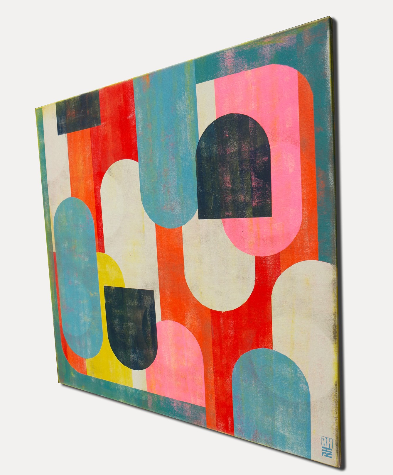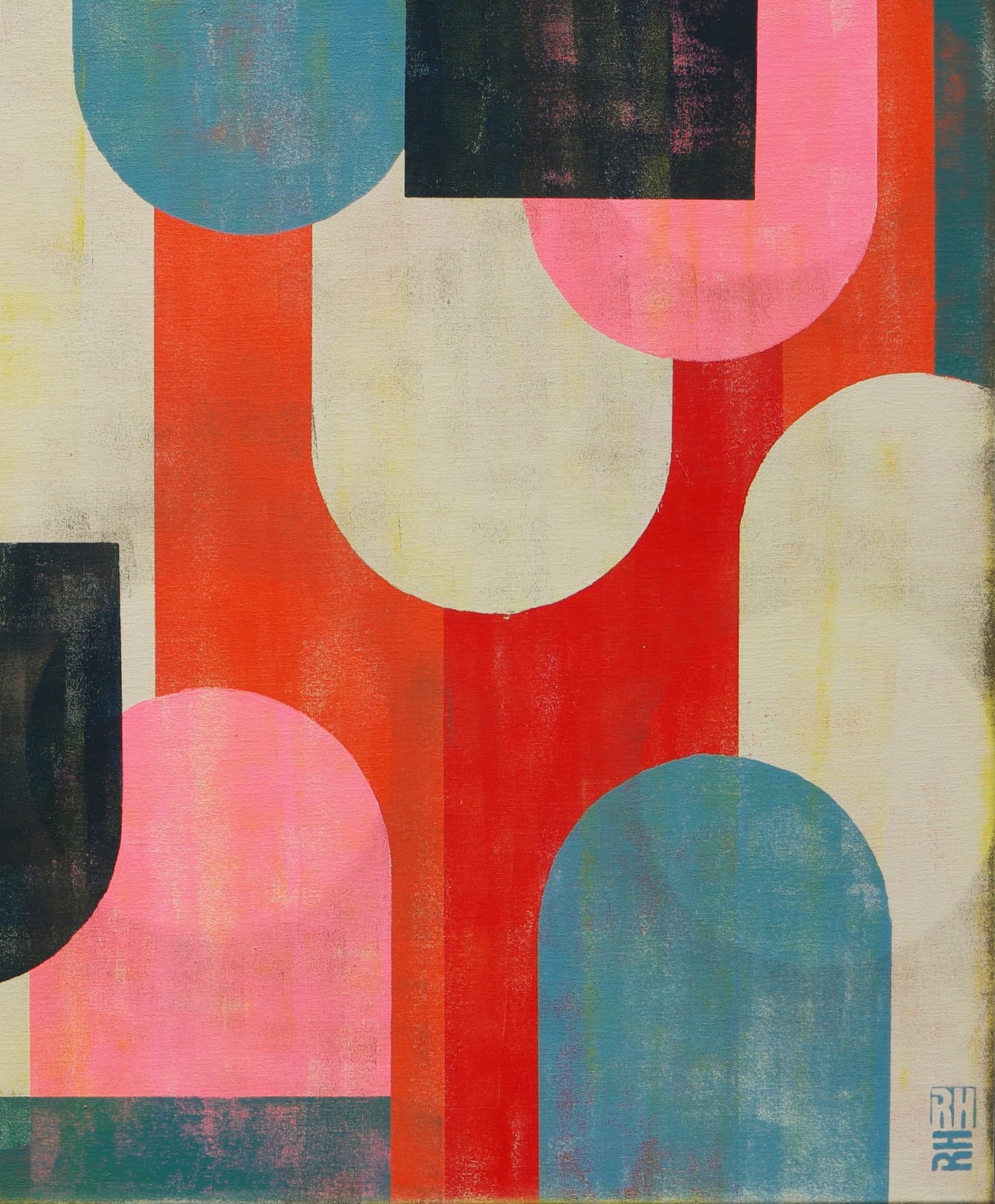 This artwork is a vibrant composition of geometric shapes, masterfully balancing color and form. Predominantly featuring arches and semi-circles, the design achieves a harmonious rhythm through its repetition of shapes. The palette is a striking blend of warm reds, soft pinks, deep blacks, and sunny yellows, contrasted with cooler blues and greens. This contrast enhances the dimensionality and depth of the piece. The artist’s use of overlapping shapes creates an intriguing interplay of foreground and background, adding complexity to the seemingly simple forms. The textured surface suggests a blend of modern abstraction with a nod to mid-century aesthetics. This work is a captivating exploration of form, color, and texture, inviting viewers to engage with its dynamic energy and varied visual layers.
