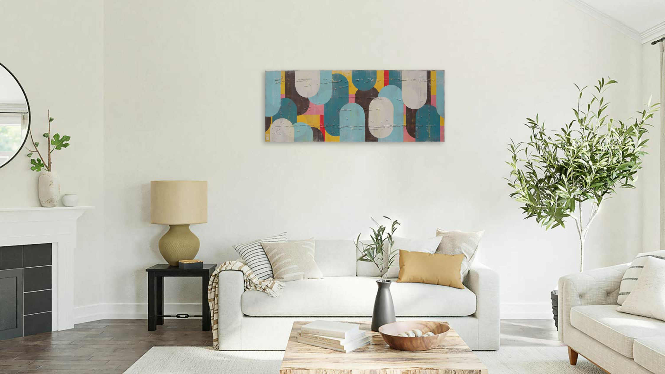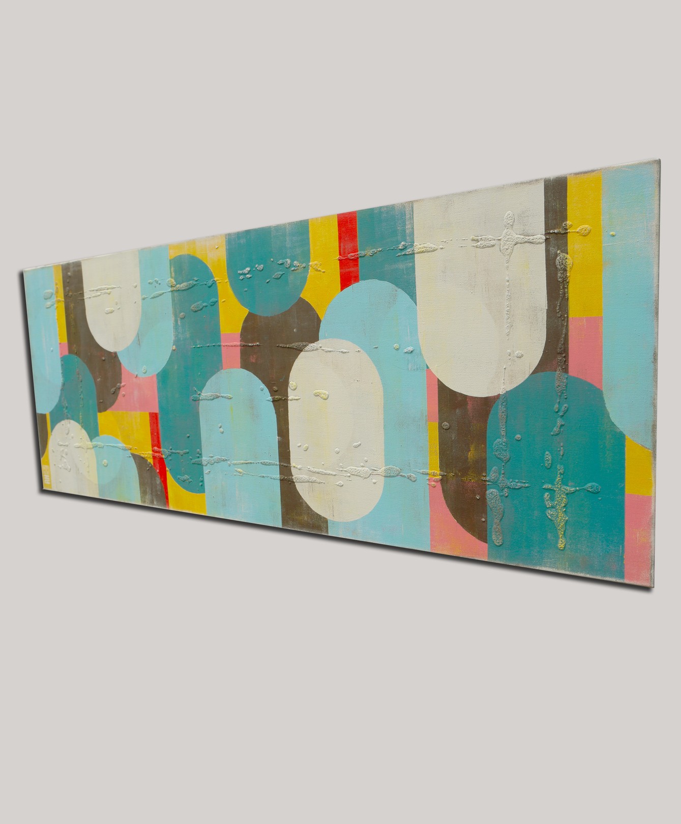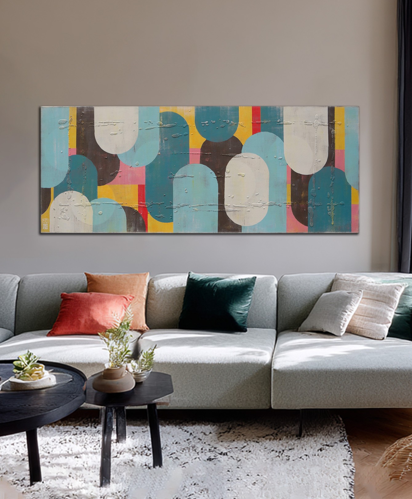 This abstract artwork is a vibrant tapestry of geometric forms, primarily featuring elongated ovals interspersed with rectangles. Dominated by a palette of blues, yellows, and earthy tones, the composition creates a rhythmic visual flow. The artist skillfully balances bold, saturated colors with muted shades, generating a dynamic contrast. Subtle textures embedded within the forms evoke a sense of depth and movement. The juxtaposition of curved and straight lines injects energy into the piece, while strategic layering adds complexity. This artwork stands out for its harmonious interplay of color and shape, embodying a modern aesthetic with a nod to mid-century design principles. Its captivating visual arrangement invites viewers to explore the rich tapestry of forms and hues, reflecting both chaos and order in equal measure.