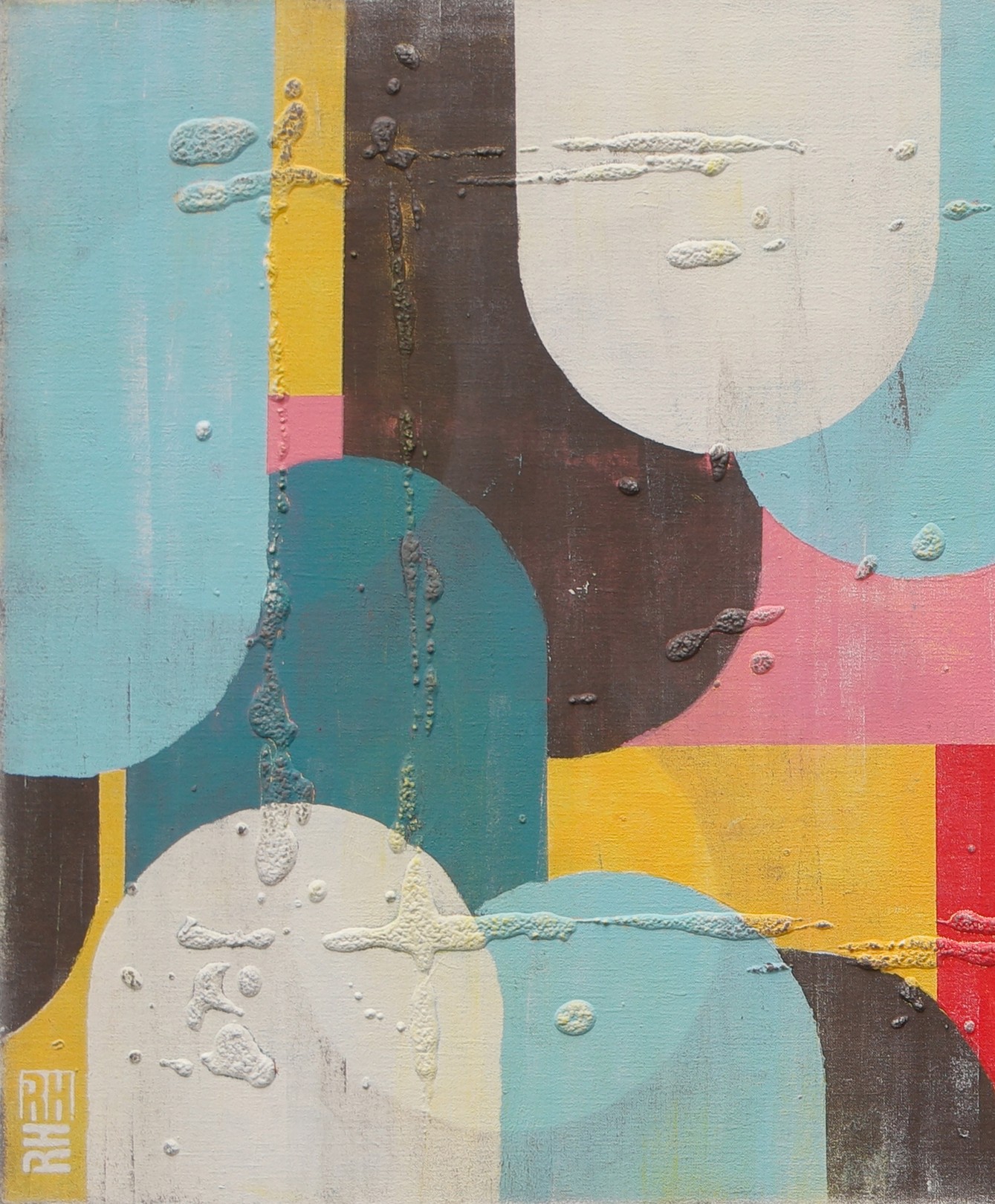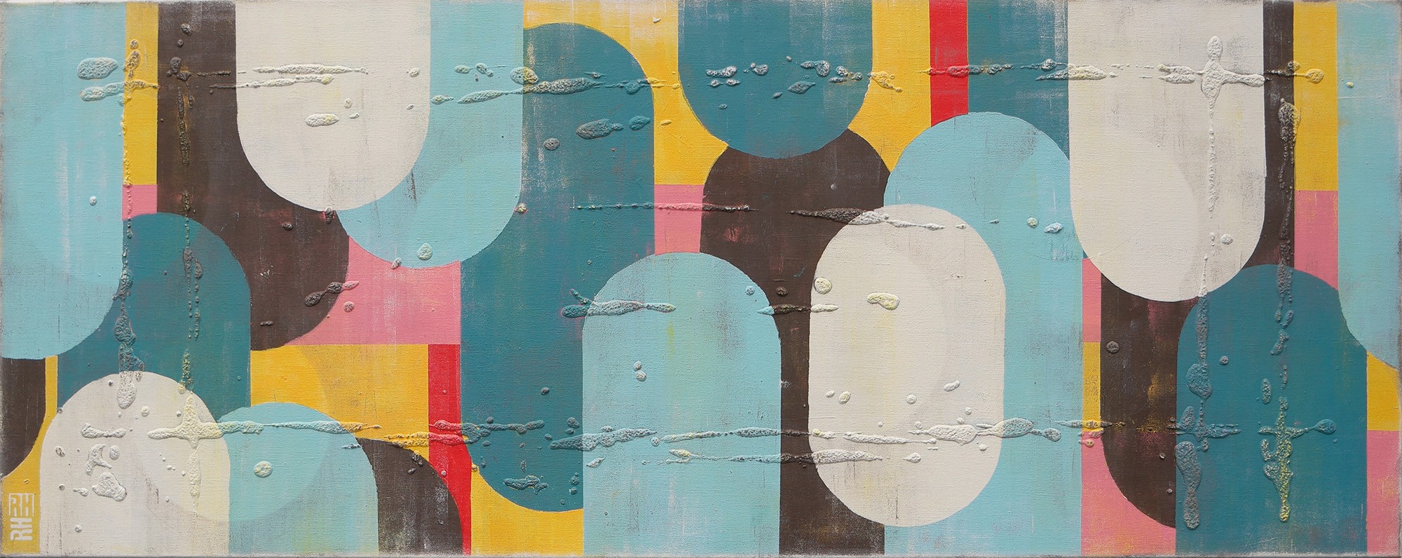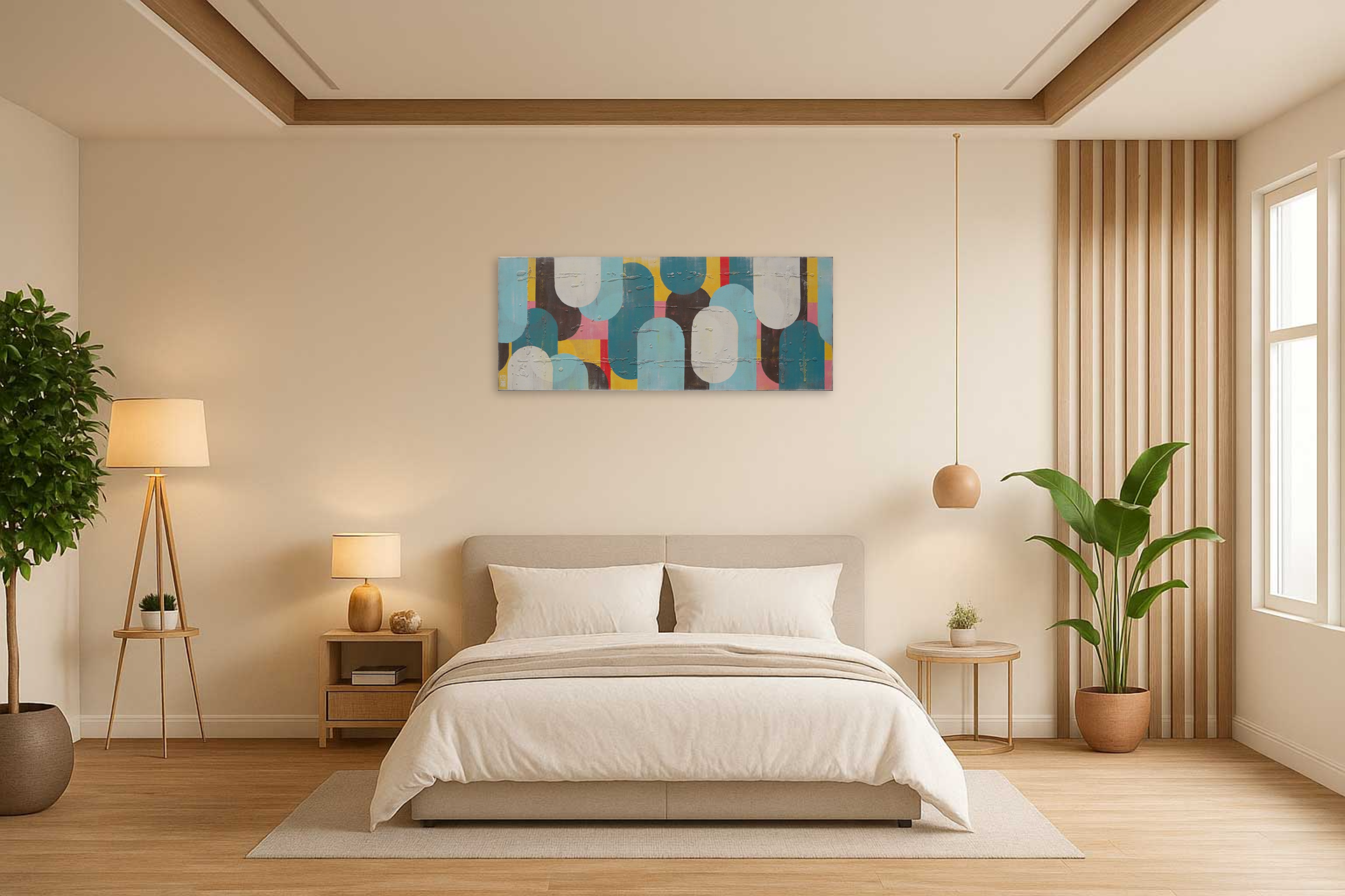 This abstract artwork is a vibrant tapestry of geometric forms, primarily featuring elongated ovals interspersed with rectangles. Dominated by a palette of blues, yellows, and earthy tones, the composition creates a rhythmic visual flow. The artist skillfully balances bold, saturated colors with muted shades, generating a dynamic contrast. Subtle textures embedded within the forms evoke a sense of depth and movement. The juxtaposition of curved and straight lines injects energy into the piece, while strategic layering adds complexity. This artwork stands out for its harmonious interplay of color and shape, embodying a modern aesthetic with a nod to mid-century design principles. Its captivating visual arrangement invites viewers to explore the rich tapestry of forms and hues, reflecting both chaos and order in equal measure.