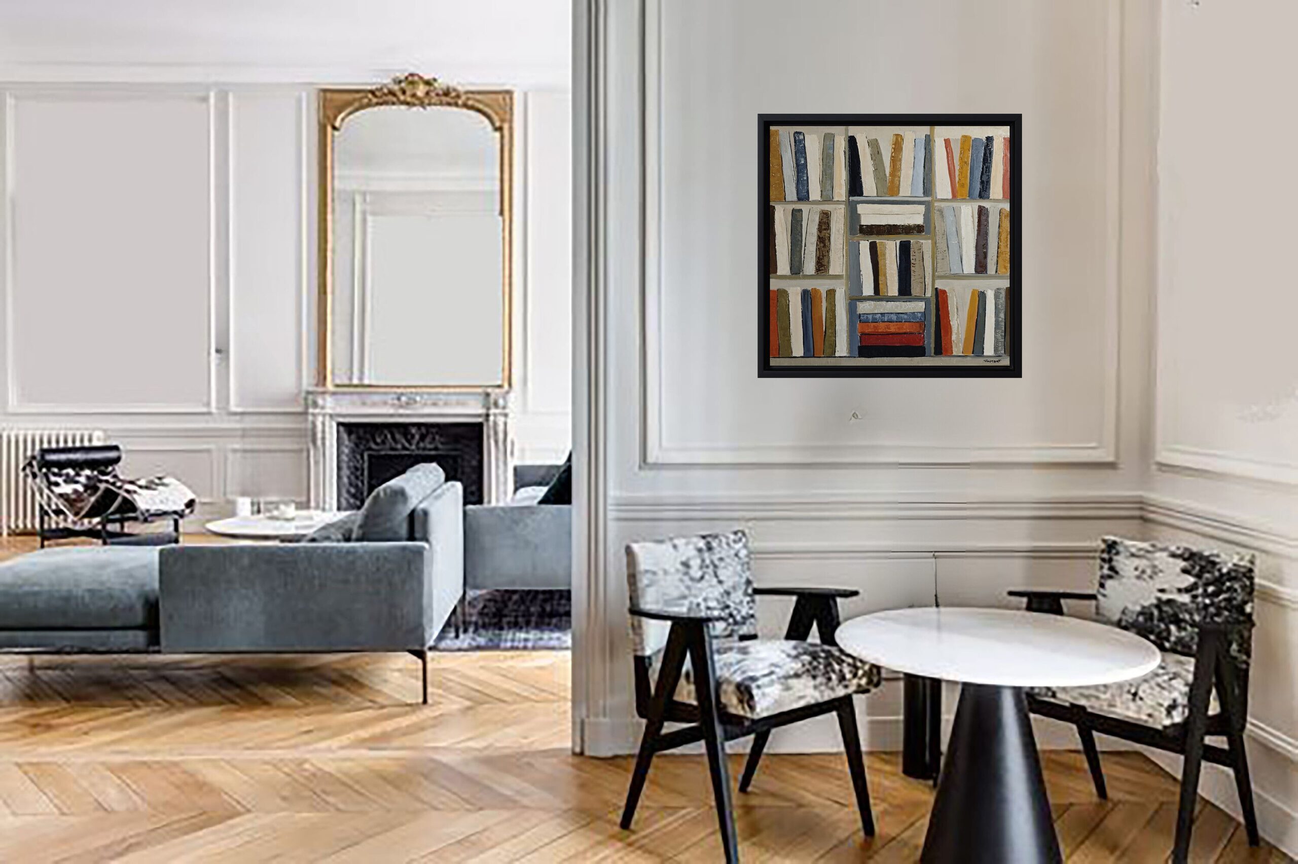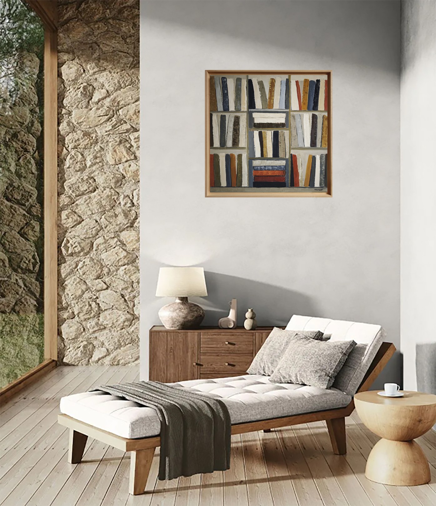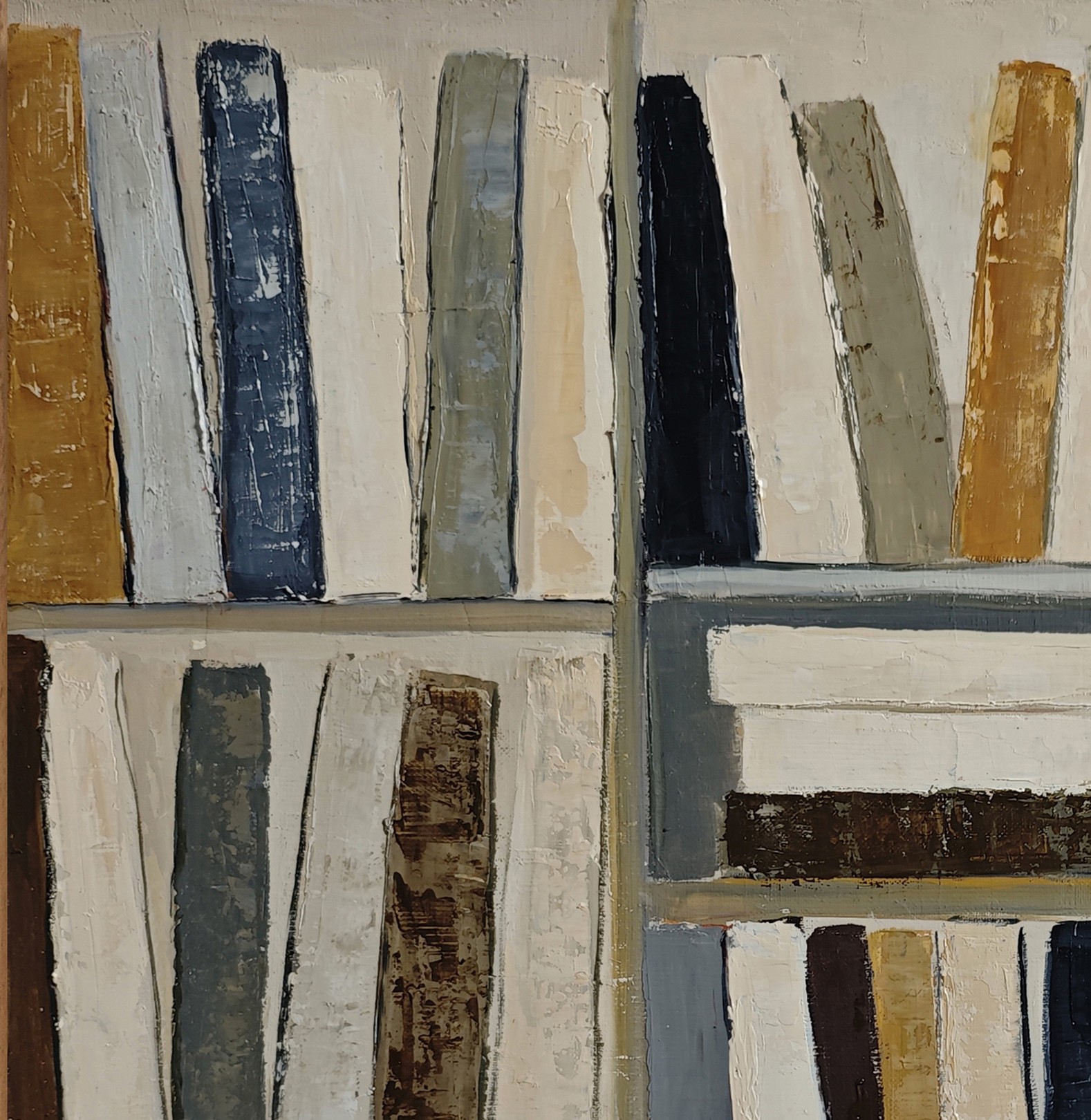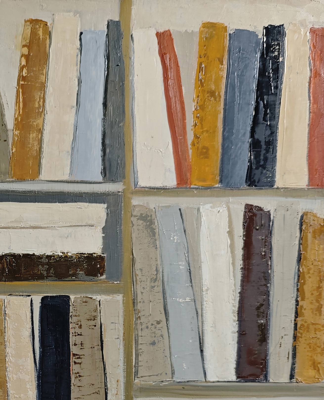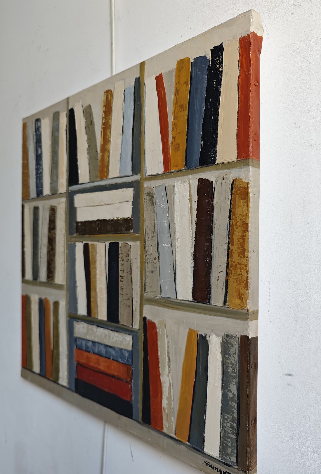With Reading Patterns, Sophie Dumont offers an abstract interpretation of the library, conceived as a structured mental space. The vertical lines evoke the spines of books, while the grid composition suggests order and repetition without ever becoming mere illustration.
