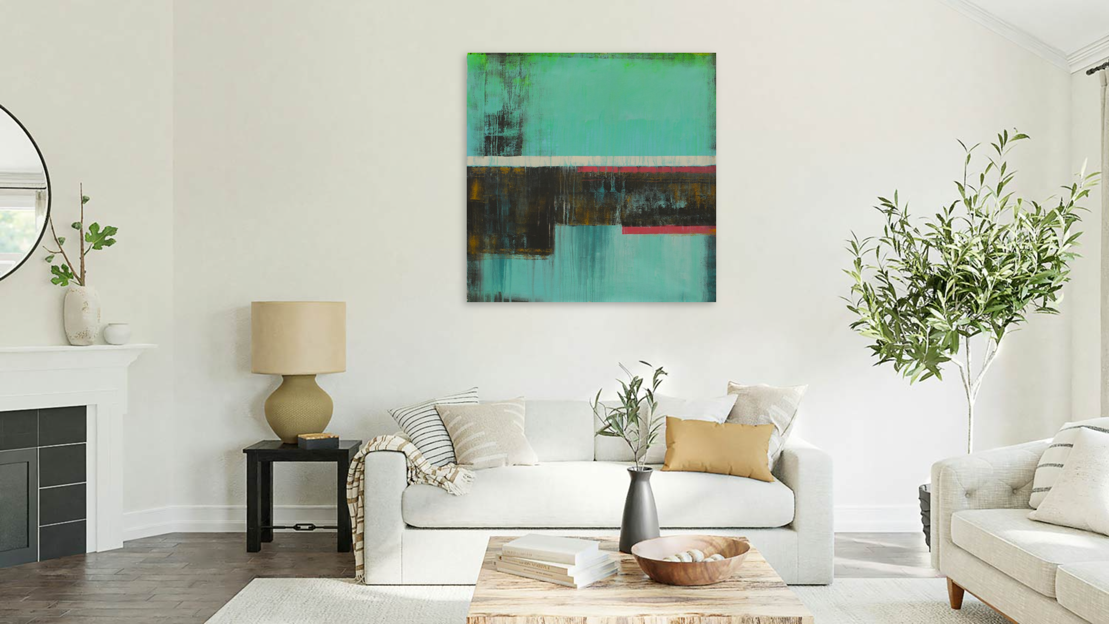 This abstract artwork features a striking composition of geometric shapes and bold colors that captivates with its dynamic simplicity. A dominant turquoise field serves as the backdrop, instilling a sense of calm and openness. Cutting horizontally across the canvas is a bold, black band that adds depth and contrasts starkly with the background. Above this black expanse is a thin, white stripe that offers a layer of separation and balance. Near the bottom, a subtle red strip introduces a hint of vibrancy, drawing the viewer’s eye with its unexpected warmth. The juxtaposition of these elements creates a visually compelling tension, evoking a sense of movement. Textured layers and drips suggest an exploration of depth, inviting contemplation and leaving a lasting impression on the observer. The artwork embodies a harmonious blend of simplicity and complexity, making it a sophisticated piece that stands out in the realm of abstract expressionism.