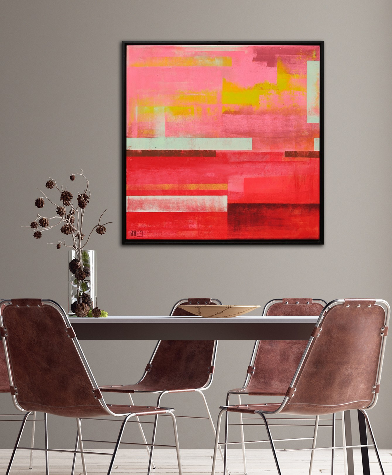 This artwork is an electrifying abstract expression of color and form. Dominated by vibrant hues of pink, red, and yellow, the composition features a series of overlapping rectangles and bars, creating a dynamic sense of movement and depth. The warm colors are interspersed with cooler whites and rich browns, adding a striking contrast that energizes the canvas. The texture is both smooth and layered, suggesting a deliberate yet spontaneous application of paint. The harmonious blend of geometric precision and abstract fluidity invites viewers to explore the emotional and visual intensity of the piece. Its captivating use of color and form makes it a standout example of modern abstract art, enticing viewers to immerse themselves in its bold and vivid world.